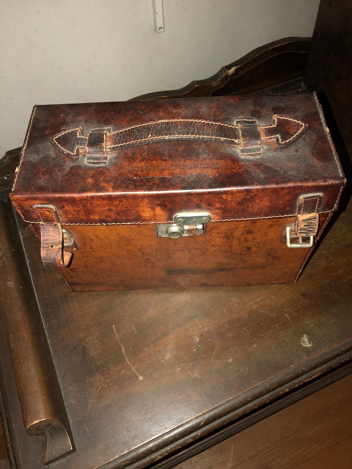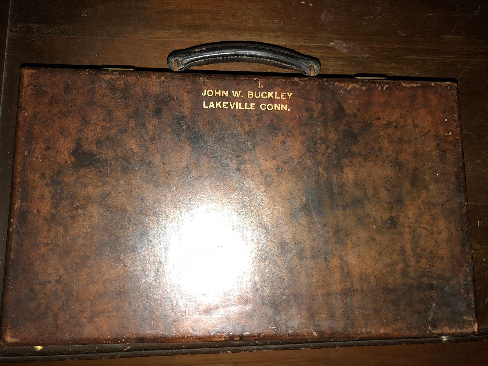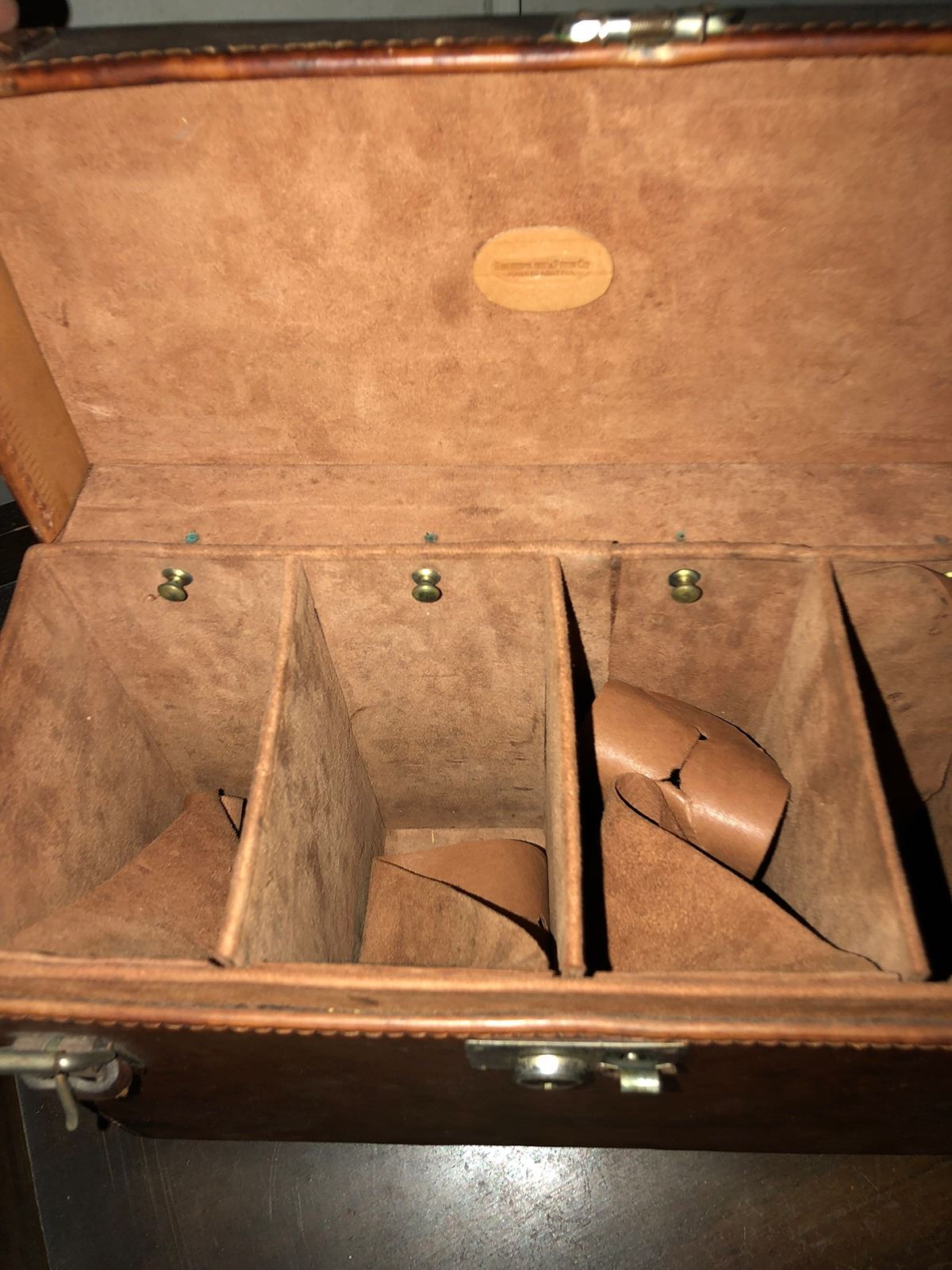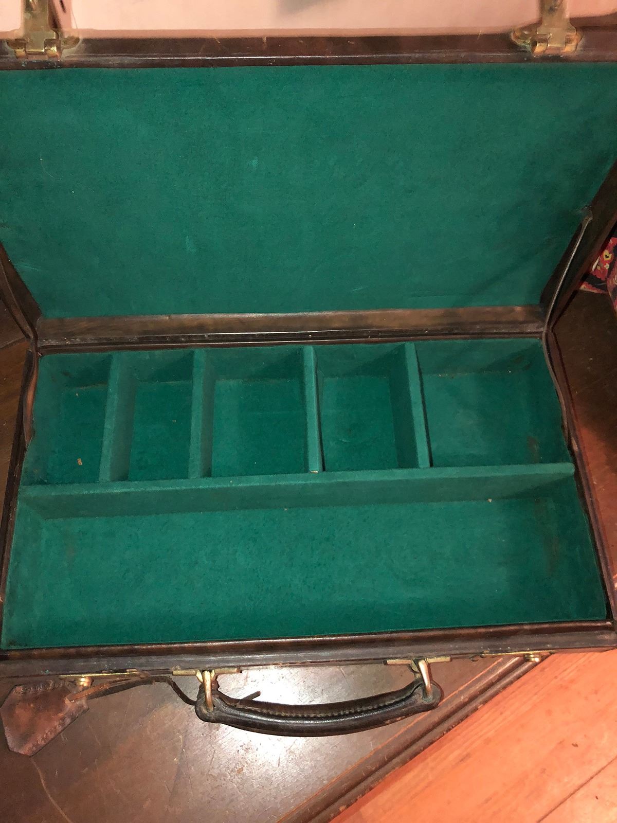 Case with green felt, used for fishing reels, Abercrombie and Fitch Co. case, Dr.'s leather bag. (RL)