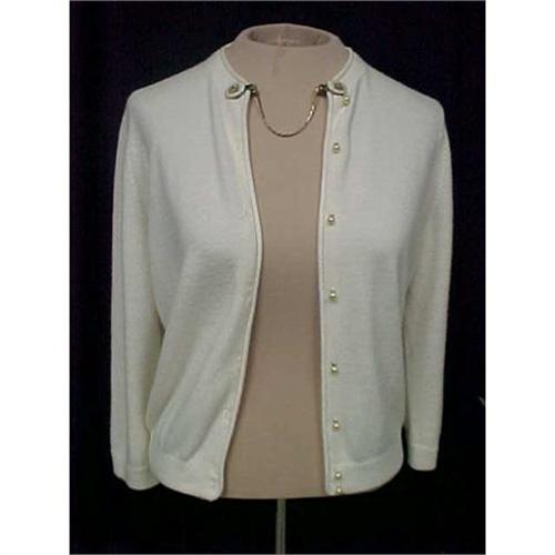 Vintage Cashmere Cardigan and Sweater Guard- Sweater is a cream color size 2/4 with some slight yellow stains on the sleeves. It features 7 pearl-like buttons down the front. In addition to the cardigan is a gold chain sweater guard that is decorated with painted scenes of Victorian couples. It measures approximately 8" in length and is in excellent condition! Beautiful set for a vintage appreciator!