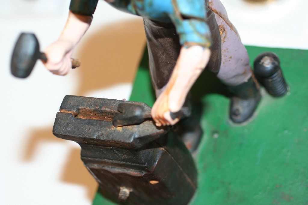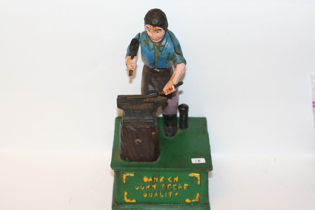 This lot is a vintage cast iron mechanical bank; "bank on john deere quality"