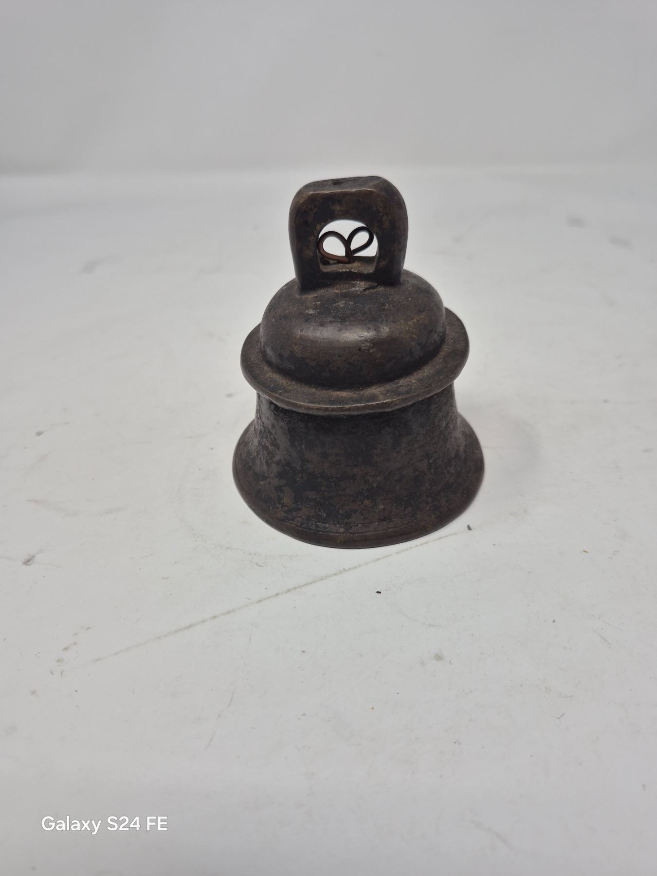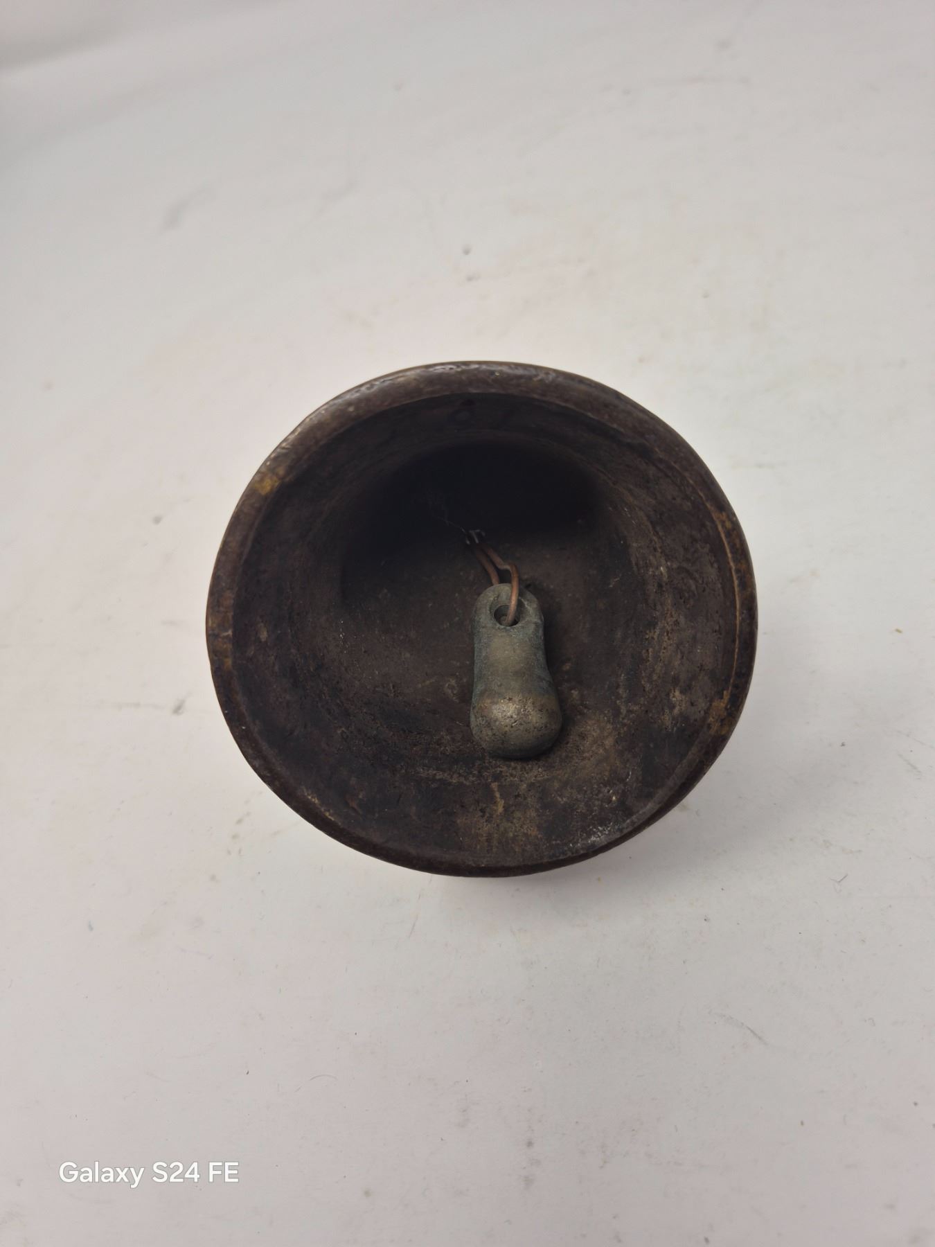 Rustic antique cast iron bell with clapper, aged patina and great tone.
