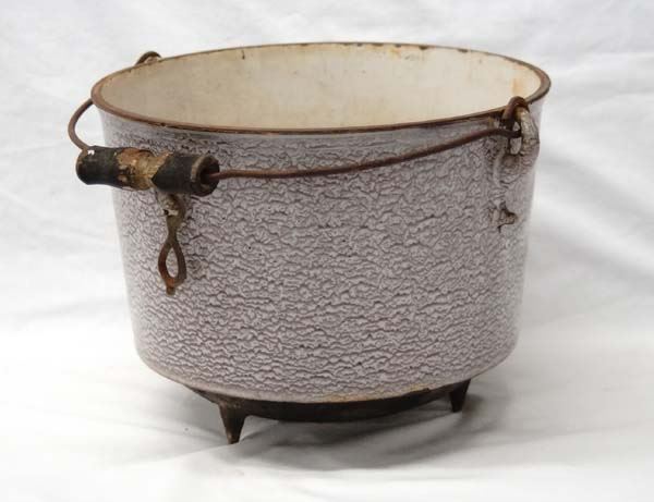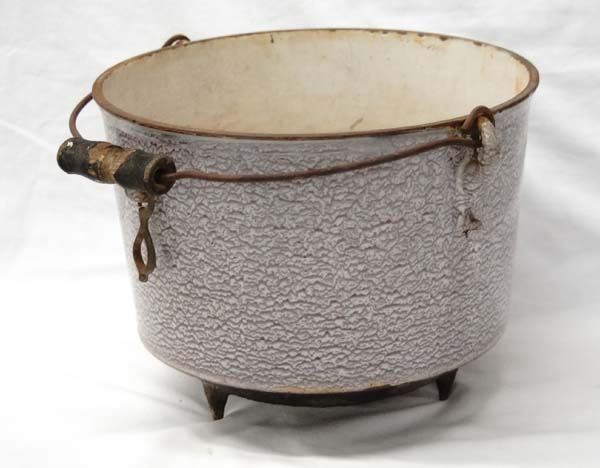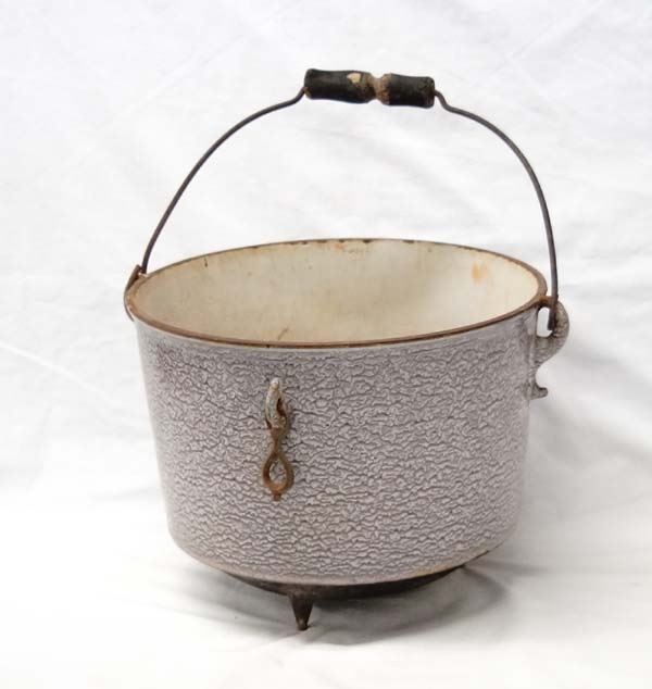 Vintage Cast Iron Gray Enamelware Pot, tri-legged, white enamelware inside, bail handle, has rust inside of bottom, measures 8'' x 10.5''