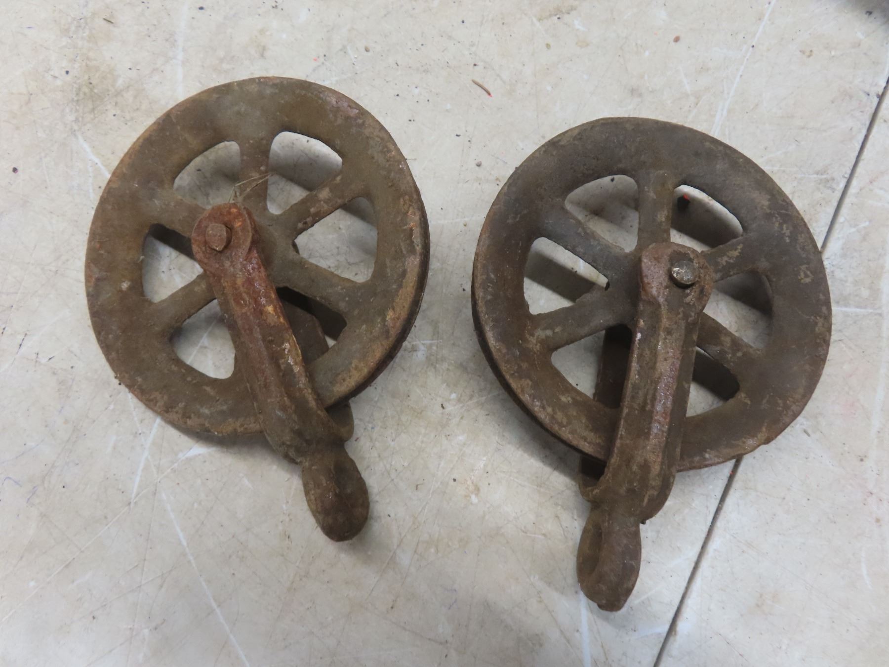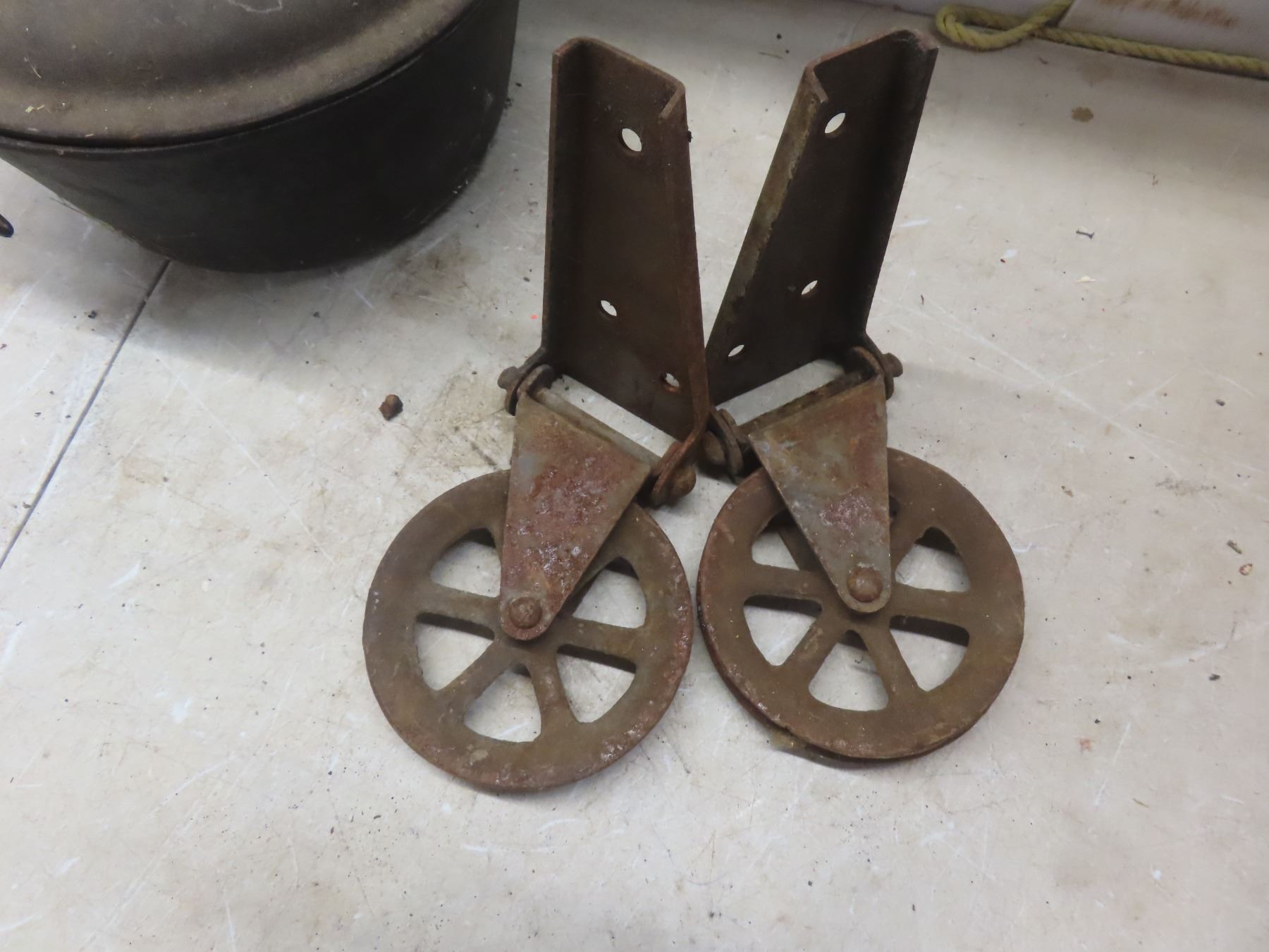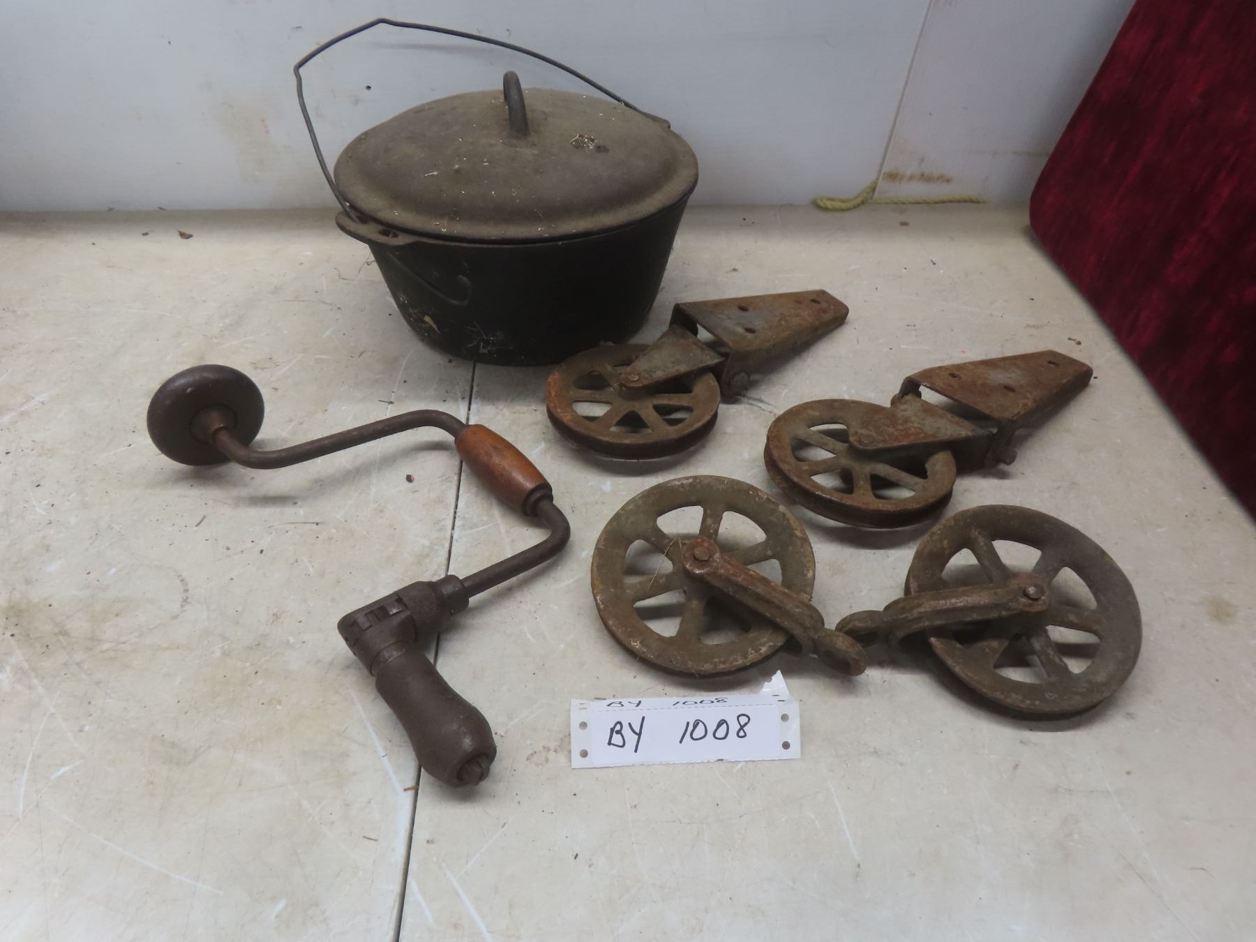 Vintage Cast-Iron Pot with Lid; Pulleys; and Manual Hand Drill.