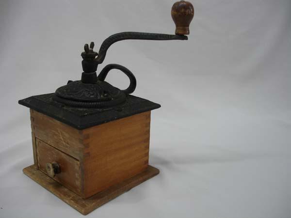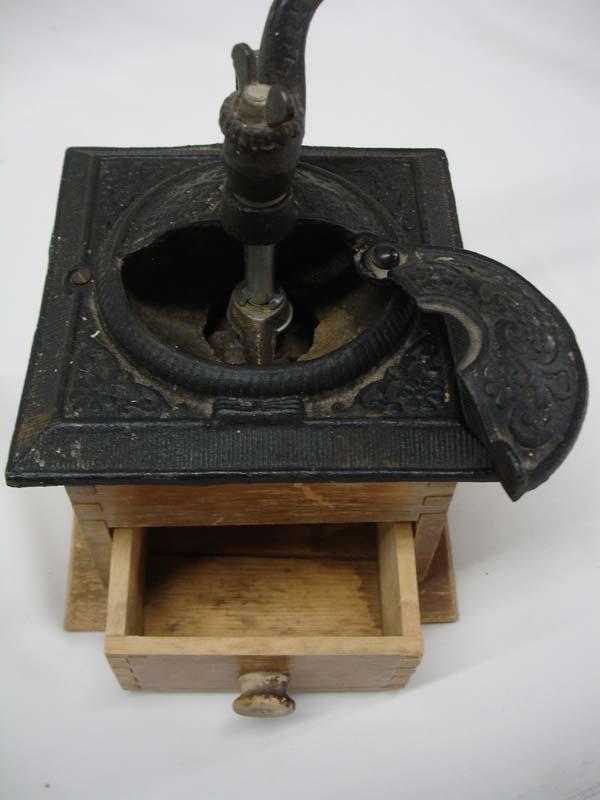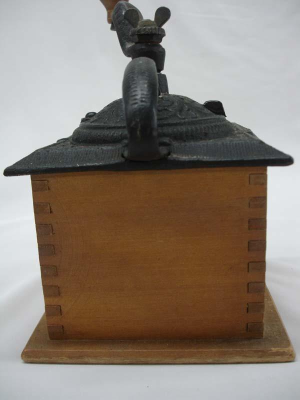 Vintage Cast Iron Top Coffee Grinder, box is dovetailed construction. 10'' T x 4.75'' x 5.5''. Buyers Pay Actual Shipping and Handling Charges(see terms and conditions for more information).