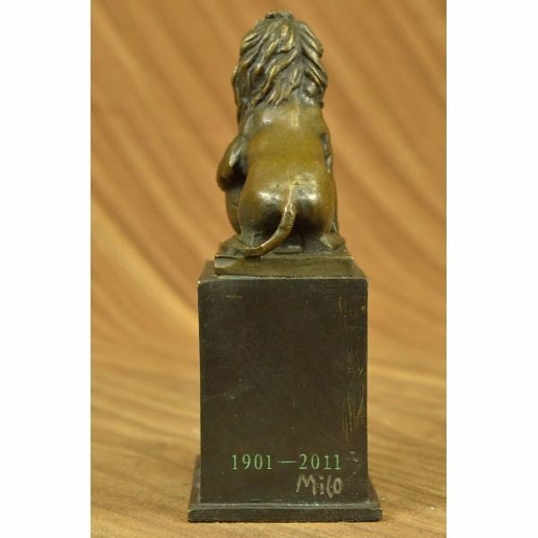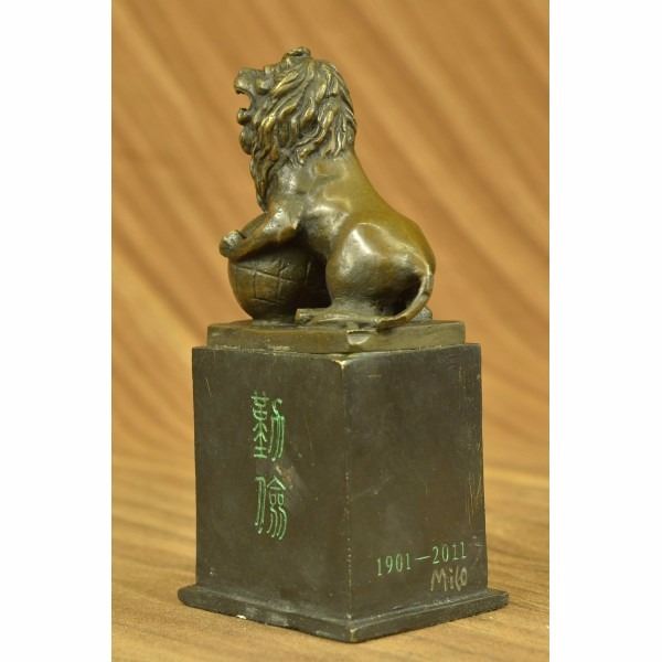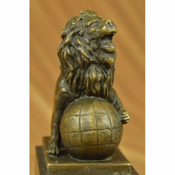 Old lion with the paw on the ball. Bronze cat figurine, lion sculpture, cast using the traditional lost wax process and hand finished. This beautiful bronze lion has exceptional detail with a wonderful brown patina. This bronze lion sculpture was produced with a solid casting in bronze and handcrafted to the highest standard. Bronze Dimensions with Marble Base: Height 6 X Width 3 inches. Weight: 3 LBS. Please Note: This is a reproduction bronze sculpture from the original molded and signed. This featured bronze sculpture is a recast after the original, and has been done recently. This 100% bronze sculpture is an abstract piece certain to be a conversation piece.