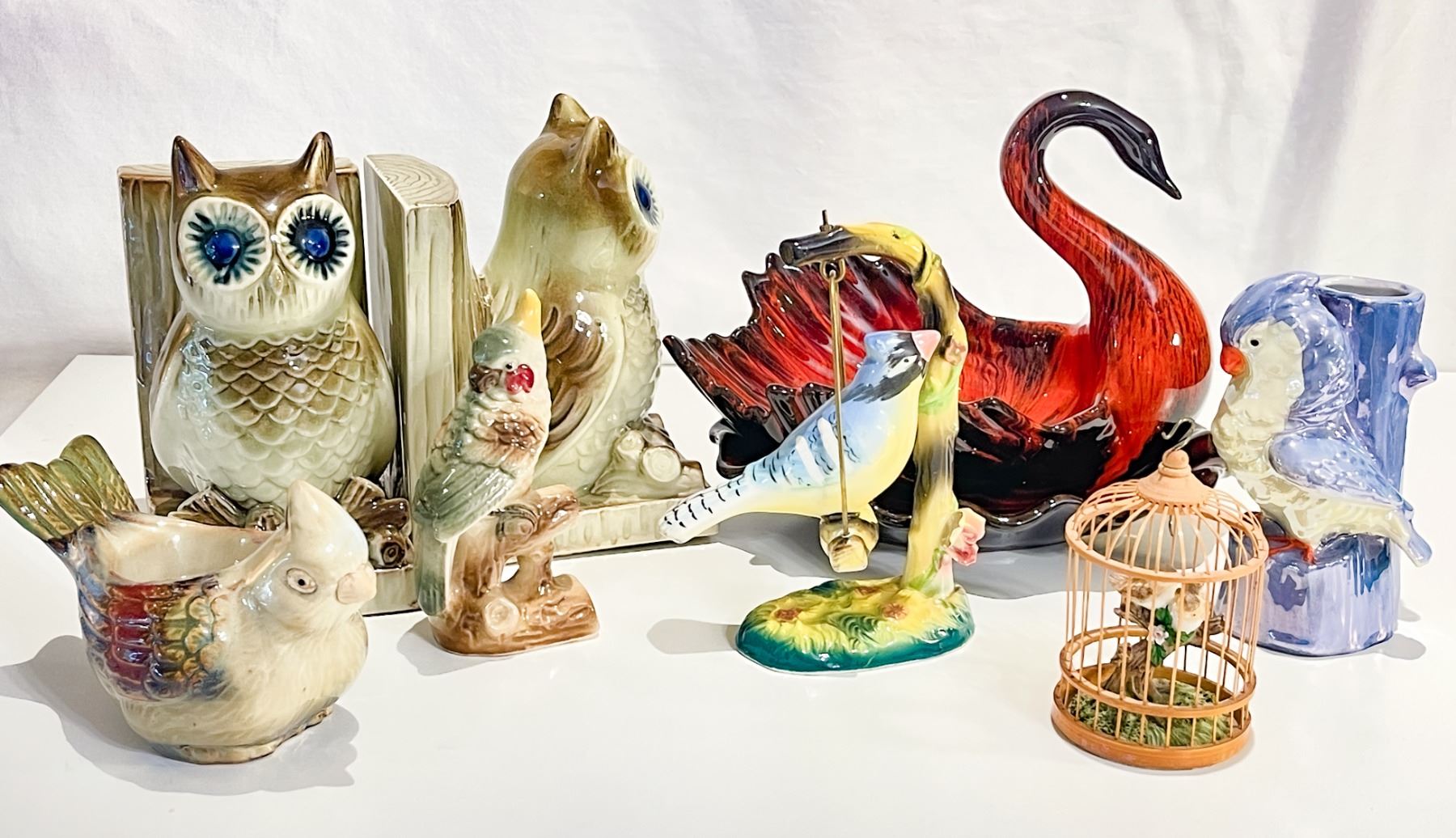 Charming mid century collection bird-themed ceramics and figurines, including owl bookends (Japan), a purple luster cockatiel wall vase (Japan), a hand-painted parrot, an Evangaline Canuck Swan with matching plate, and various colorful bird figures such as a blue jay and small songbirds in a cage.