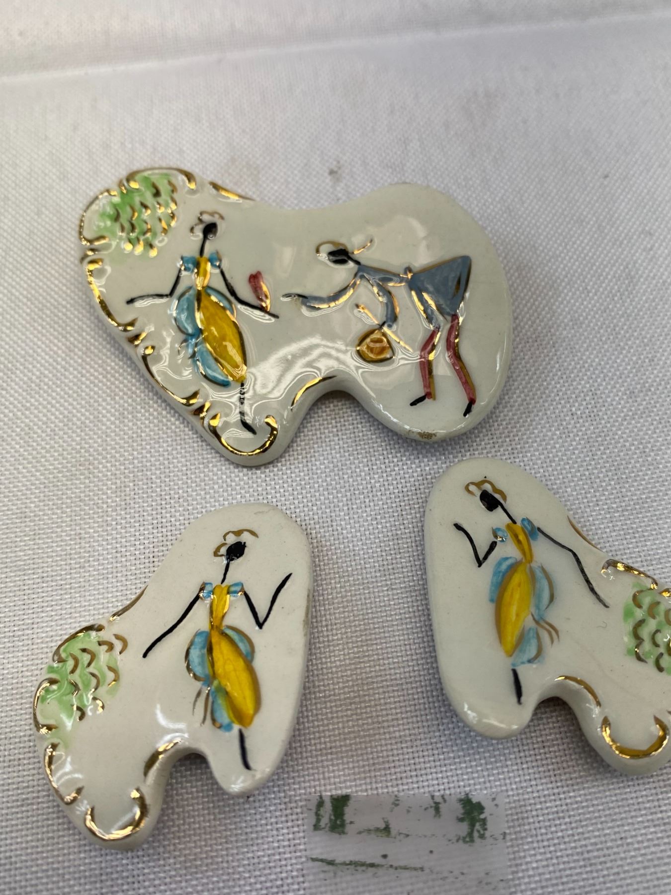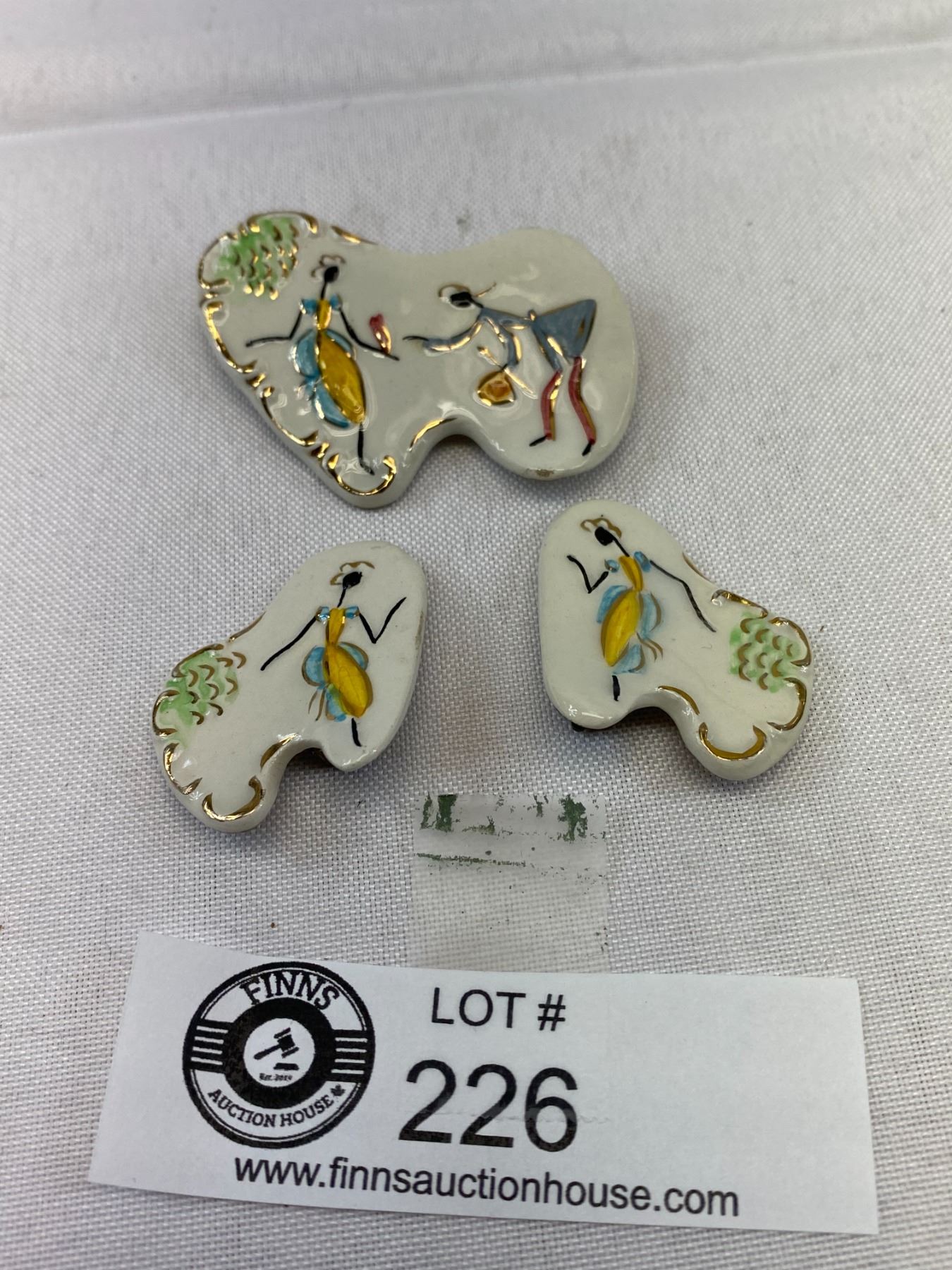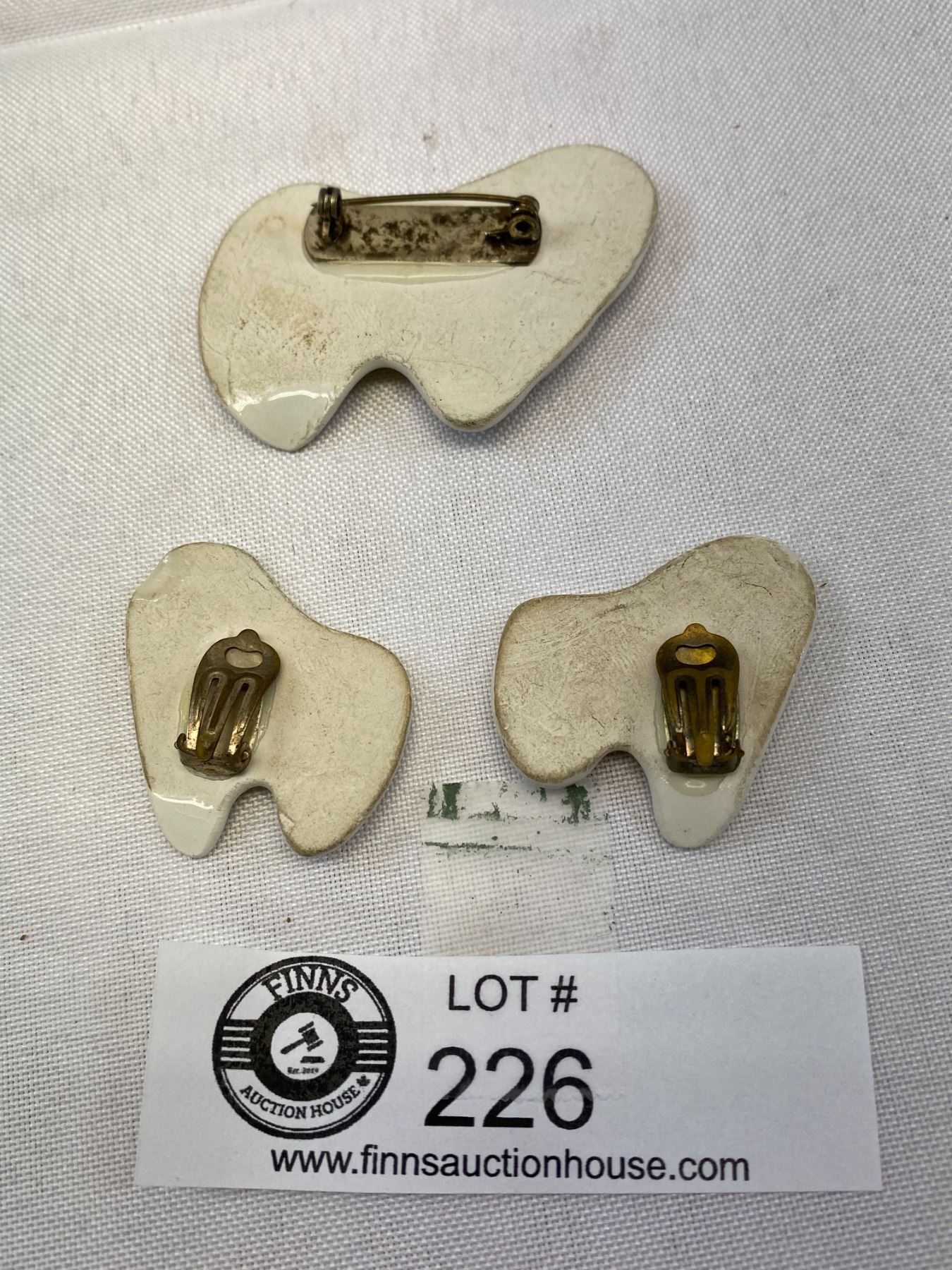 Vintage Ceramic Clip On Earrings And Brooch, Tin Chip On Back Of Earring, Excellent Shape For Their Age