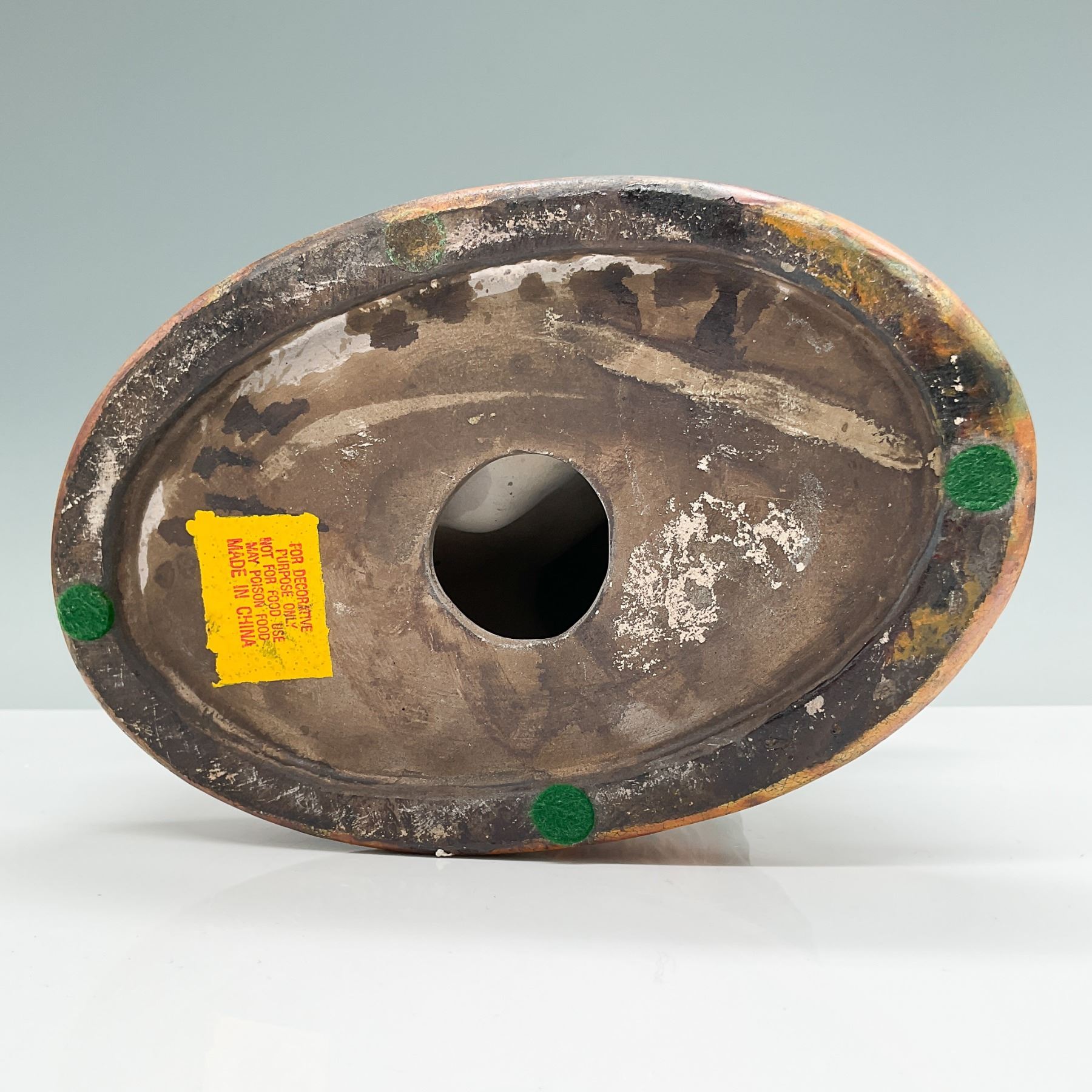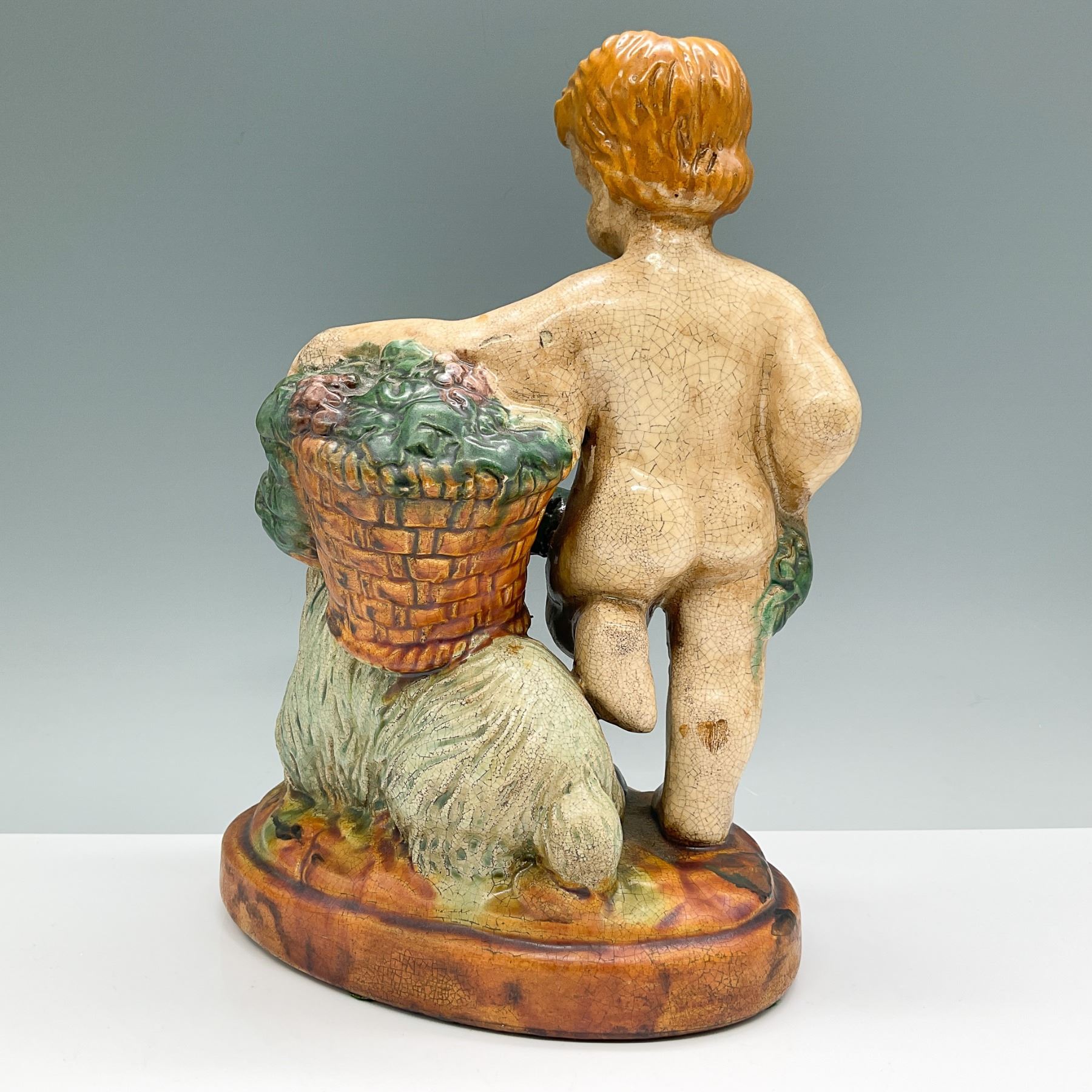 A vintage ceramic figurine depicting a child holding a branch beside a goat carrying a basket. This piece is richly detailed with a hand-painted crackle glaze finish and measures 11.75"H. Features an oval base with a 'Made in China' sticker. A charming collectible for vintage ceramic enthusiasts.