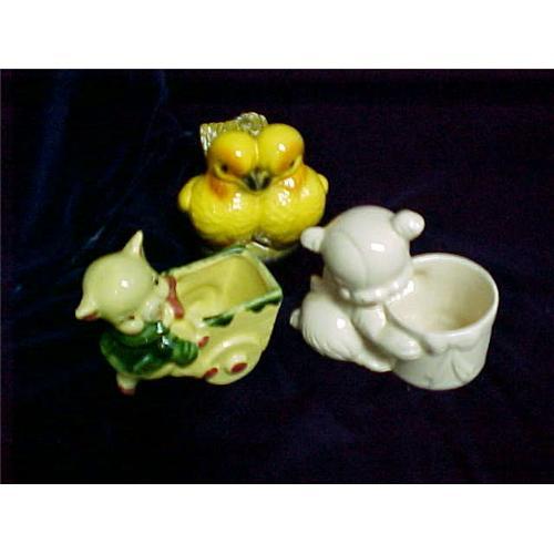Vintage Ceramic Planters, Piggy, Kitty and Lovebirds! Tallest and newest are the lovebirds at 5.5", kitten and piggy are 5" high. These are probably from the 50's. Piggy is maybe Shawnee. None of them are signed. All in pretty nice condition!