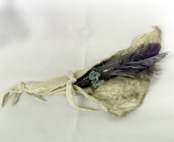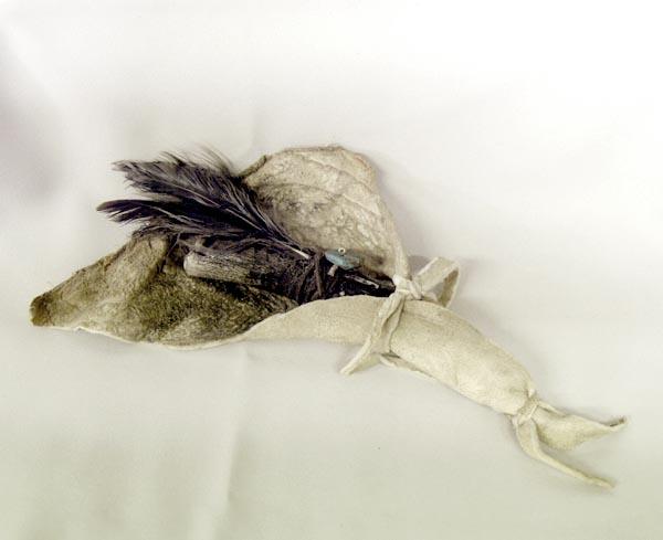 Vintage Ceremonial Stone Fetish Bundle. In pouch, pouch measures approx. 9.75'' x 3''. Fetish measures approx. 8.5'' x 1''. Stones measure approx. .75'' x 3/8''. SHI $20.