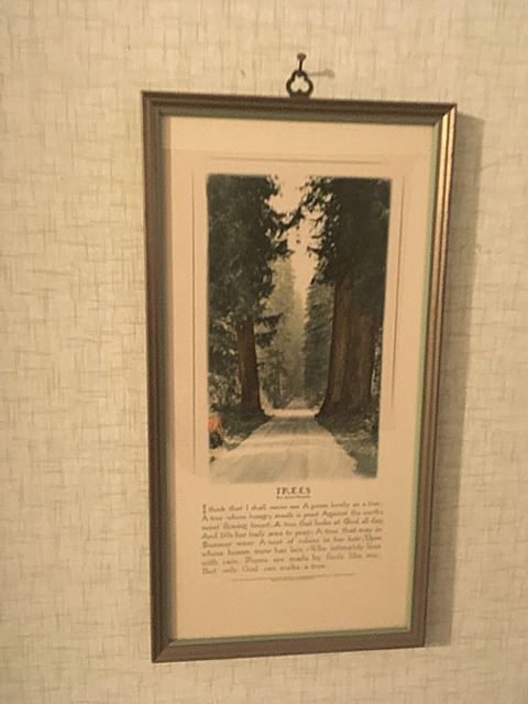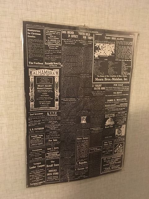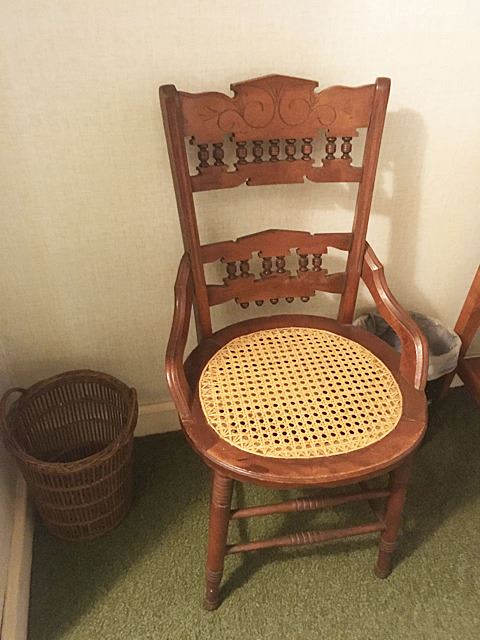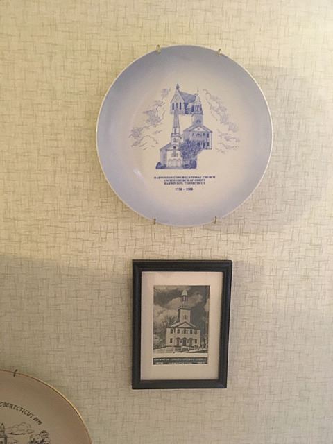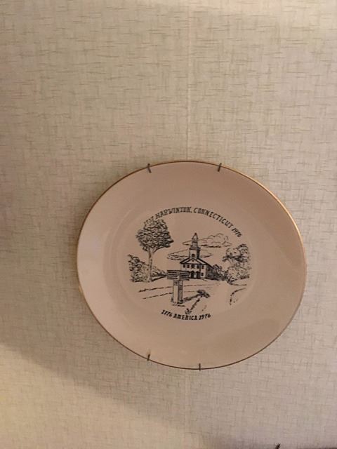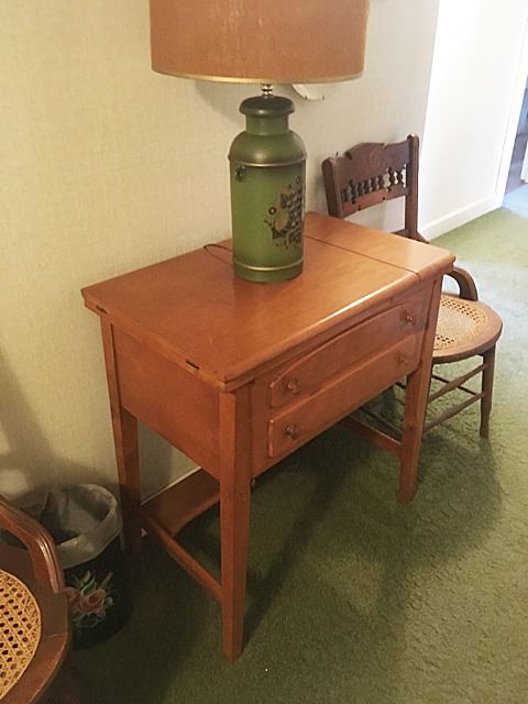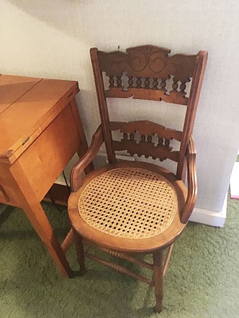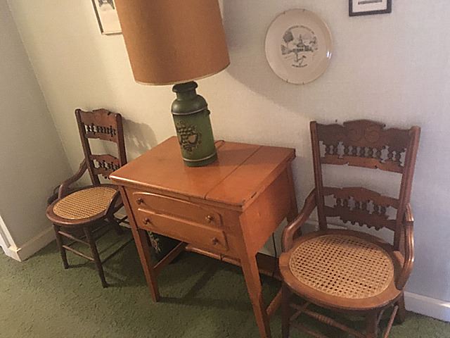 2 nice carved oak chairs with cained seats, vintage sewing machine table, milk can lamp, vintage advertising poster, wicker basket, vintage lithograph, Harwinton, CT collector's plates, and photograph, all from the farm.