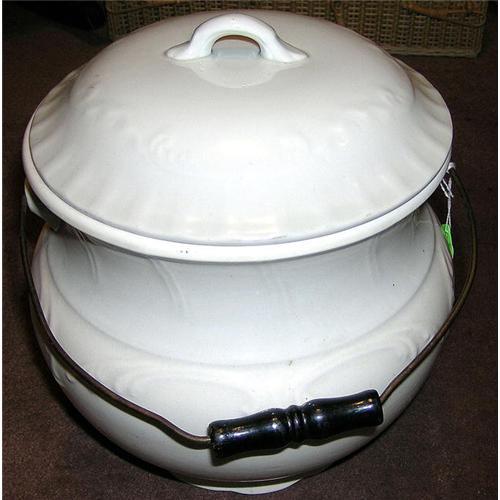 <table width="100%" border="0" cellspacing="0" cellpadding="4"><tr><td><em> This Beautiful Vintage Original Chamber pot EXCELLENT find in such GREAT condition with the lid...additonal photos available on request.</em></td></tr><tr> <td width="100%"> This item is white semi porcelain in fine condition for age. The original chamber pot lid has managed to remain with the pot all these years. The pot handle as can be seen in photos is metal that goes from side to side with a black wooden center handle is in excellent condition.
