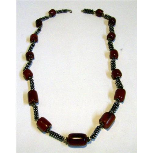 This 27" cherry amber red colored bakelite necklace is made of 15 barrel shaped beads capped on each end with round filagree balls which are attached to coiled spring rondells in one inch segments. The beads themselves range in size from 7/8" to 3/8". The bakelite has been tested with Simacrome, and is actually a brownish brick red, with dark brown or black bands at widely interspersed intervals. This sale will benefit our local Hospice. They have a booth here in our mall where they sell the nicer things that people donate. Be sure to visit our GoAntiques site to see the other items we have for sale on behalf of this beloved charity.