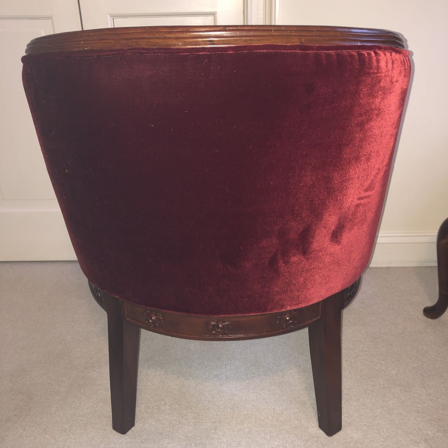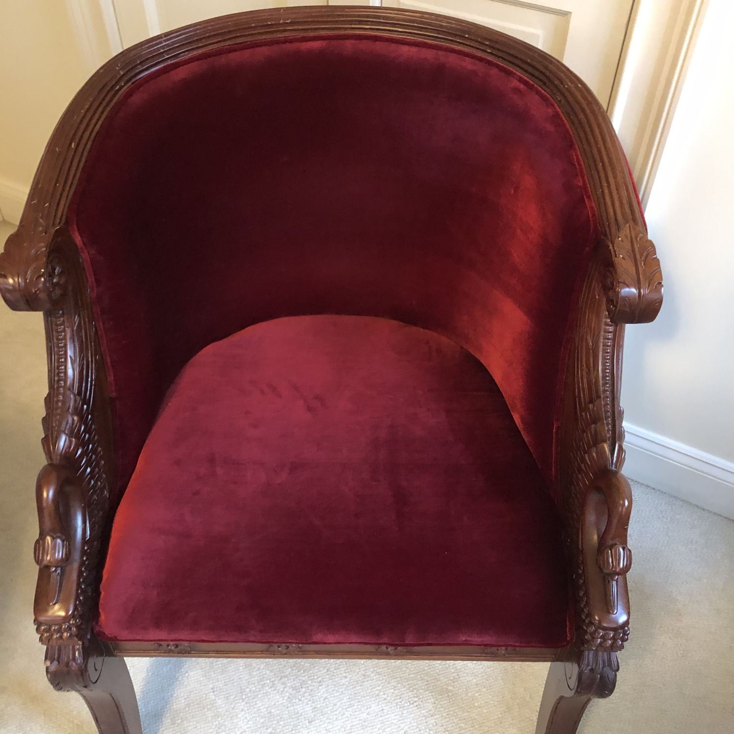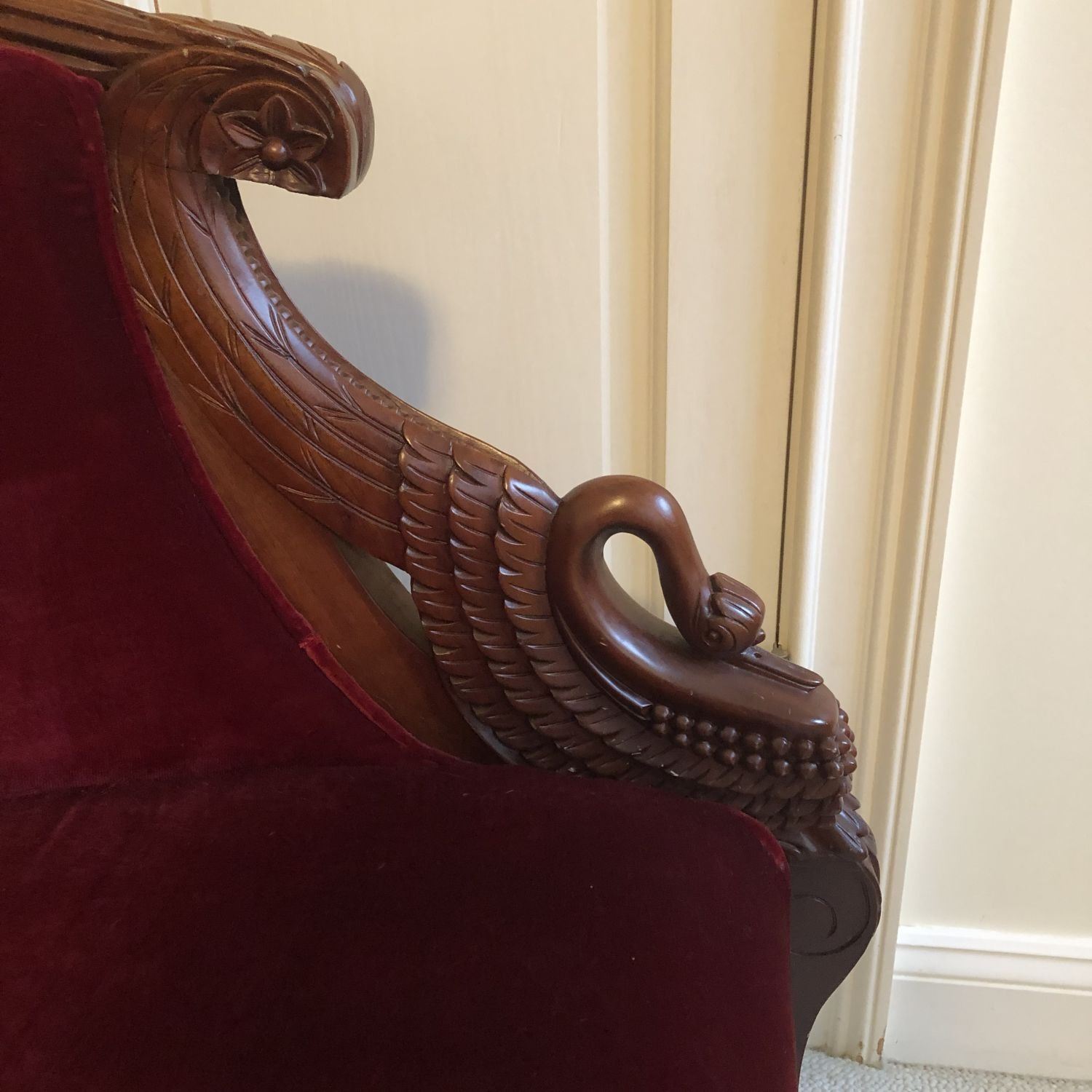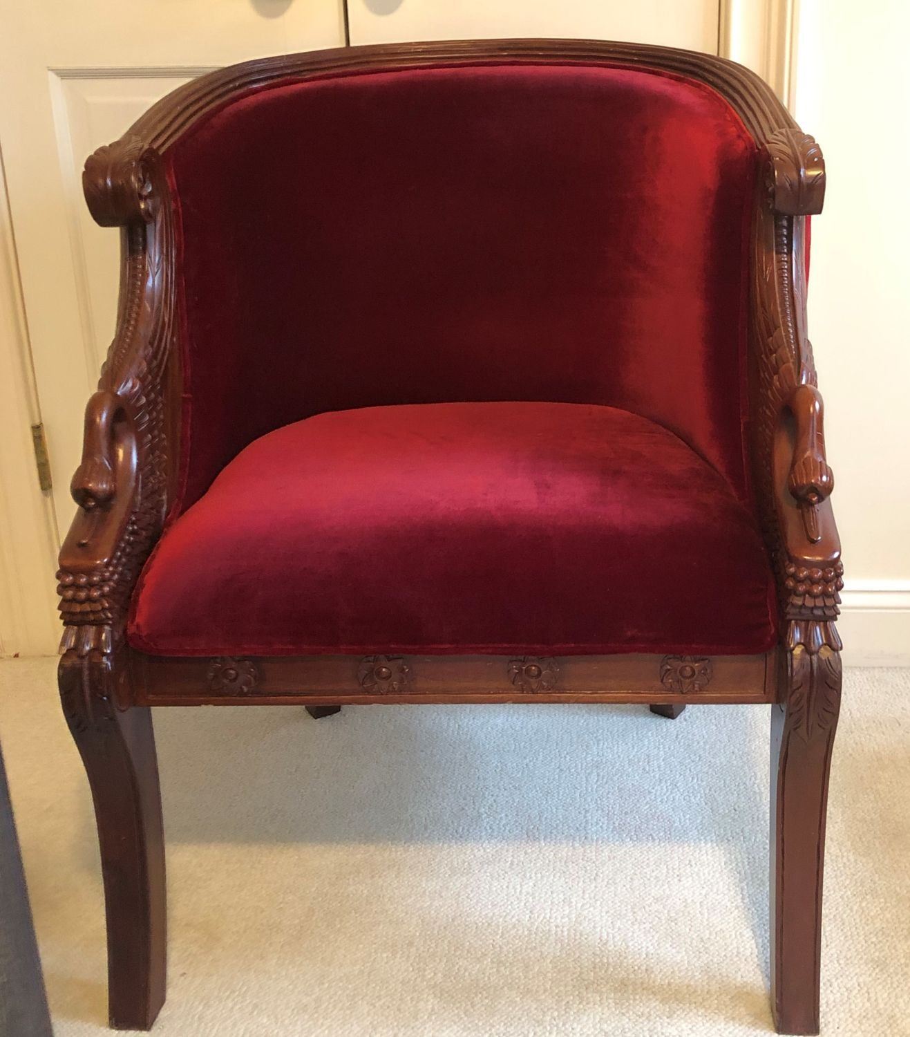 Vintage Mahogany and Velvet Chair. Sides have beautifully carved swans on each arm.