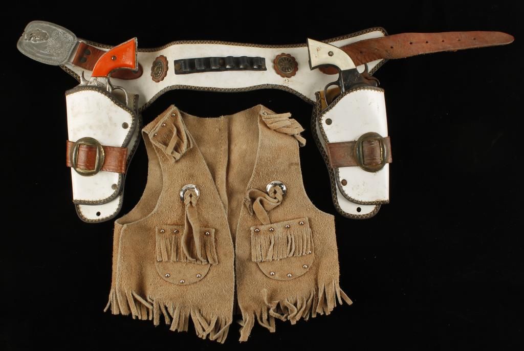 (1) Double holster rig, shows age. (2) Gene Autry Cap Guns marked "Pat Apld For". In aged condition. Also includes small leather vest.