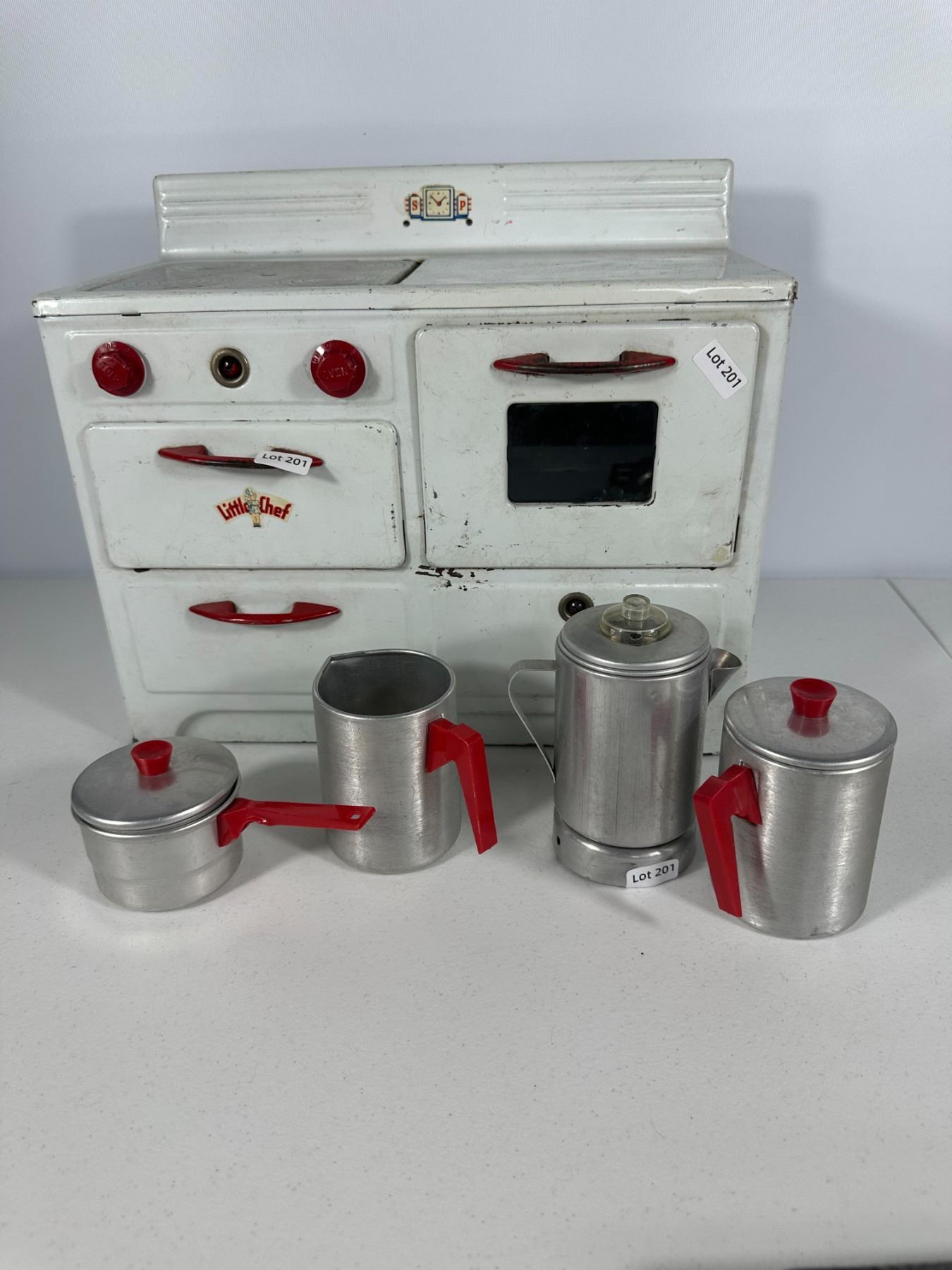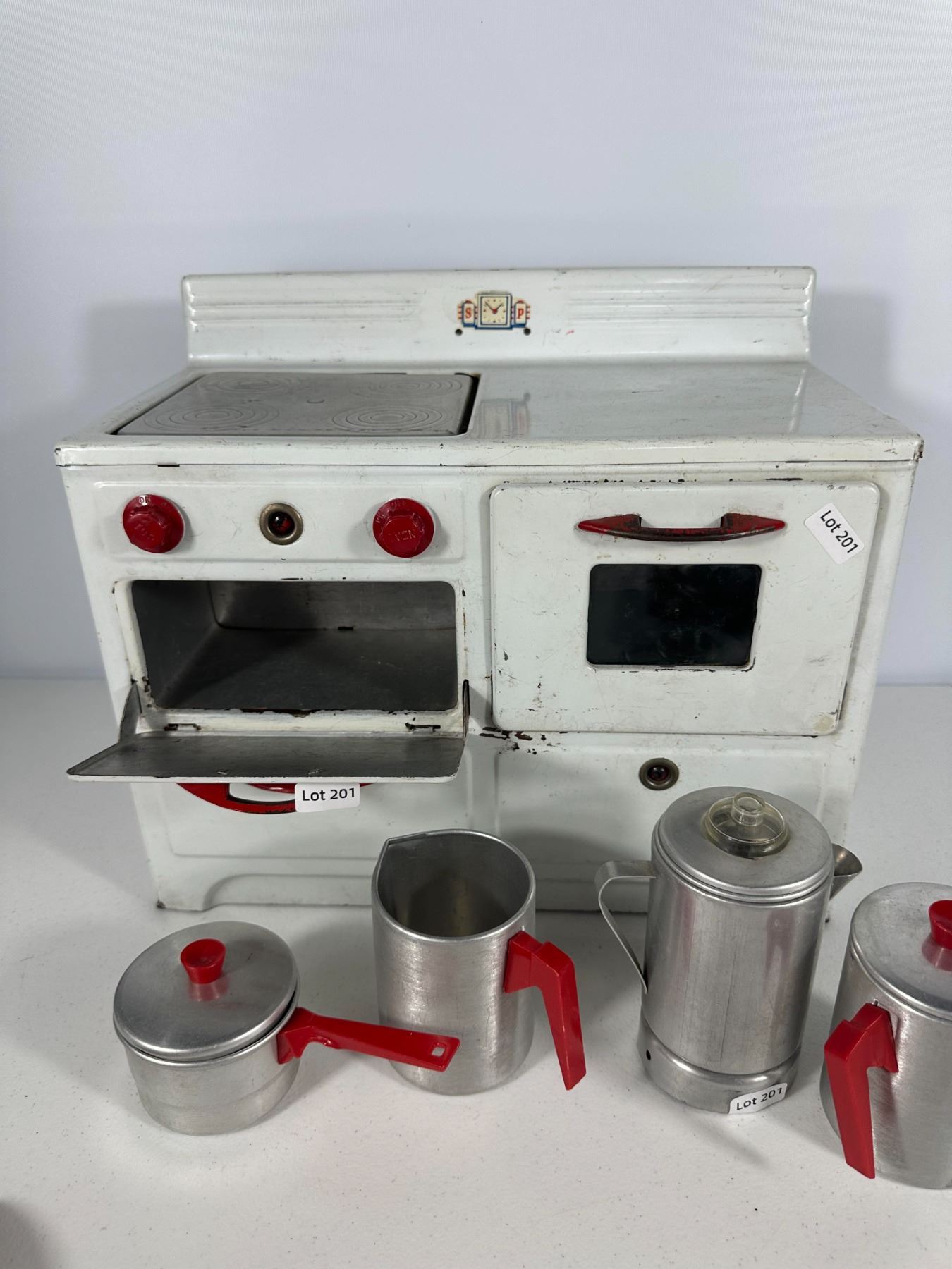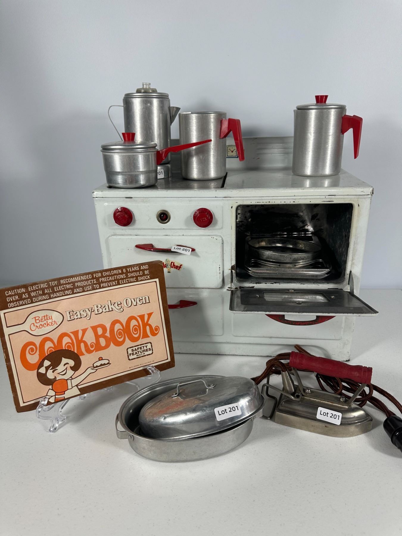 Metal toy stove with red knobs, aluminum cookware, coffee pots, saucepan, covered dish, toy iron, and a Betty Crocker Easy‑Bake Oven Cookbook.