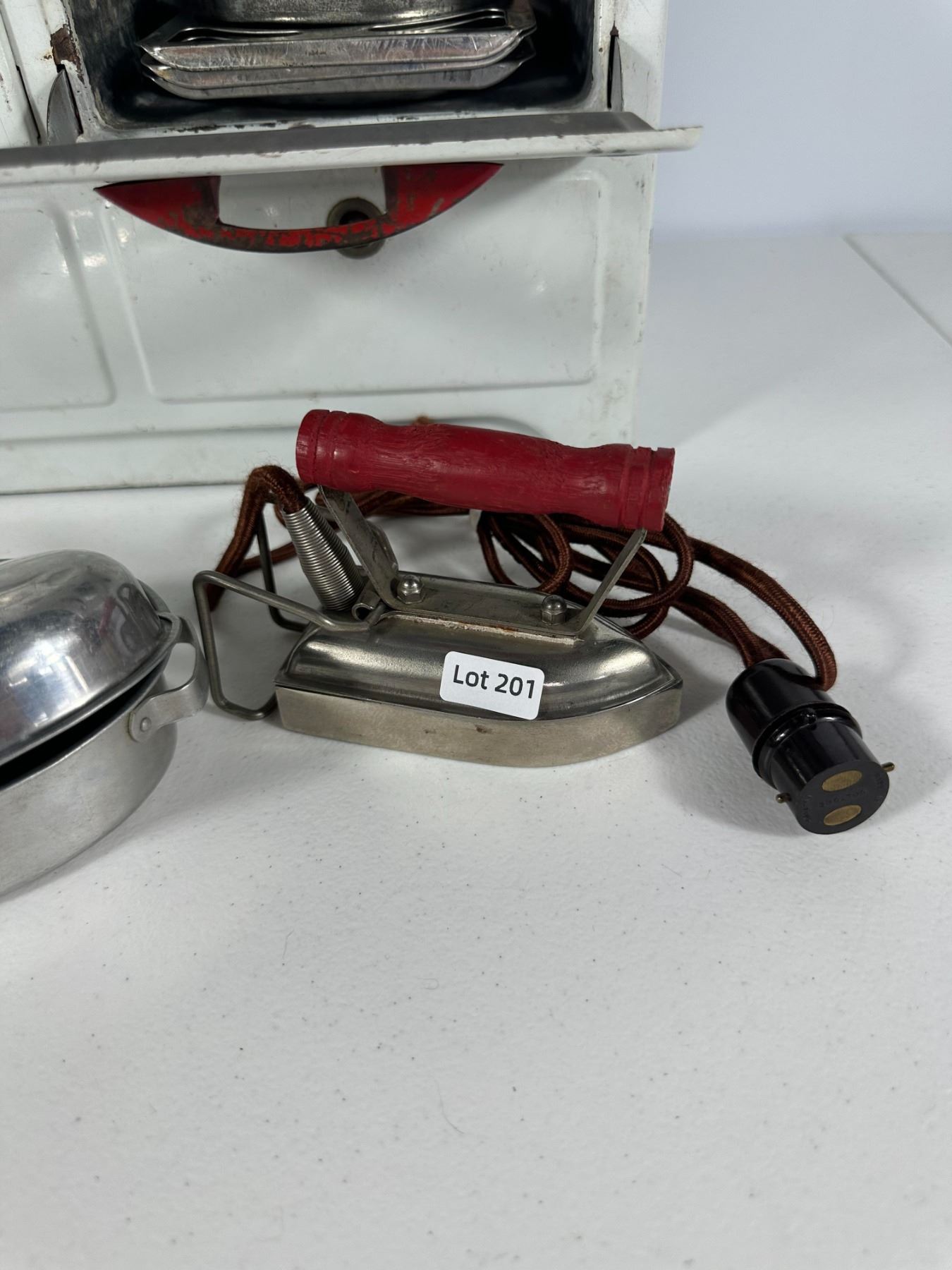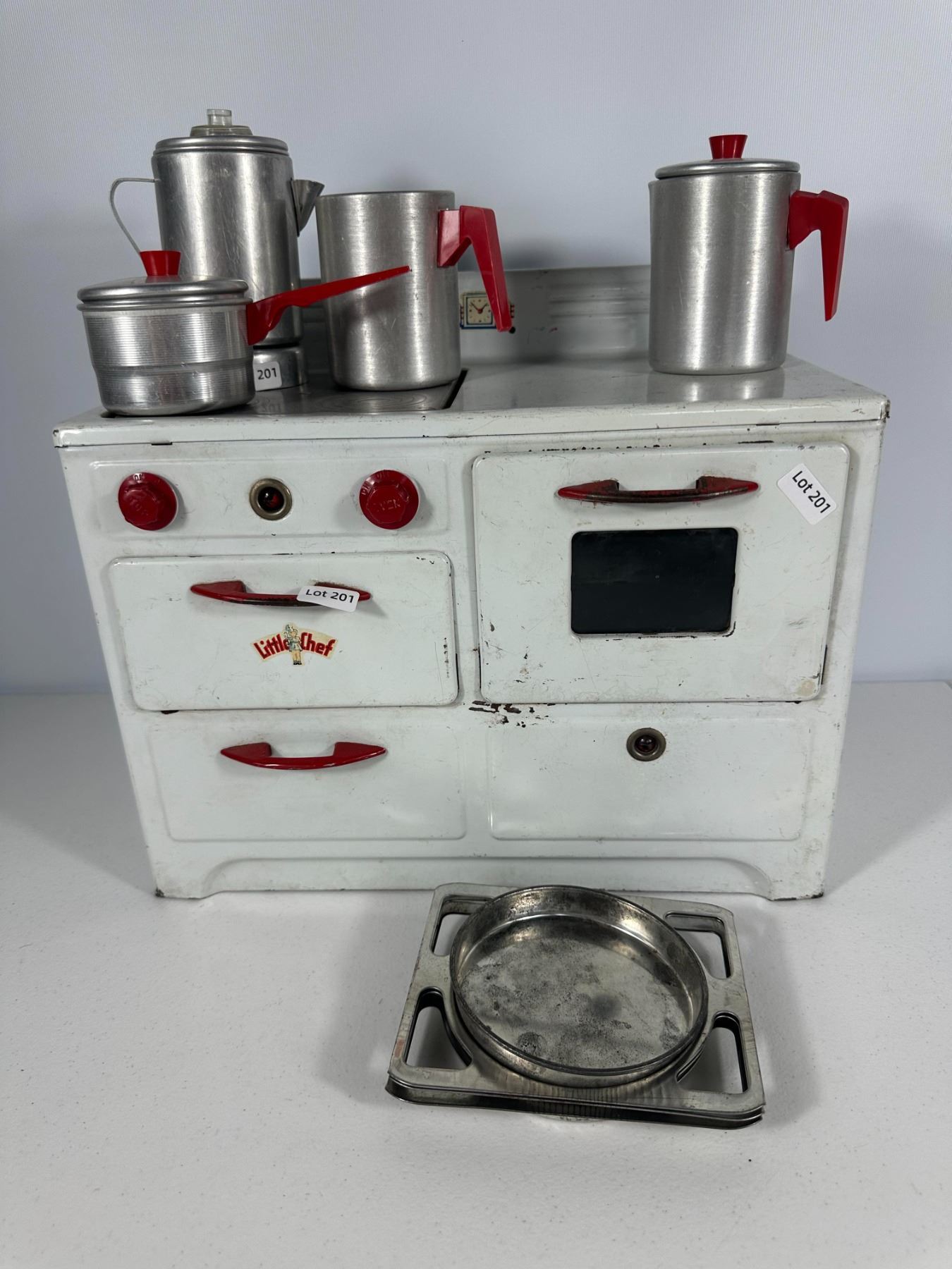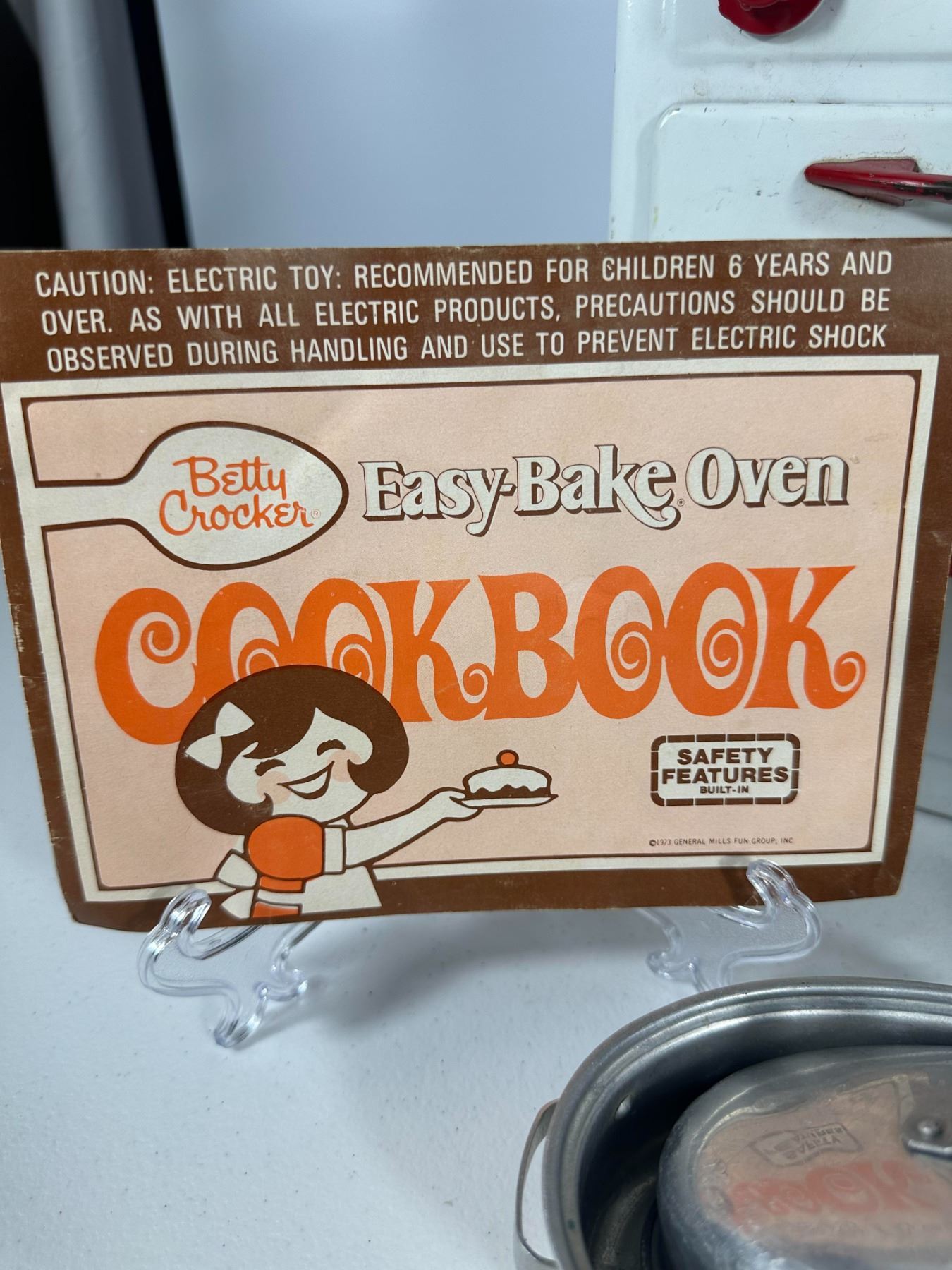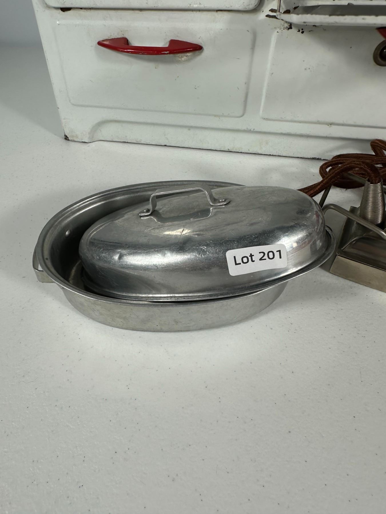 Metal toy stove with red knobs, aluminum cookware, coffee pots, saucepan, covered dish, toy iron, and a Betty Crocker Easy‑Bake Oven Cookbook.