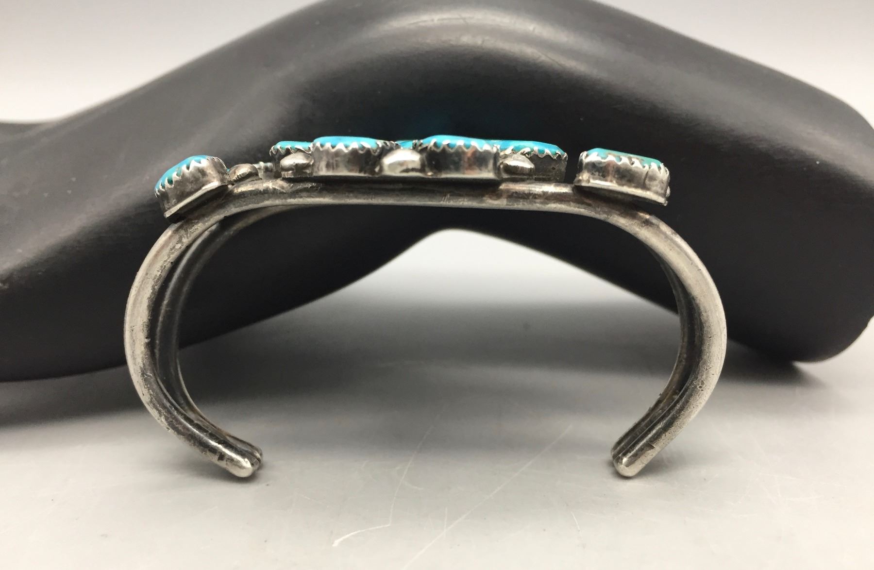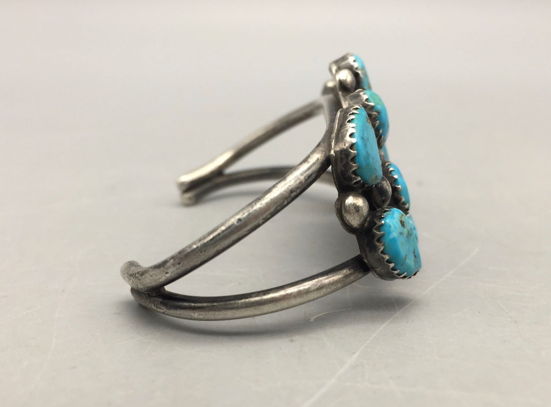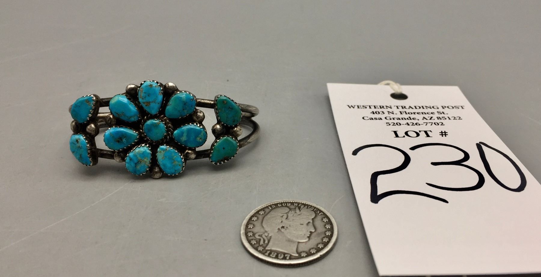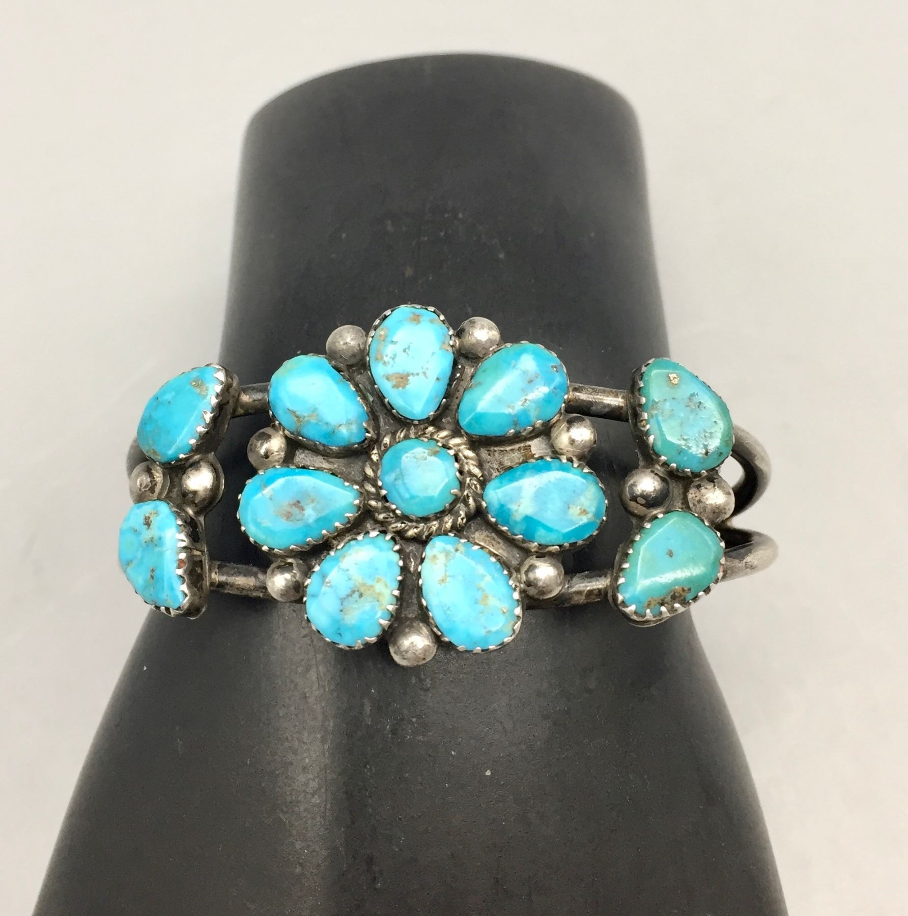 Description: For consideration, we offer for sale this vintage child’s turquoise cluster bracelet featuring a floral design surrounded by hand crafted sterling silver. Nice little bracelet! Maker: No hallmark. Approx. Age: Circa 1960s. Size: Measures 4-1/4” with a 1-1/2” opening (fits a 5-3/4” wrist). Weighs 24.2 grams. Condition: Good for its age, normal wear expected. Please look closely at the pictures - they are an important part of our description. Shipping: There will be a $5 handling / packaging fee for shipping this lot. The actual cost of postage will be added on top of that.