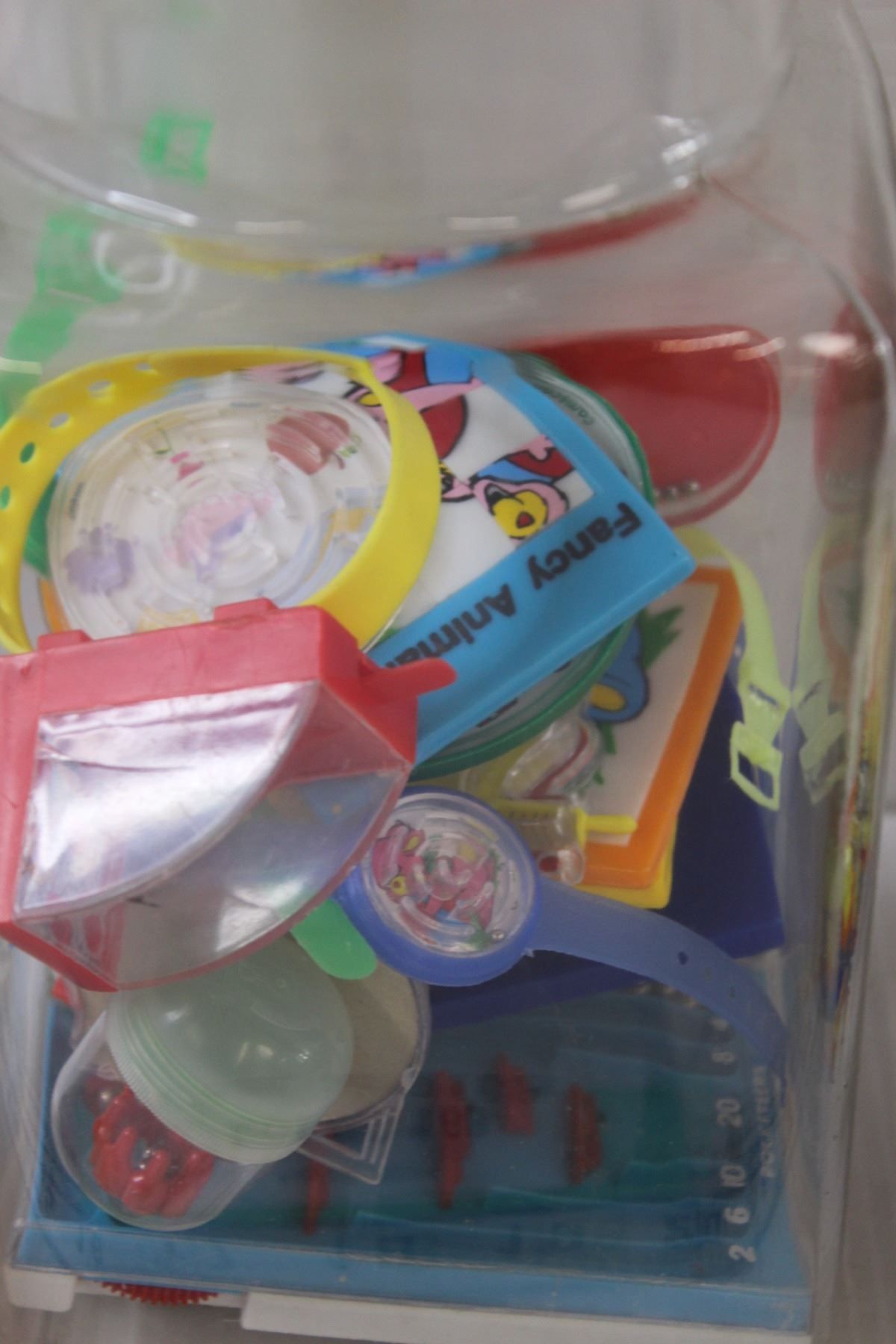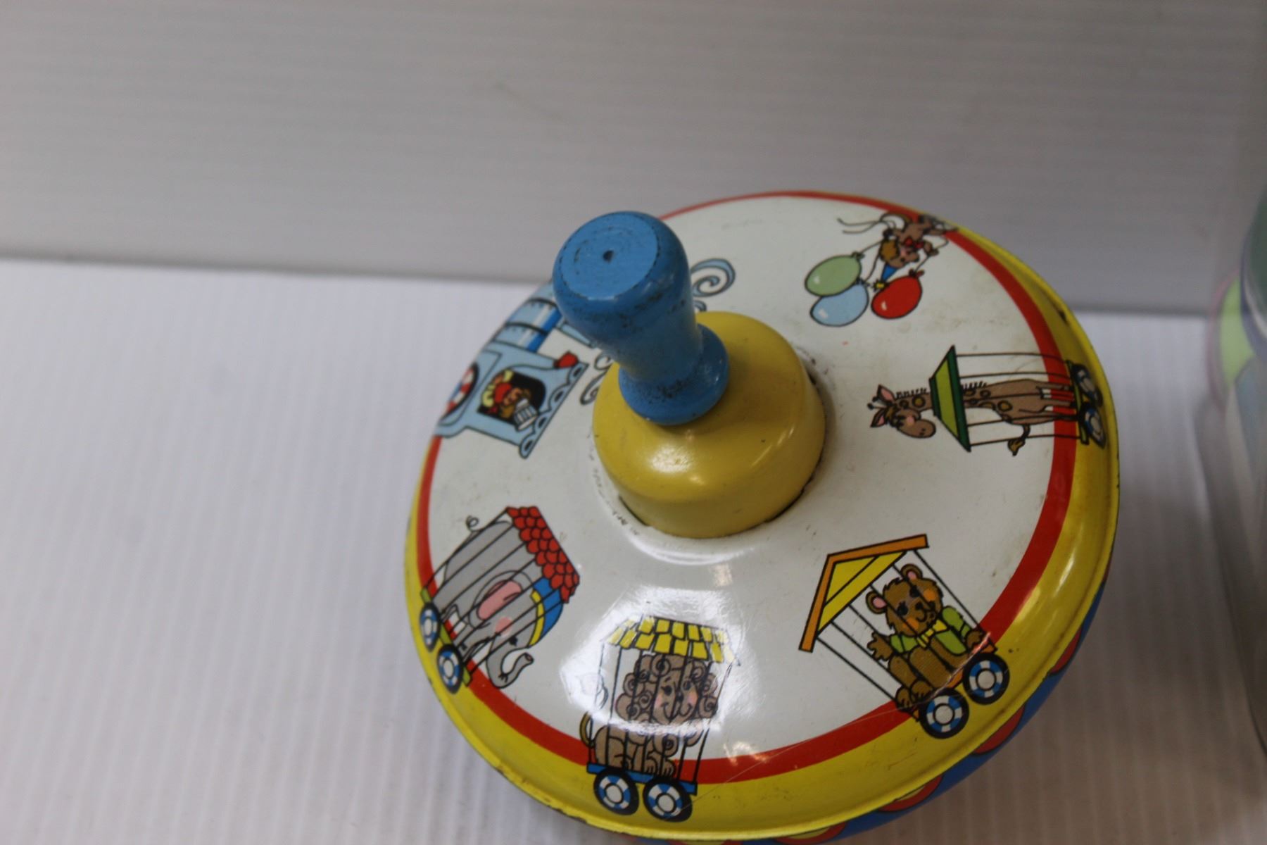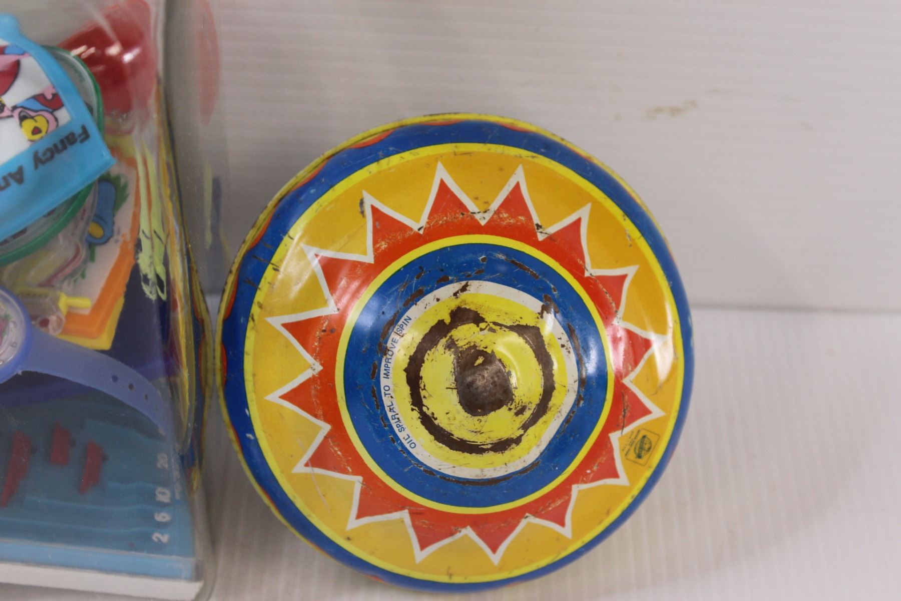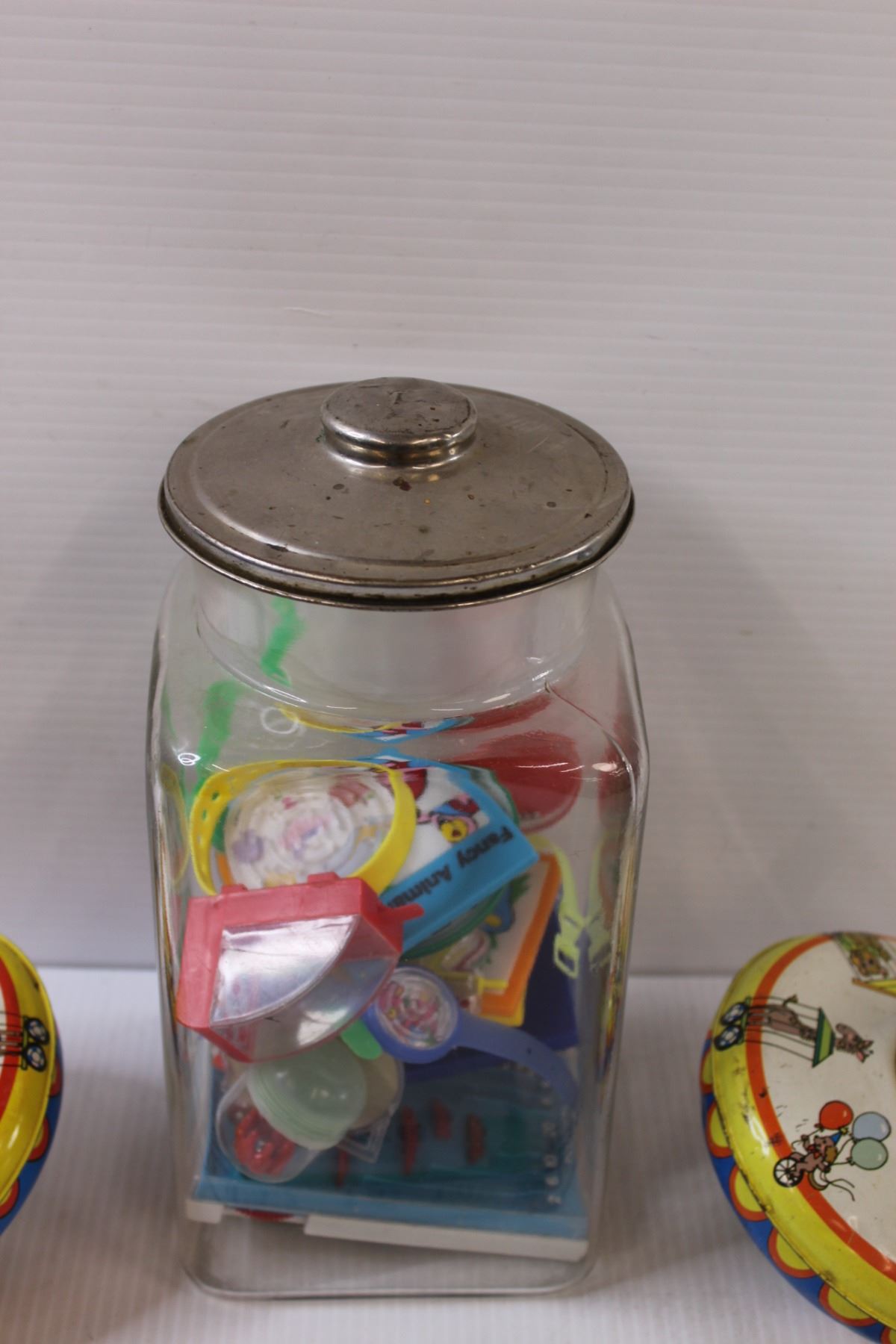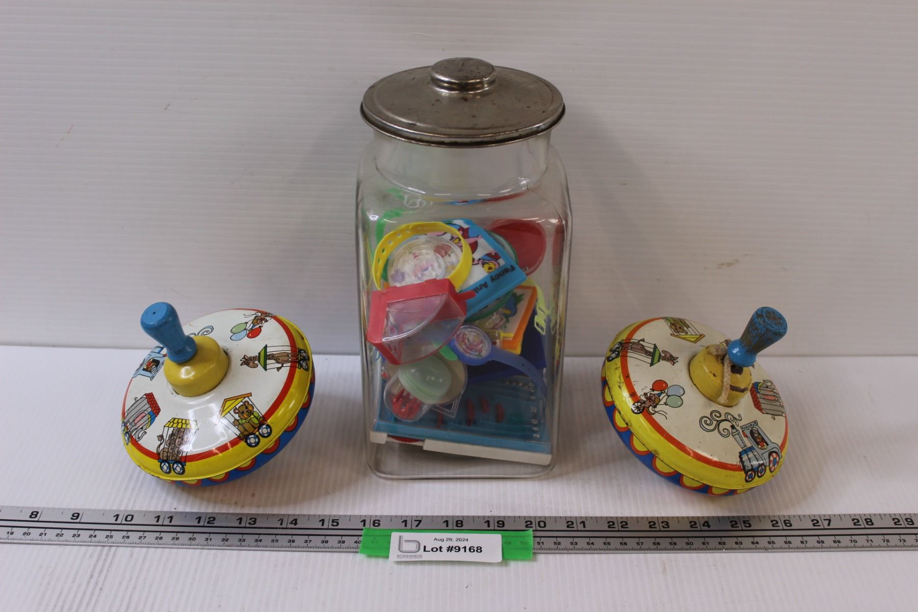 Vintage Children's Toy Lot: (2) Tops, Glass Jar Filled w/Contents