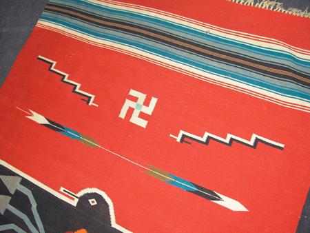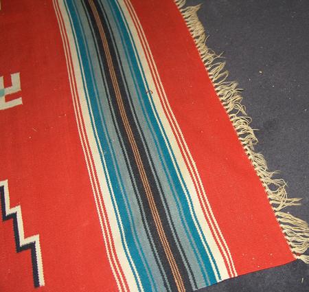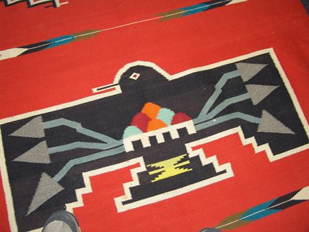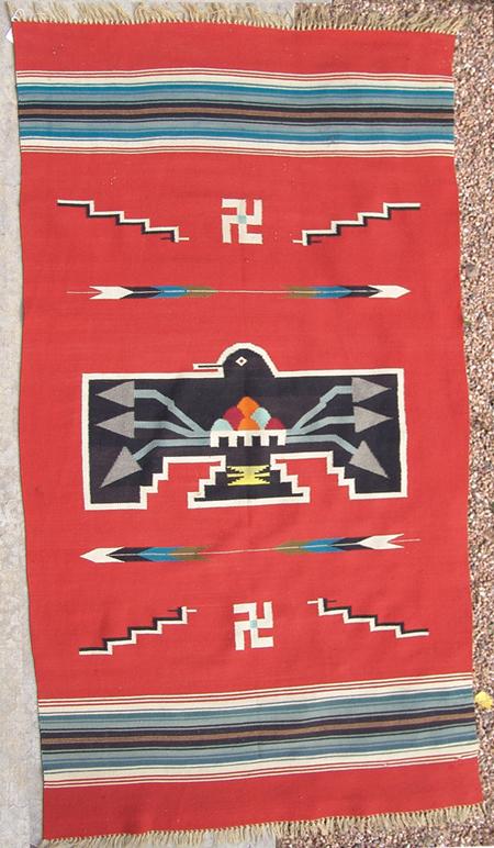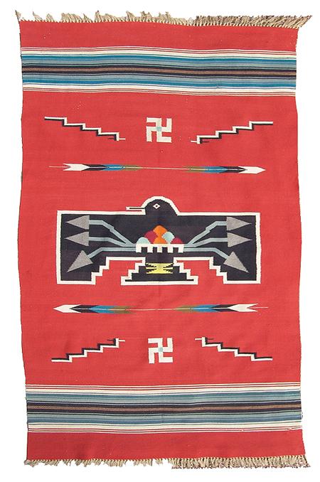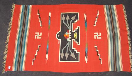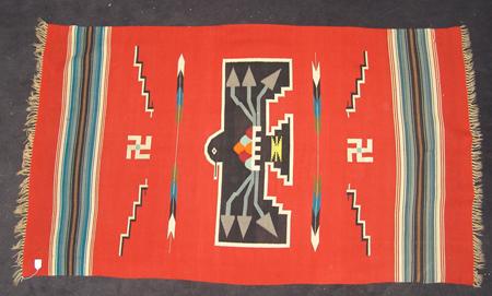 Classic hand woven woolen blanket with large central black thunderbird against red field; rain clouds and lightning appear on his chest, arrows, lighting, and whirling logs float in a field. Appraisal value $750. Condition: good, some wear-thru. 82" x 48"