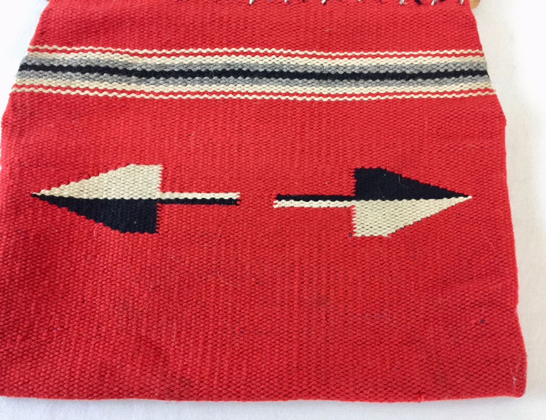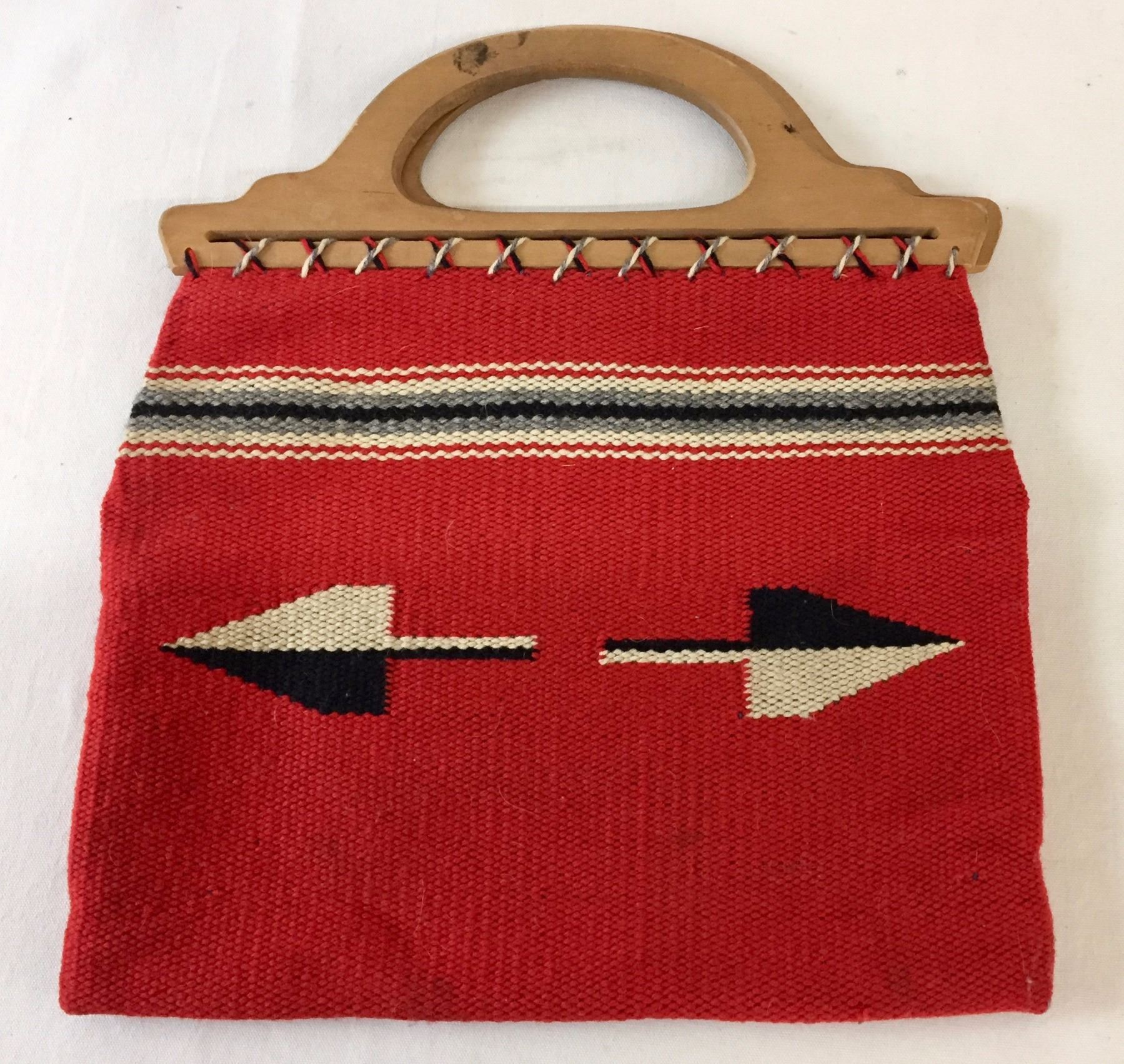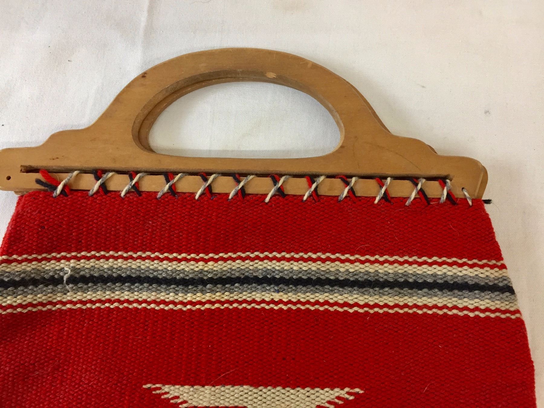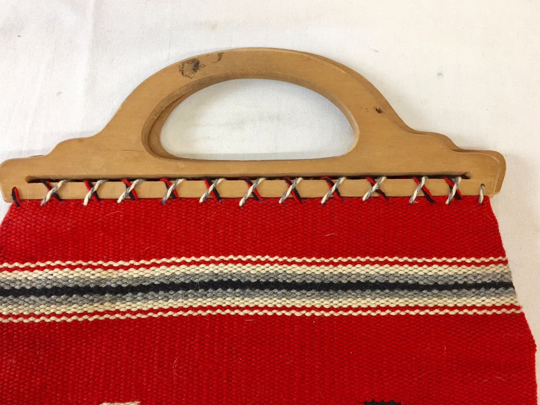 Description: Nice, vintage Chimayo textile purse with wooden handles- has a wallet/keys pocket and one pen pocket on the inside of the purse. Maker: Unknown Chimayo weaver. Approx. Age: Vintage. Size: 15 1/2” l (including handles) x 13 3/4” w. Condition: Good for its age, normal wear expected. Please look closely at the pictures - they are an important part of our description. Shipping: There will be a $7 handling / packaging fee for shipping this lot. The actual cost of postage will be added on top of that.