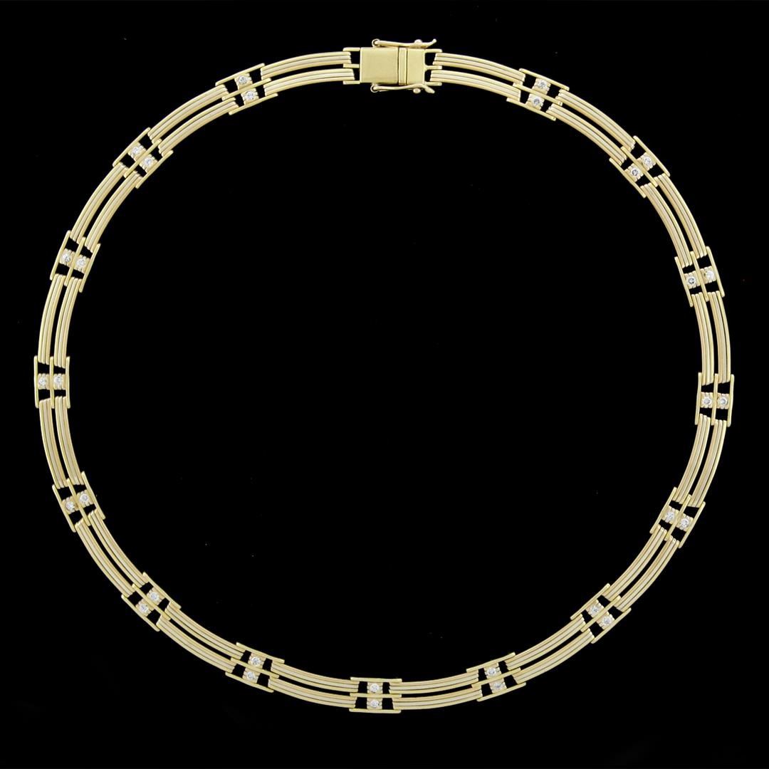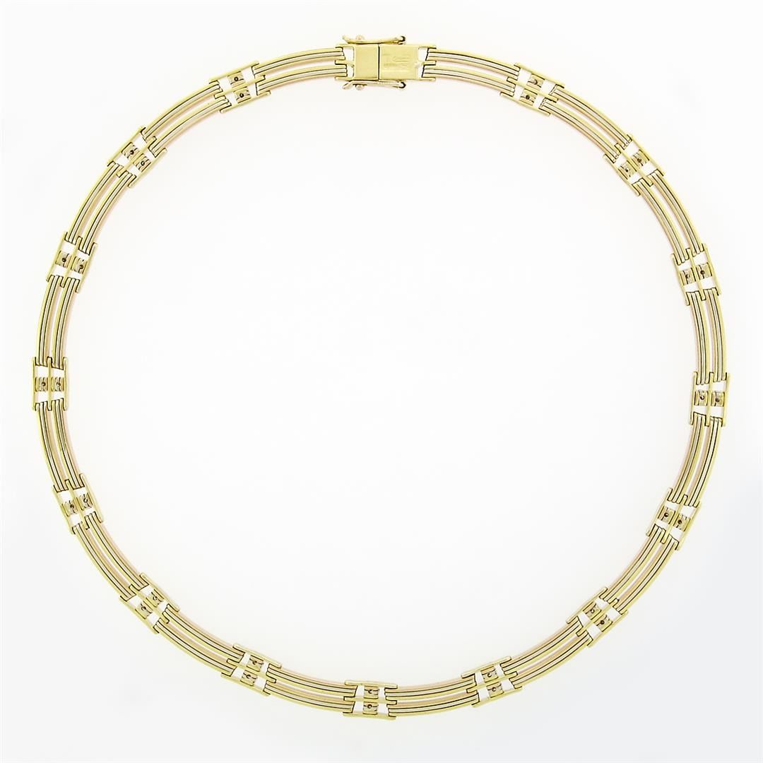 A vintage solid 18k tri color necklace, with 30 round brilliant cut natural diamonds (E/F - VS1/VS2; 1.05ctw). 15 inch link chain, 50 grams total weight.