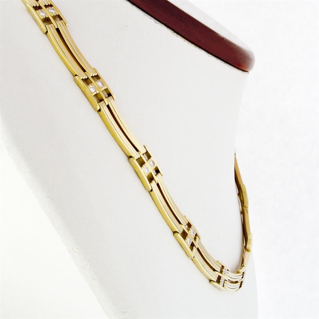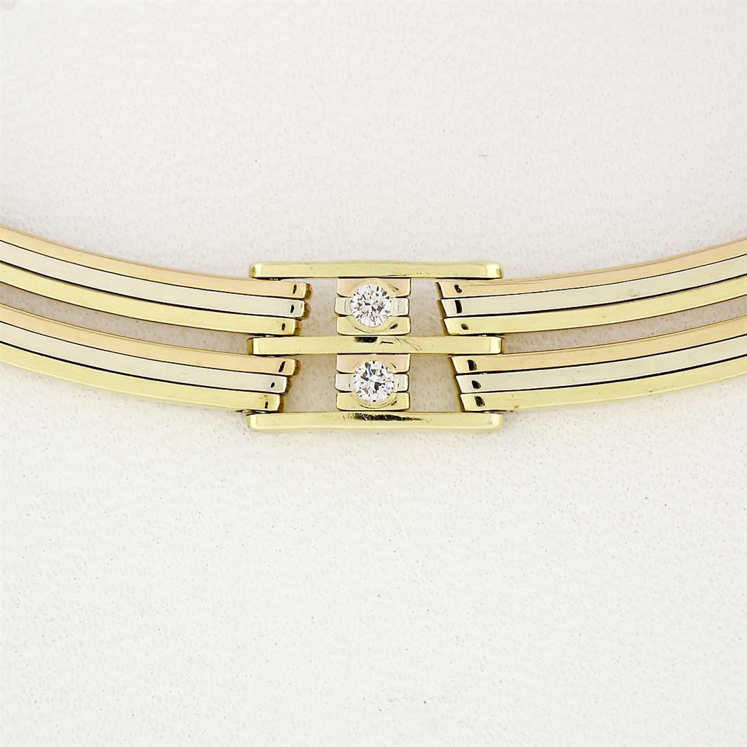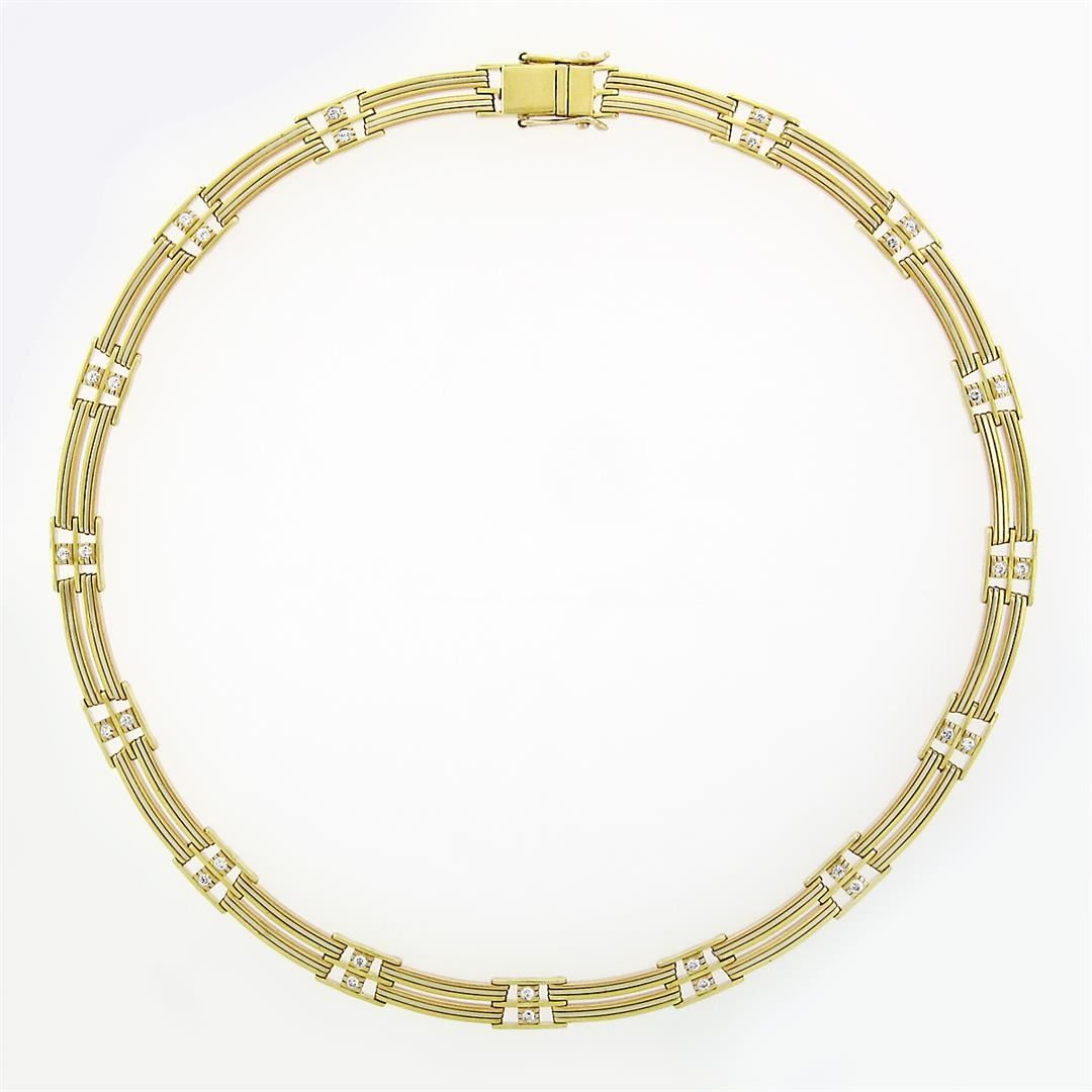 A vintage solid 18k tri color necklace, with 30 round brilliant cut natural diamonds (E/F - VS1/VS2; 1.05ctw). 15 inch link chain, 50 grams total weight.