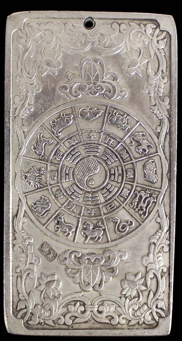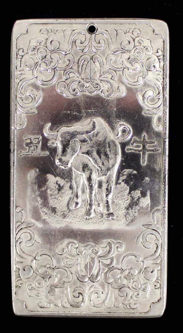 Vintage Chinese Calendar Year of the Ox Silver Bullion Bar, .999, beautifully cast with an ox on the front and the Chinese horoscope wheel of twelve zodiac symbols on the reverse, along with the Chinese stamp for silver weighs approximately 135g. Post 1940's, measures 3.75''L x 2''W x 1/8''Deep