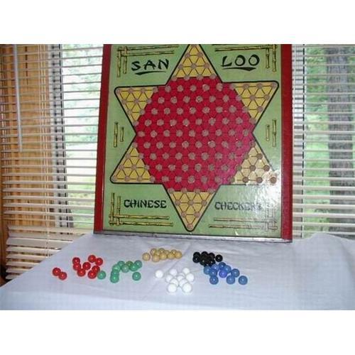 Complete set of vintage chinese checkers. All the marble playing pieces fit in two sides of the board for safe keeping. This is probably the only reason all the marbles in each color are still here. Made by San Loo and in very good condition.