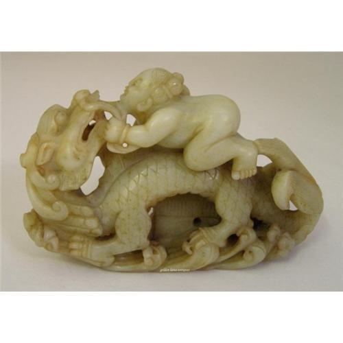 This is a lovely and special jade decoration piece. It has some precise and intense carvings. The child is happily riding the dragon. There are also water waves and house roof under the dragon. Since it has a flat bottom, it can be placed on the table as an interesting paper weight or simply as a decoration.