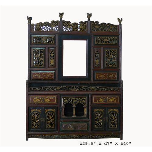 This chest has an elegant charming floral pattern all around. It was made into a tower style with shelves, drawers, center statue display place and mirror. It is a unique entrance chest for accessories storage, or a make-up counter in the bedroom, or a personal mediation display case. <p>