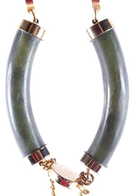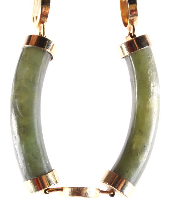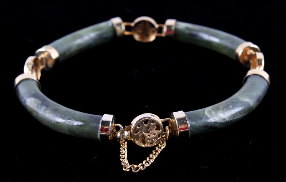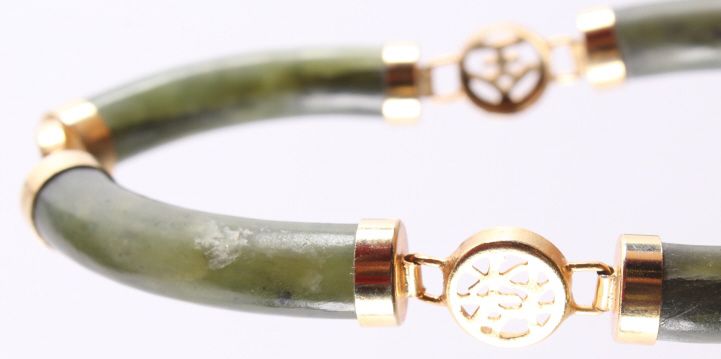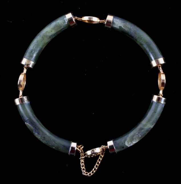 The bracelet features four pieces of hand carved Chinese Jade with a gold washed silver (believed) design. Each of the gold washed settings has a Chinese character. The bracelet also has a gold washed safety chain. This vintage piece is in good condition and measures 3" in diameter (outside).