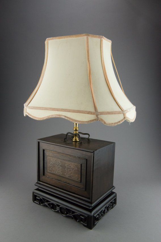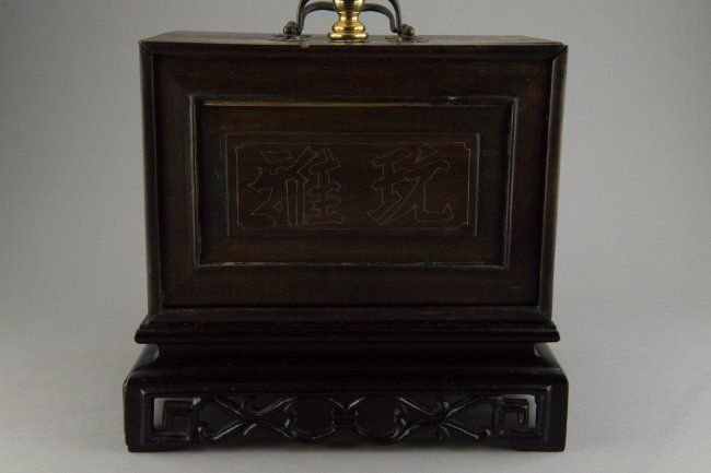 The rectangular wood box base set on raised open works platform, marked Ya Wen on front face; 57 cm x 38 cm
