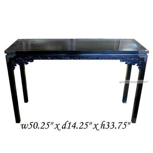 This elegant and decent altar table uses fine quality India Zitan wood. It has simple structure, but the intense precise relief carving of cloud along the apron creates the character of the table. The copper plates inset at the corner and leg end also have detail cloud pattern. It is a high quality craftsmanship work for stylish home decoration as well as personal treasure collection. </p>