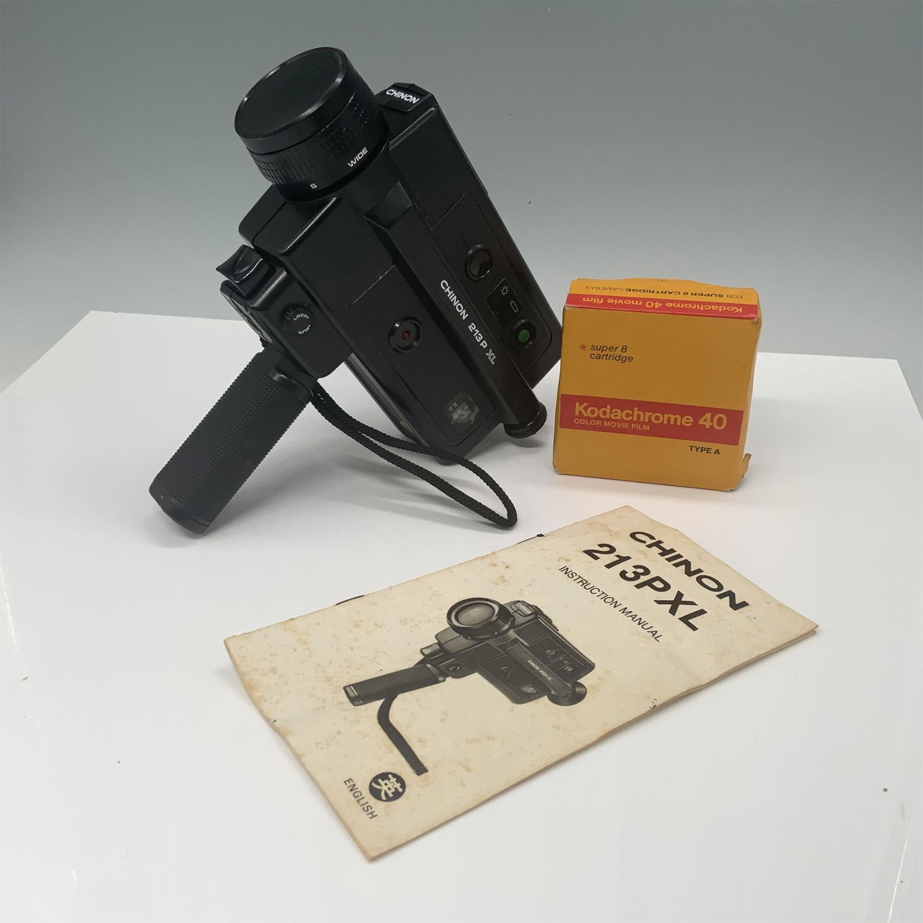 A vintage Chinon 213PXL Super 8 movie camera, complete with its original instruction manual and a Kodachrome 40 Super 8 cartridge film (Type A, 50ft). The Chinon 213PXL features an integrated zoom lens and a built-in microphone, making it a versatile option for shooting home movies on classic Super 8 film. The camera shows minimal wear consistent with age and has not been tested for functionality. An excellent collectible for vintage camera enthusiasts and film hobbyists.