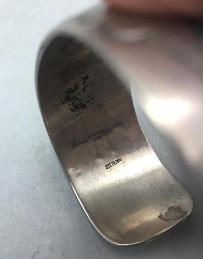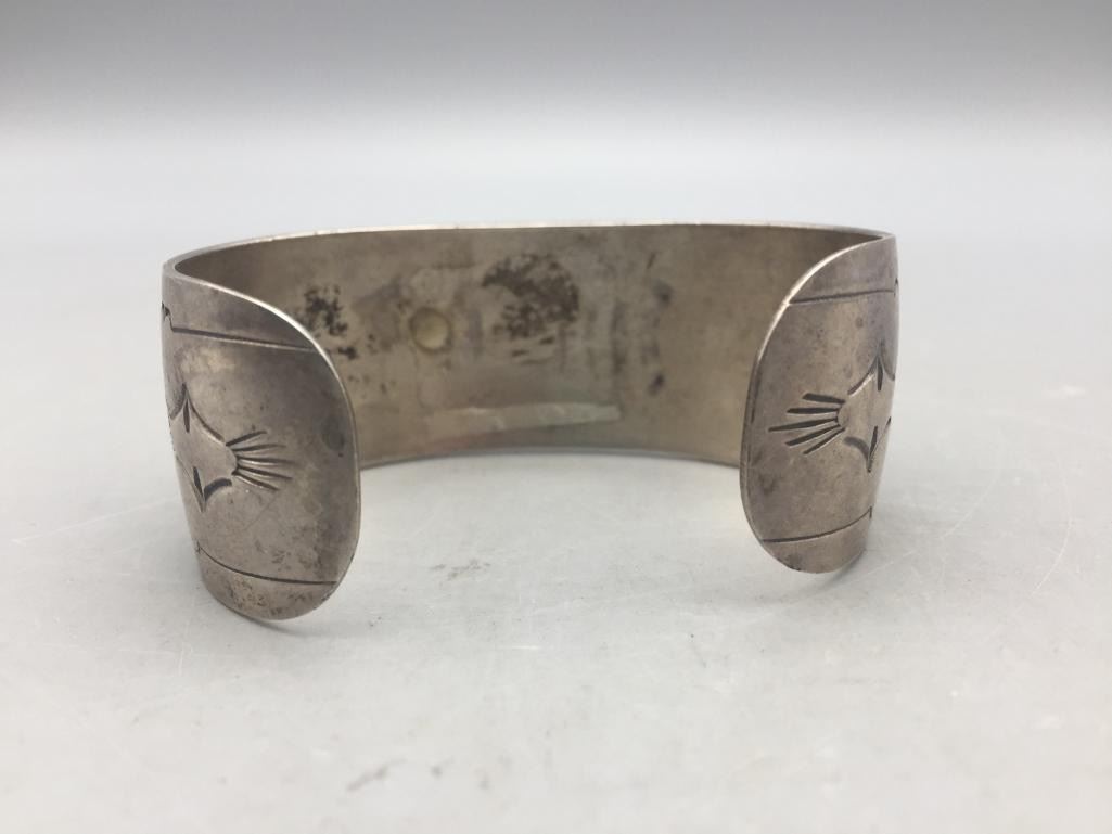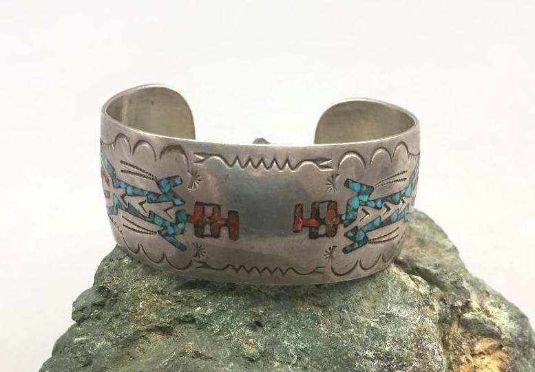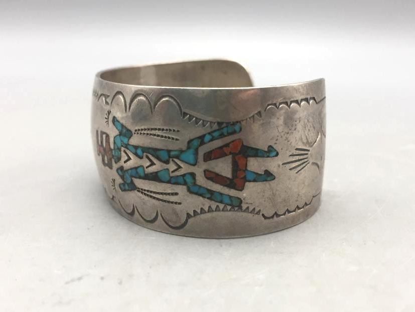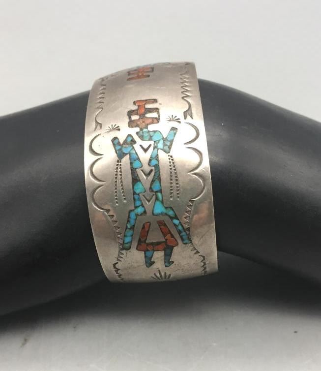 Offered for sale in this lot is a vintage chip inlay bracelet. It has a kachina design theme. It is set with turquoise and coral chip inlay and is marked as sterling. Maker: Not hallmarked. Approx. Age: 1970s. Size: Inside circumference measures 5-1/2". Opening is an additional 1", fitting a 6-1/2" wrist. Width is 1". Weighs 33.3 grams. Condition: Good for its age, normal wear expected. Please look closely at the pictures - they are an important part of our description. Shipping: There will be a $5 handling, packaging fee for shipping this lot. The actual cost of postage will be added on top of that.
