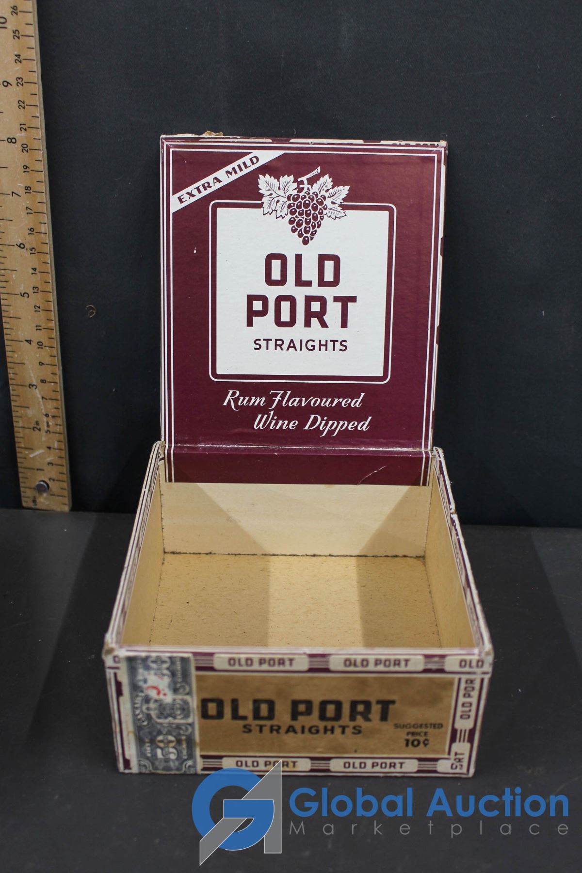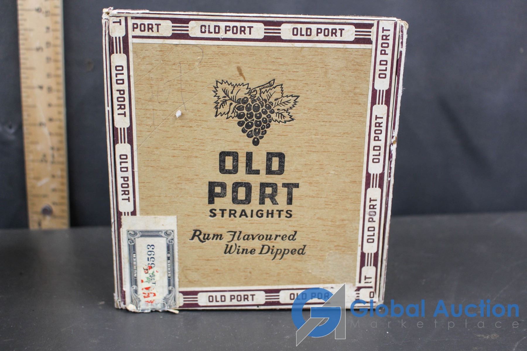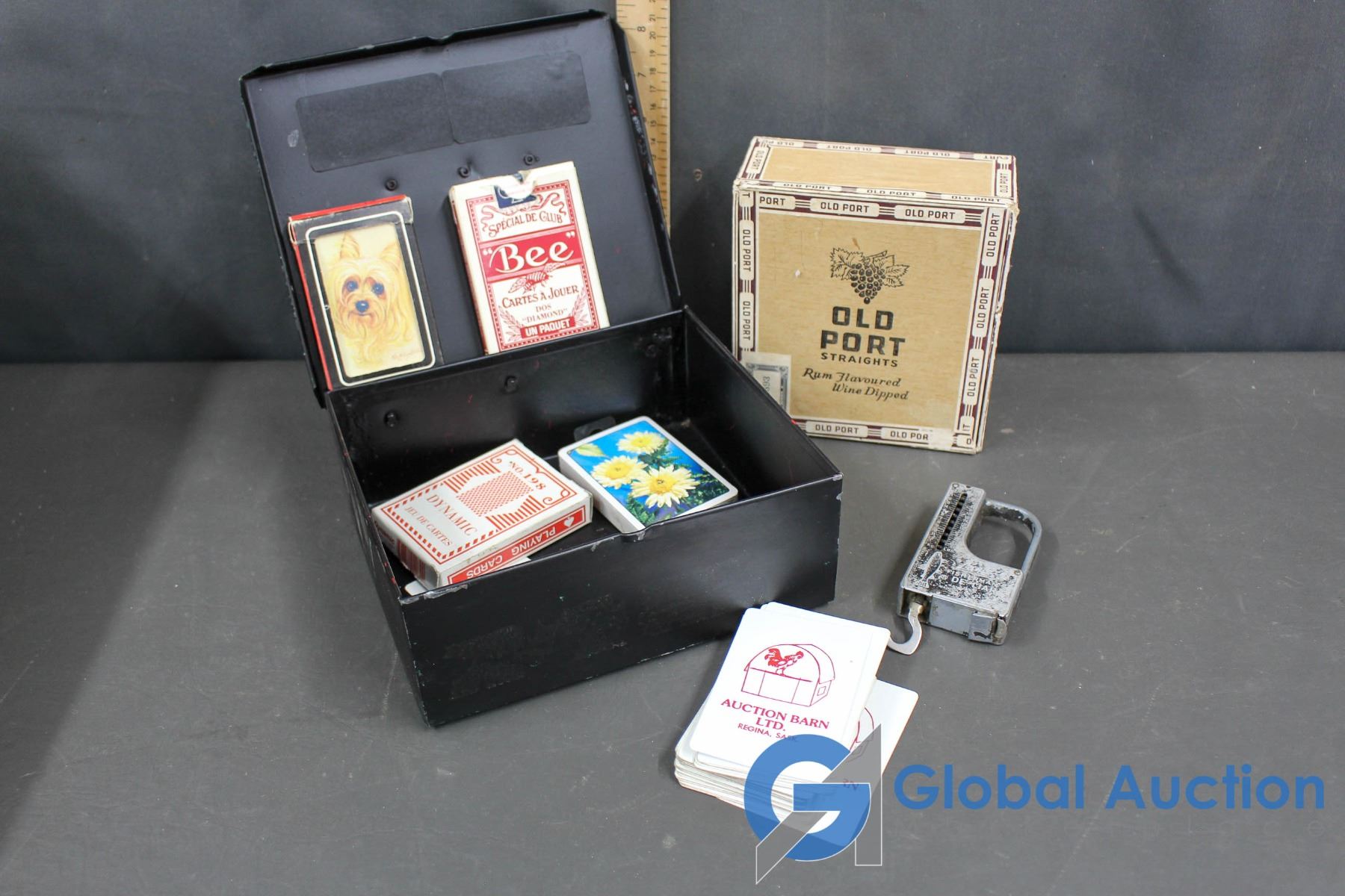 Vintage Old Port Cigar Box, & Langley Fisherman's De-Liar Scale, & Black Metal Money Box With (5)Deck of Playing Card