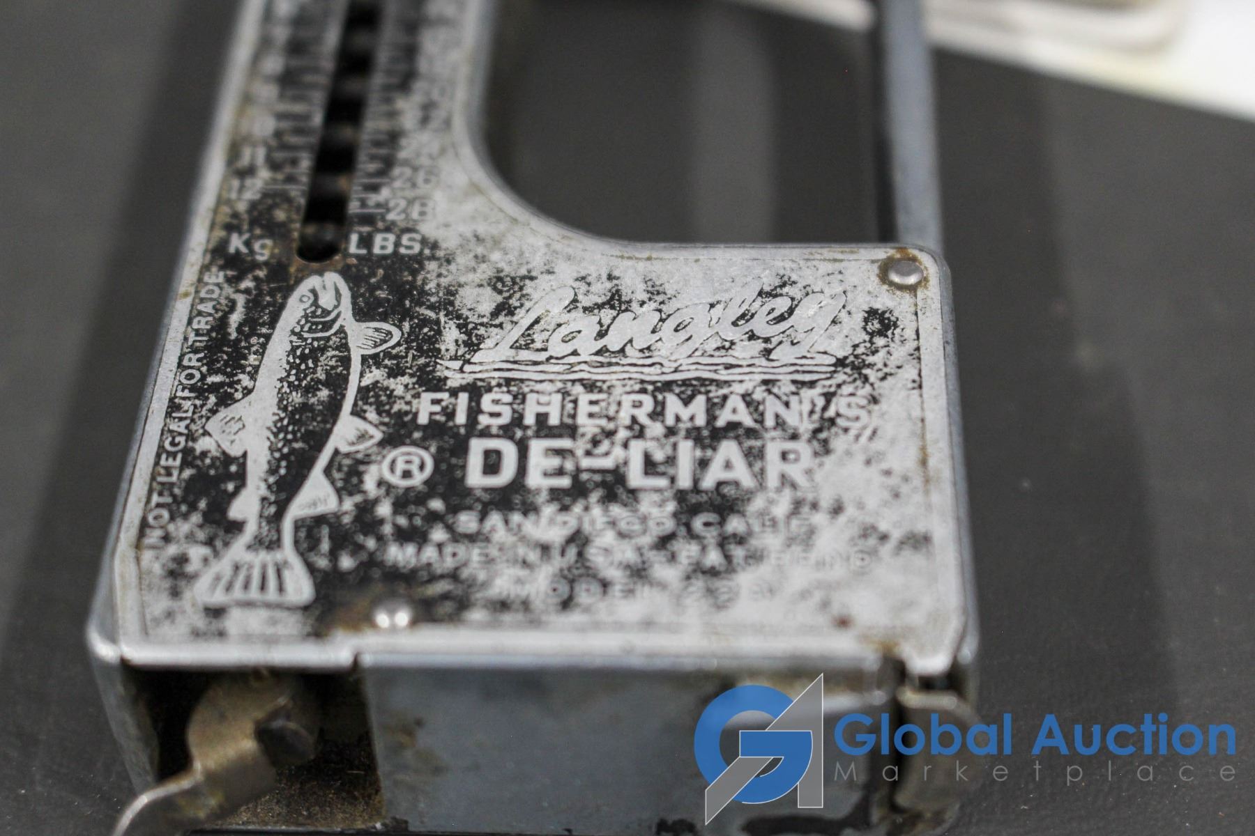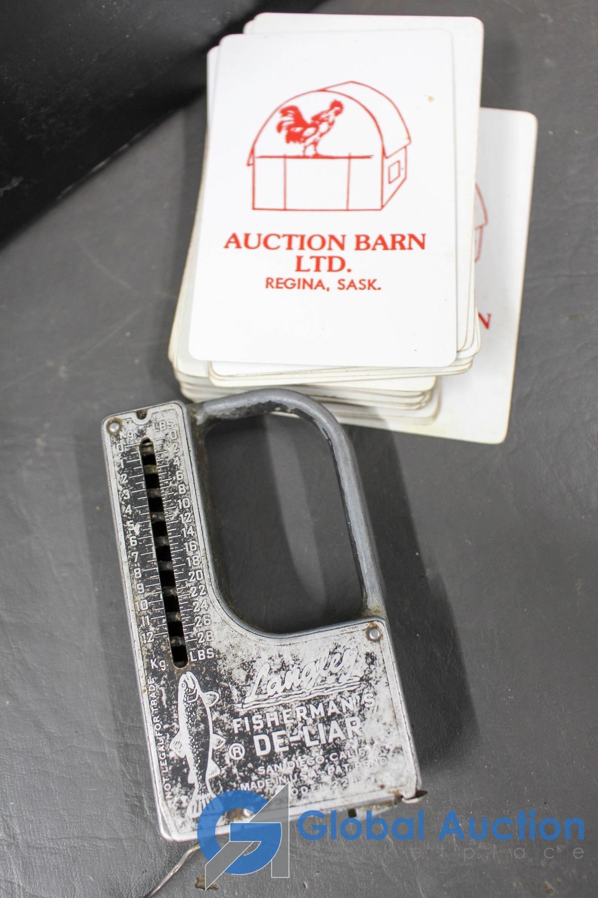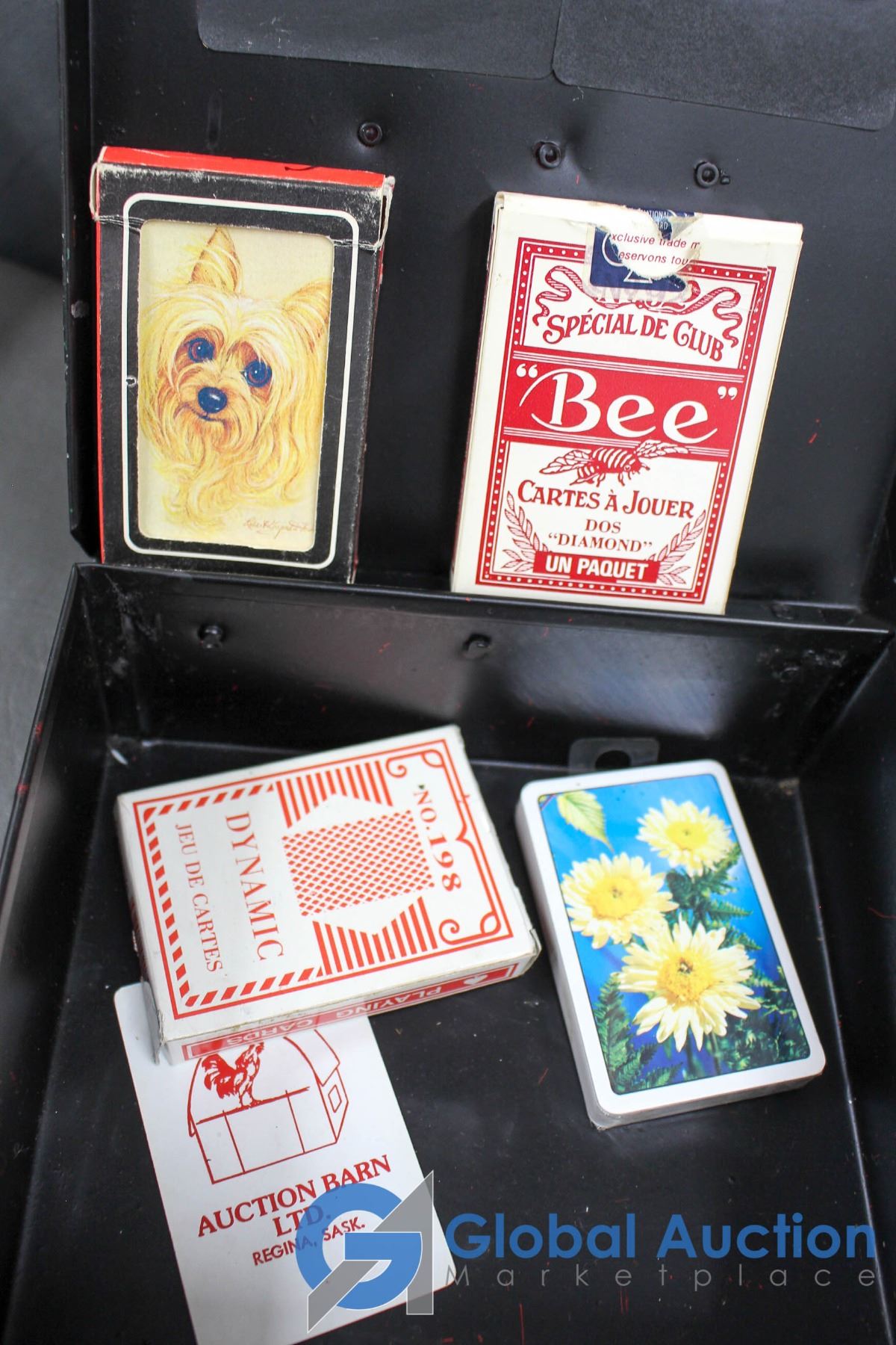 Vintage Old Port Cigar Box, & Langley Fisherman's De-Liar Scale, & Black Metal Money Box With (5)Deck of Playing Card