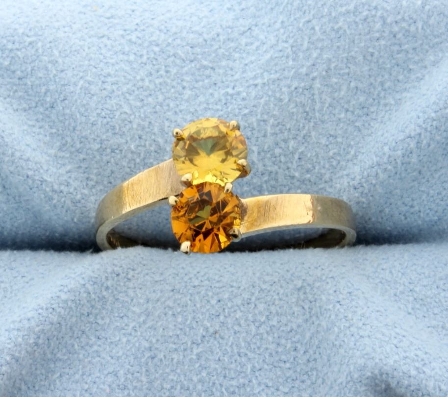 The citrine is approx. 0.65 carats. The yellow topaz is approx. 0.75 carats. This is a nice vintage ring! Size 9. 2.5g