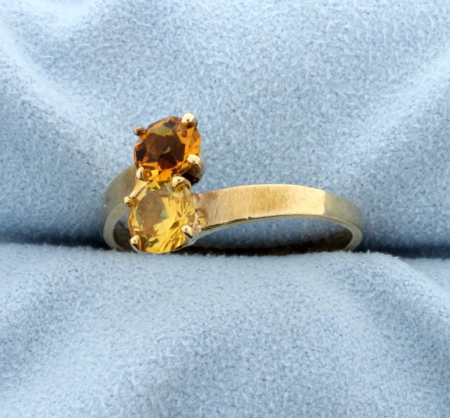 The citrine is approx. 0.65 carats. The yellow topaz is approx. 0.75 carats. This is a nice vintage ring! Size 9. 2.5g