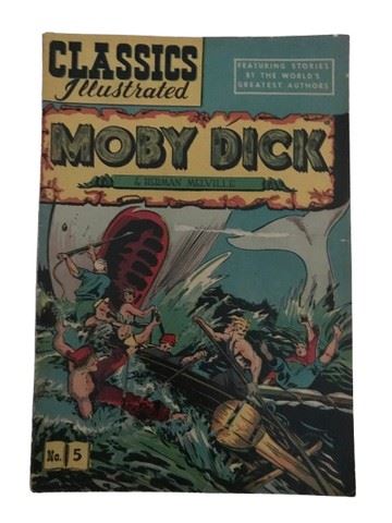 Moby Dick by Herman Melville - Issue 5 - Condition: Fair Torn front cover with a hole in the top right and a tear on the bottom spine. A well-loved copy of Melville’s maritime masterpiece, showing signs of its age and use.