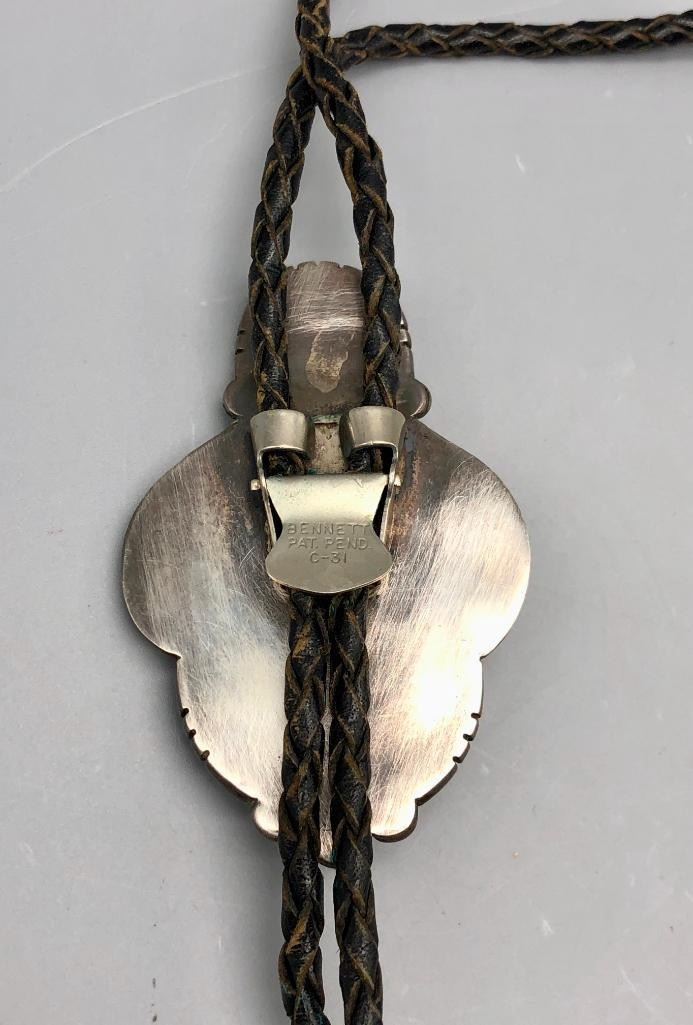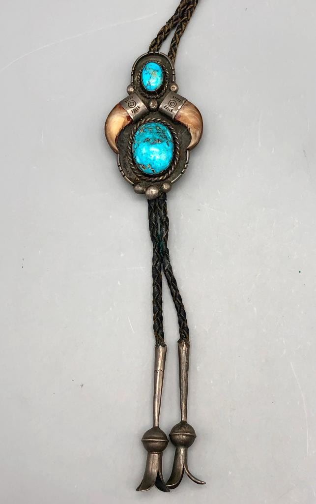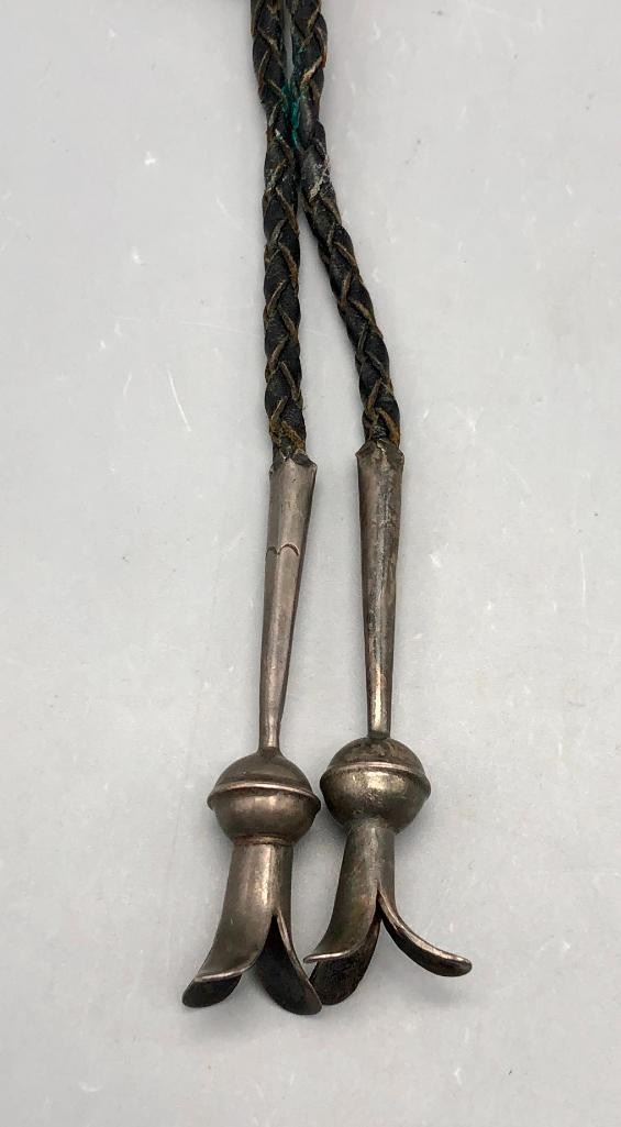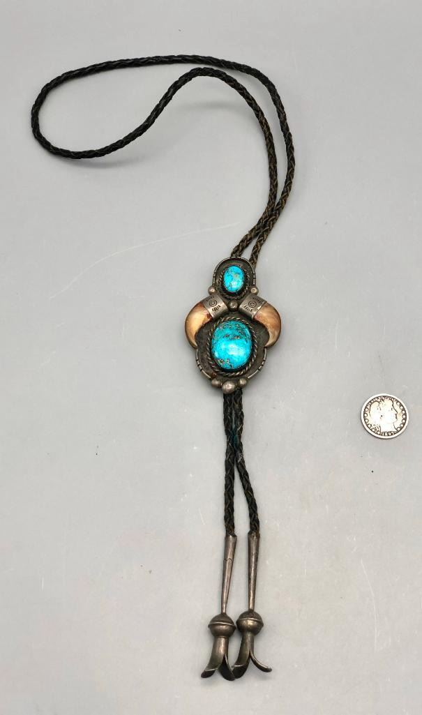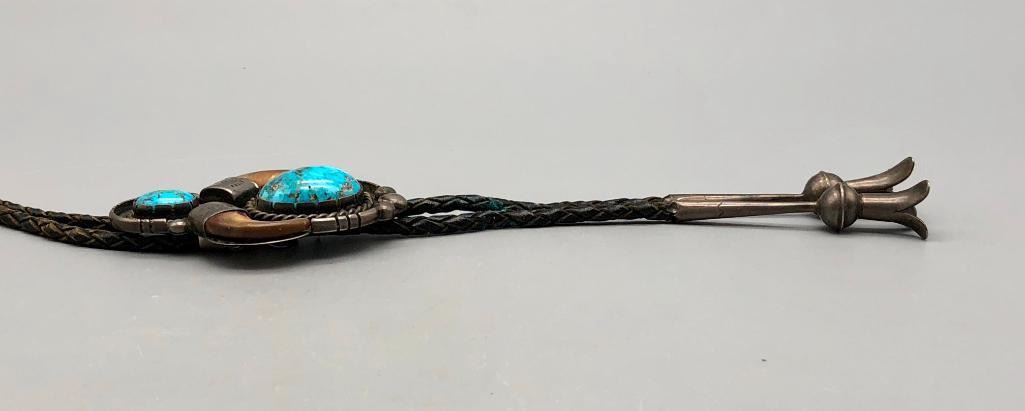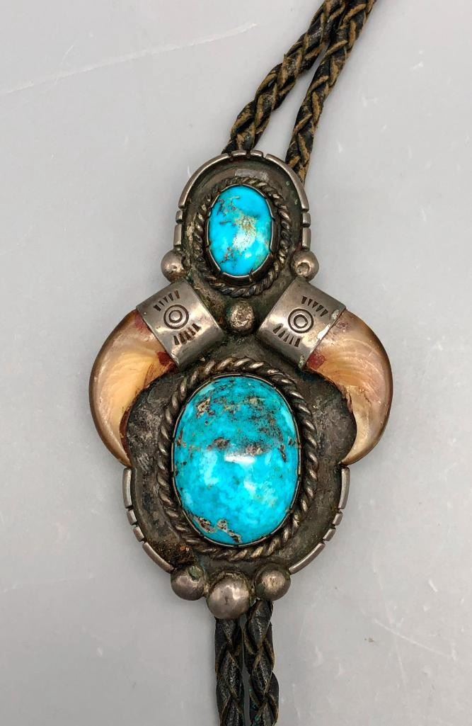 For your consideration is this vintage claw and turquoise bolo tie. This is a nice classy bolo tie with two great turquoise cabochons set in handmade bezels. It also has two claws on either side with hand stamped designs on the caps. The tips are custom made, with blossom style ends. Made from sterling silver. MAKER: Unmarked. APPROX AGE: Circa 1970s. SIZE: Braided cord measures 39 inches long including tips. Slide measures 3-1/4 inches long X 2 inches wide. Weighs 71.7 grams. CONDITION: Good for its age, normal wear expected. Please look closely at the pictures as they are an important part of our description and are hereby incorporated into the description, specifically with regards to condition. SHIPPING: There will be a $5 handling / packaging fee for shipping this lot. The actual cost of postage will be added on top of that. BUY IT NOW: If you would like to buy this item now, without waiting for the auction day to bid on it, we do offer this option (which is available up to 48 hours before the actual auction starts). The “Buy it Now” price is the high estimate of this lot (plus applicable fees and the Buyer's premium is discounted to 10% when using the Buy it Now option). If you would like to exercise this option, you must contact us by email (or phone as long as you talk to someone live). Reference this lot number and your intention to "Buy it Now."