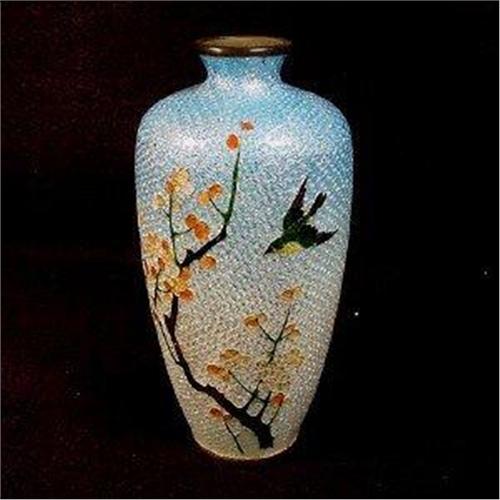 Beautiful bright cloisonné vase - fish scale design to background, shading from silver white to pale blue. Fish scale gives a very bright, sparkling look - the motif is prunus branches with a bird - possibly a kingfisher, with green, black and gold plumage.