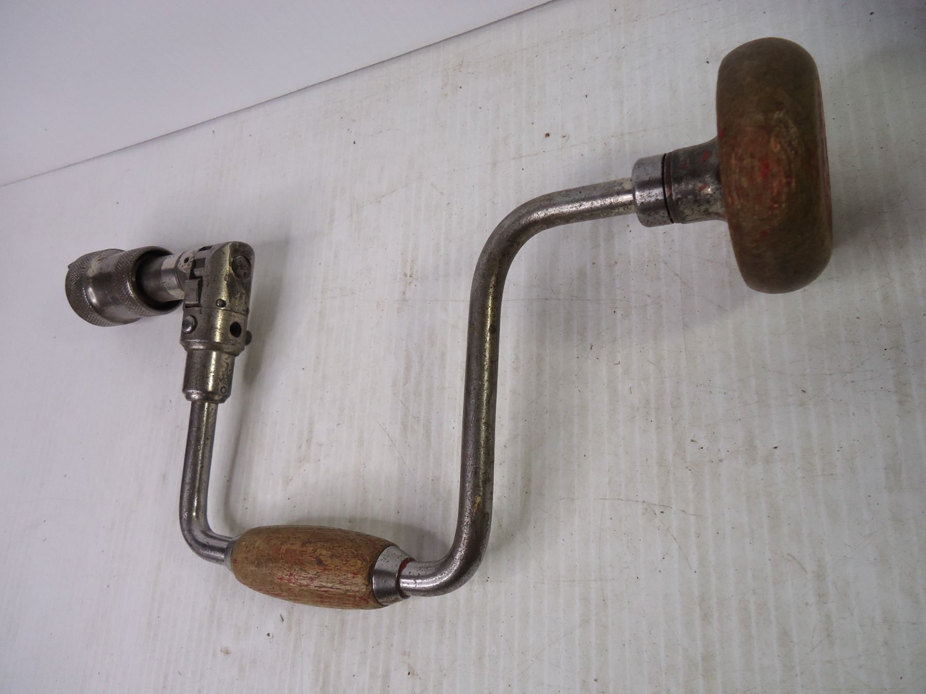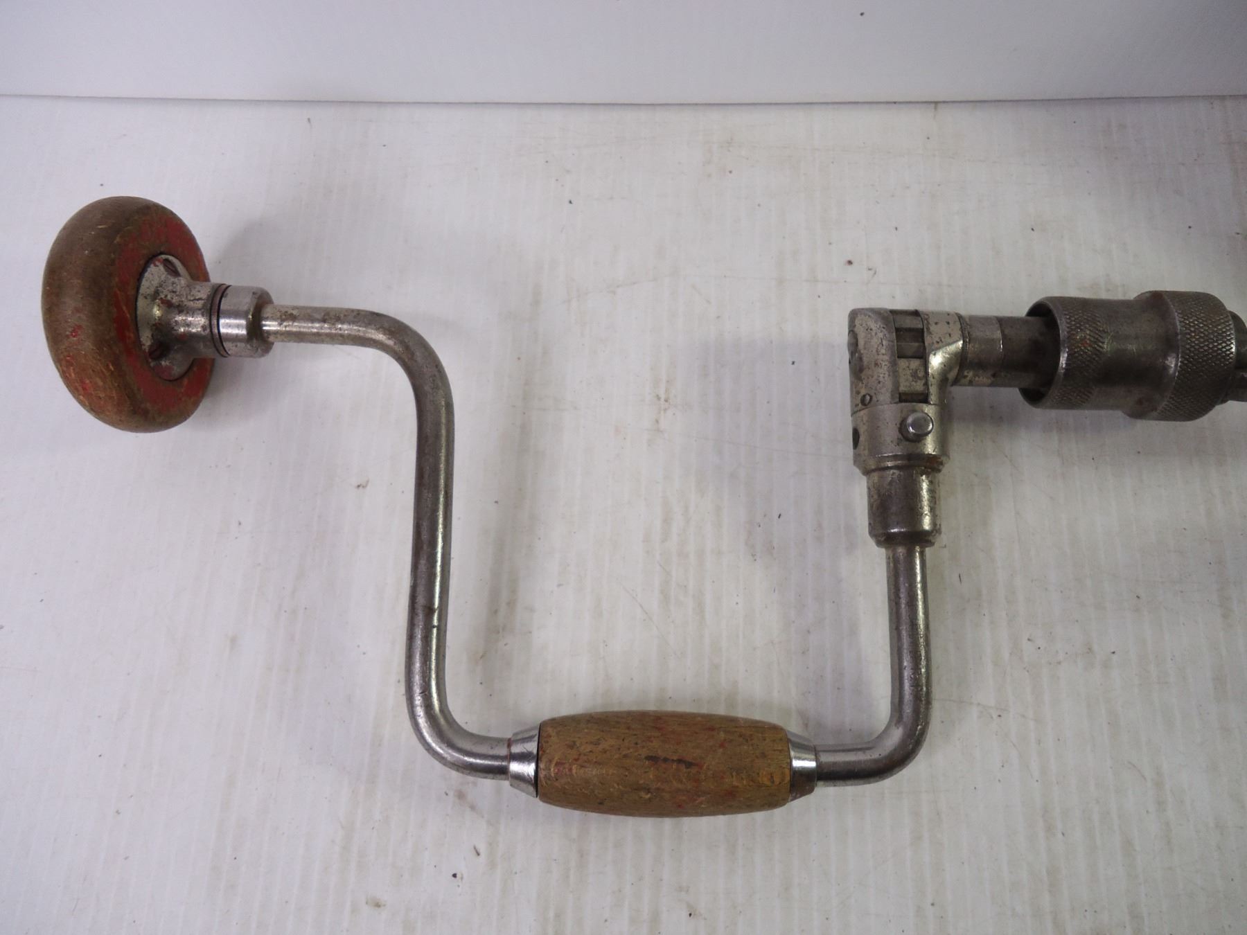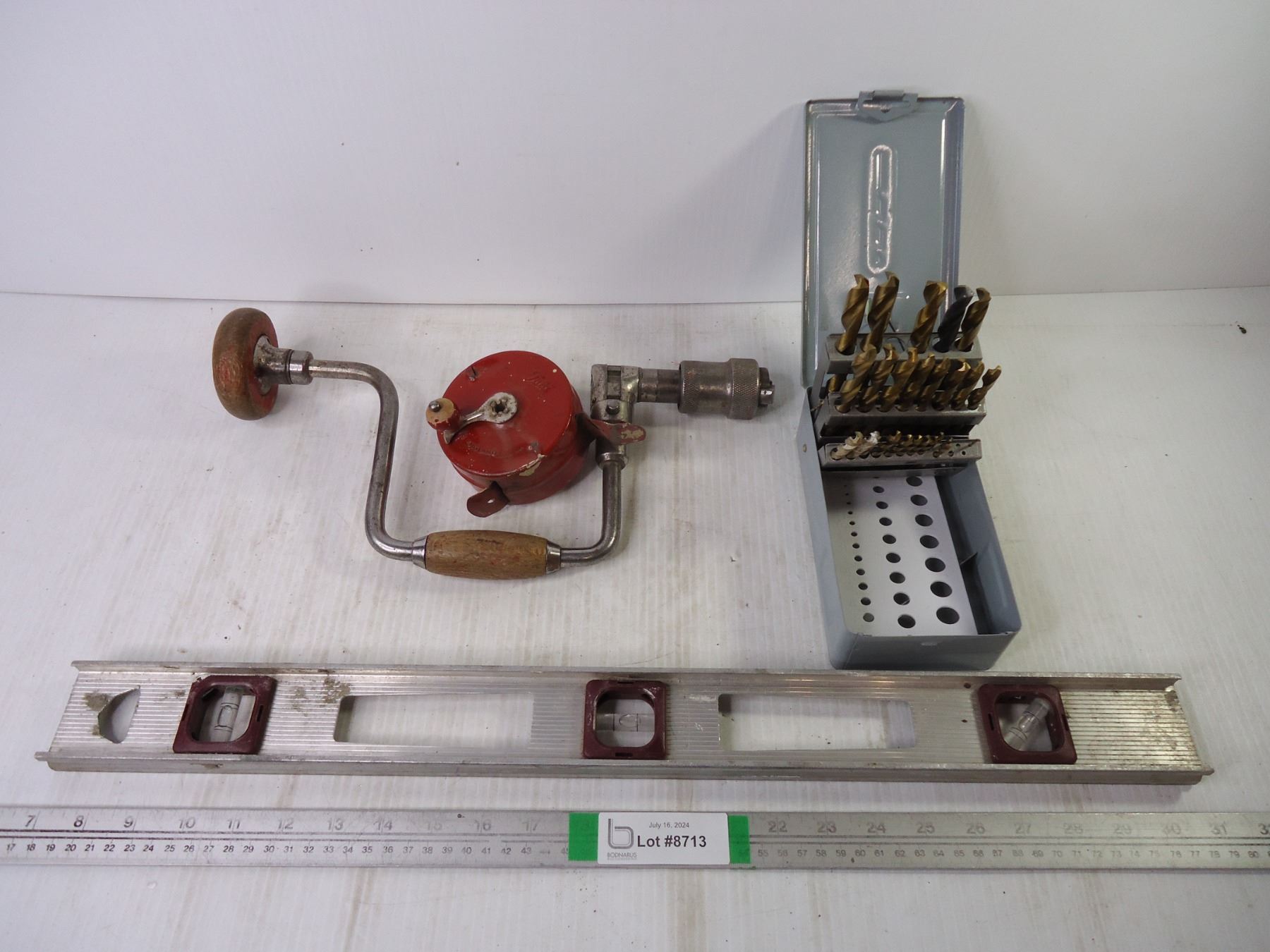 Vintage Cloth Tape Measure, Level, Vintage Hand Drill and Coated Drill Bit Set (a few missing)