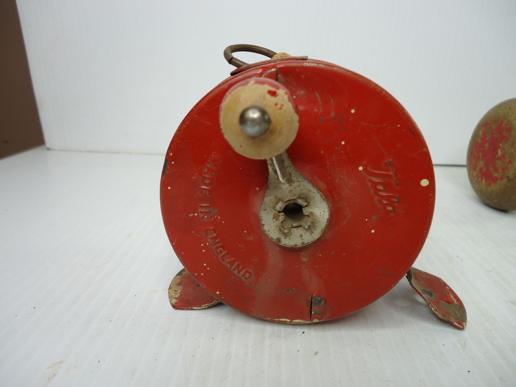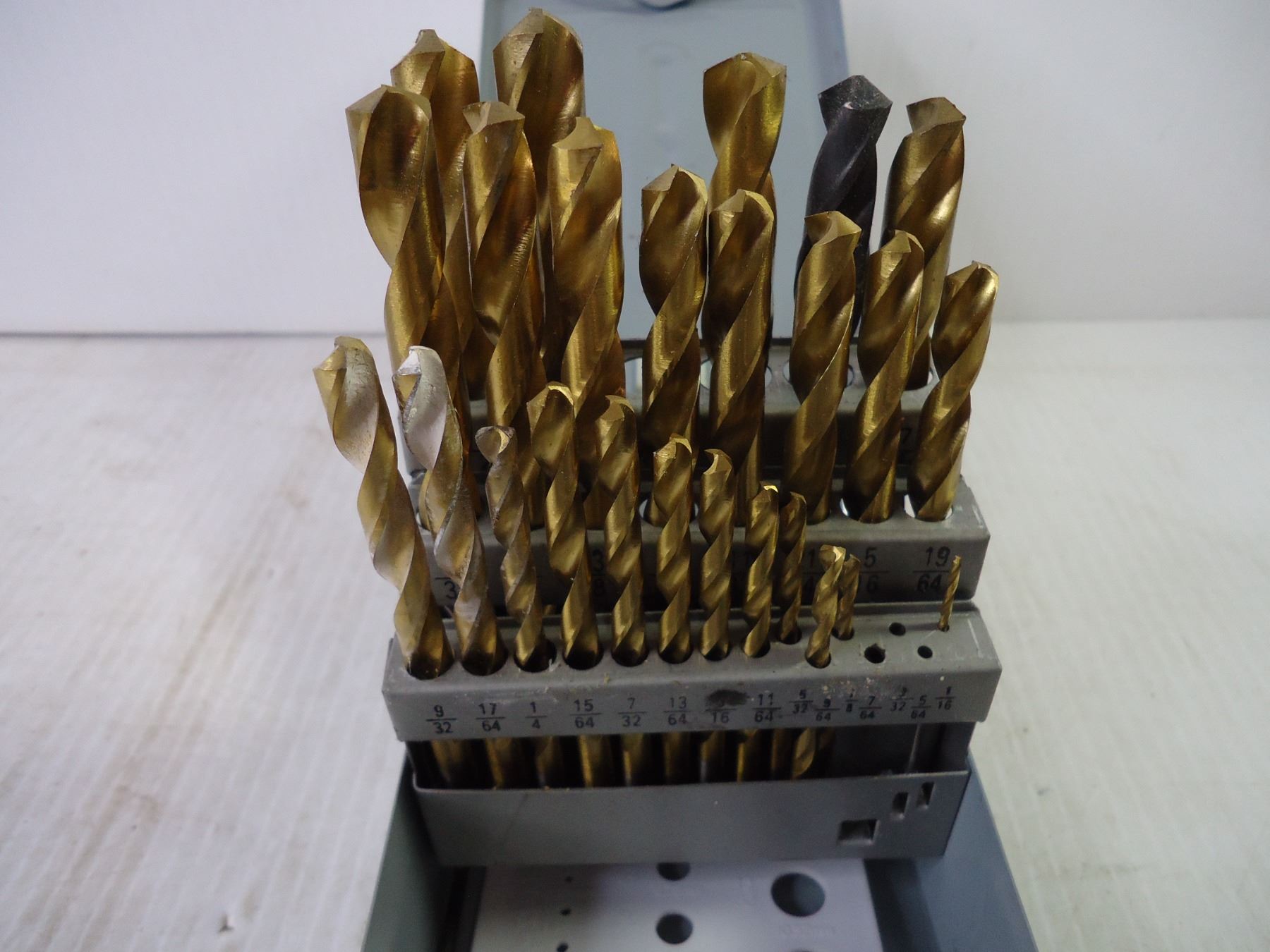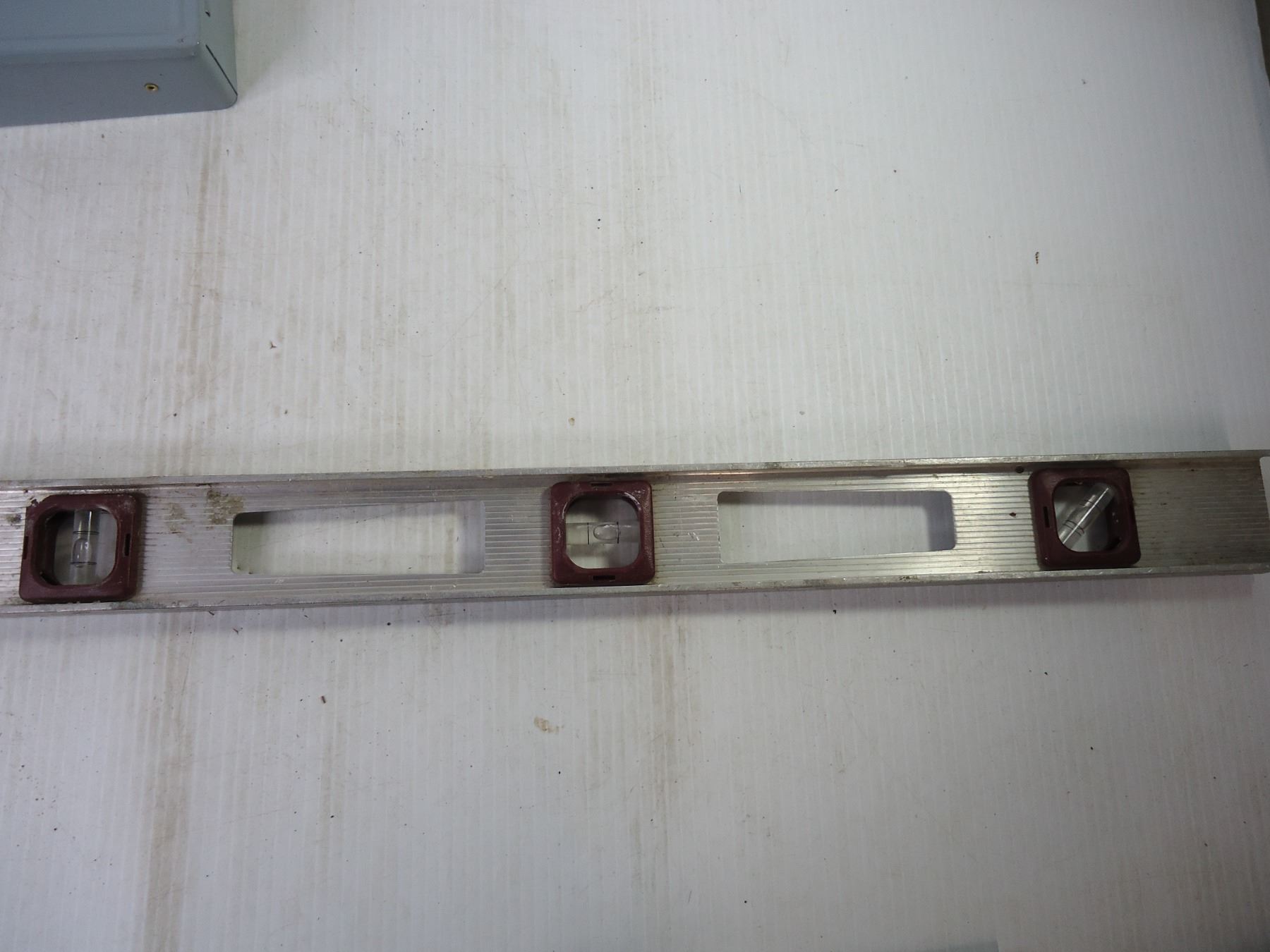 Vintage Cloth Tape Measure, Level, Vintage Hand Drill and Coated Drill Bit Set (a few missing)