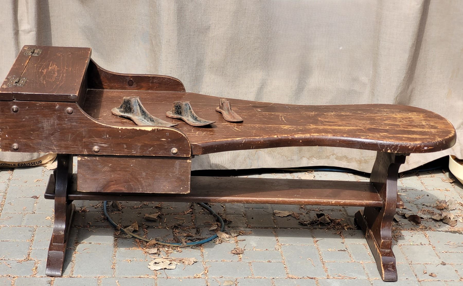 Vintage Cobbler's Bench with slide through drawer, storage & shoe moulds.