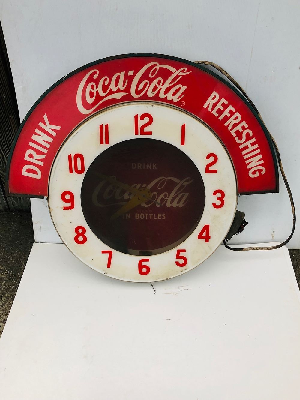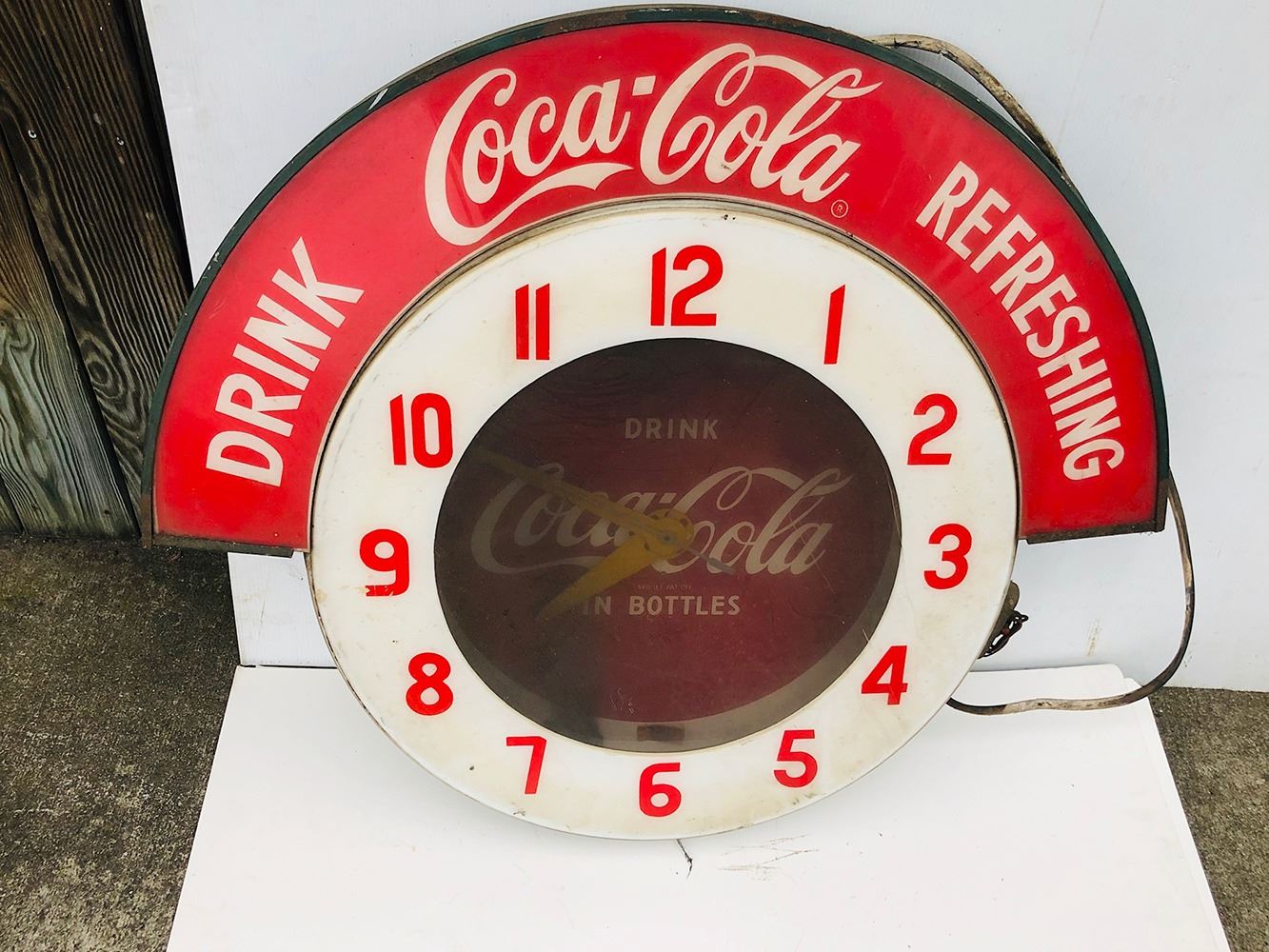 Vintage Coca Cola Clock, Drink Coca Cola Refreshing on top banner, Drink Coca-Cola in Bottles on face, white dial with red numbers.