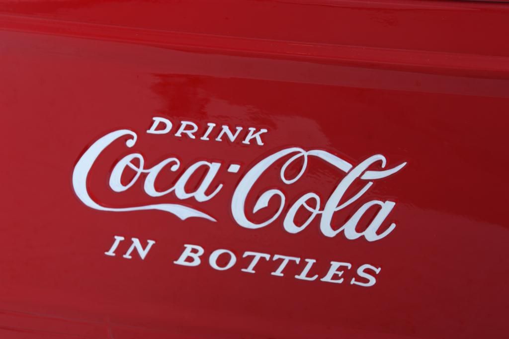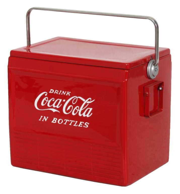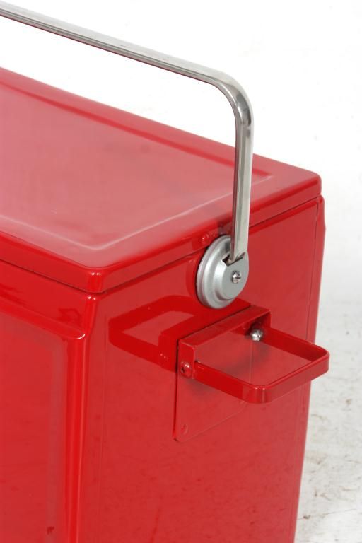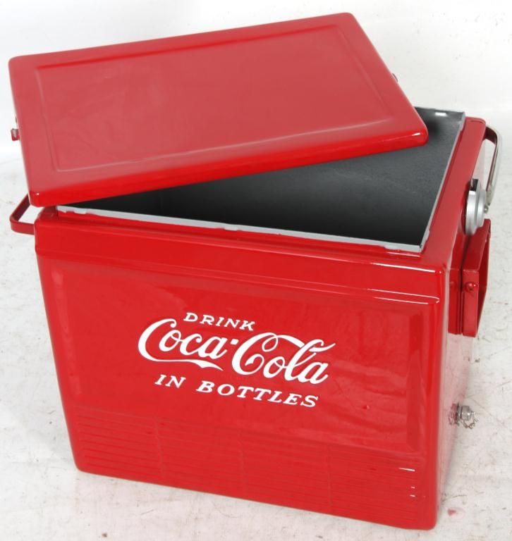 Vintage Coca Cola Cooler. Beautifully restored in red paint with raised white lettering that reads "Drink Coca-Cola, In Bottles", has a removable flat top and handles on the sides. In very good condition with no scratches or losses. 16.5 in. high x 20 in. wide x 14 in. deep.