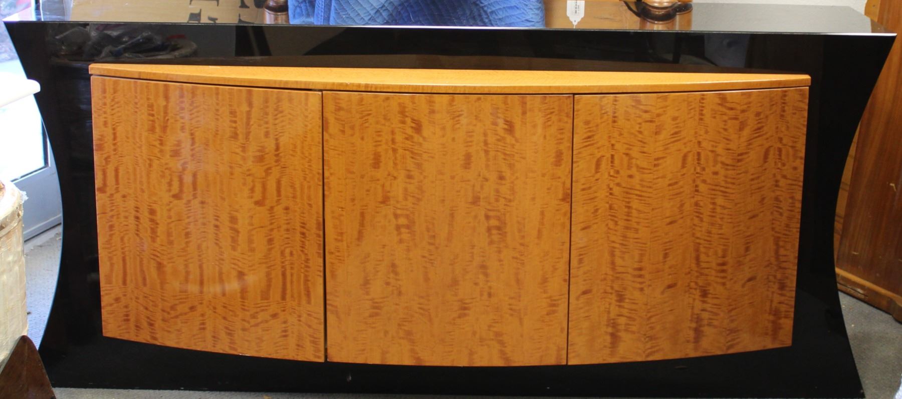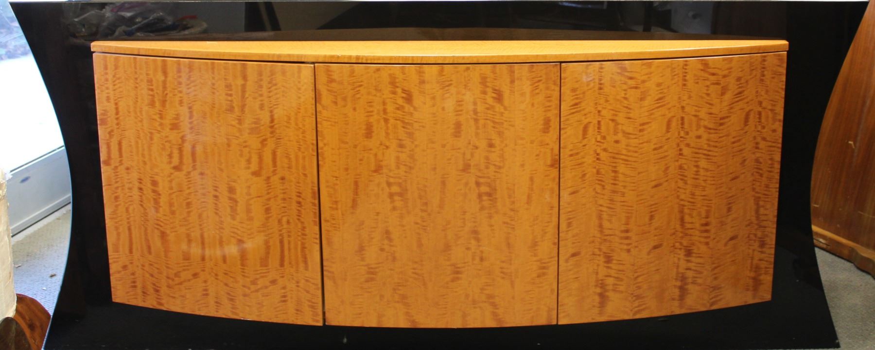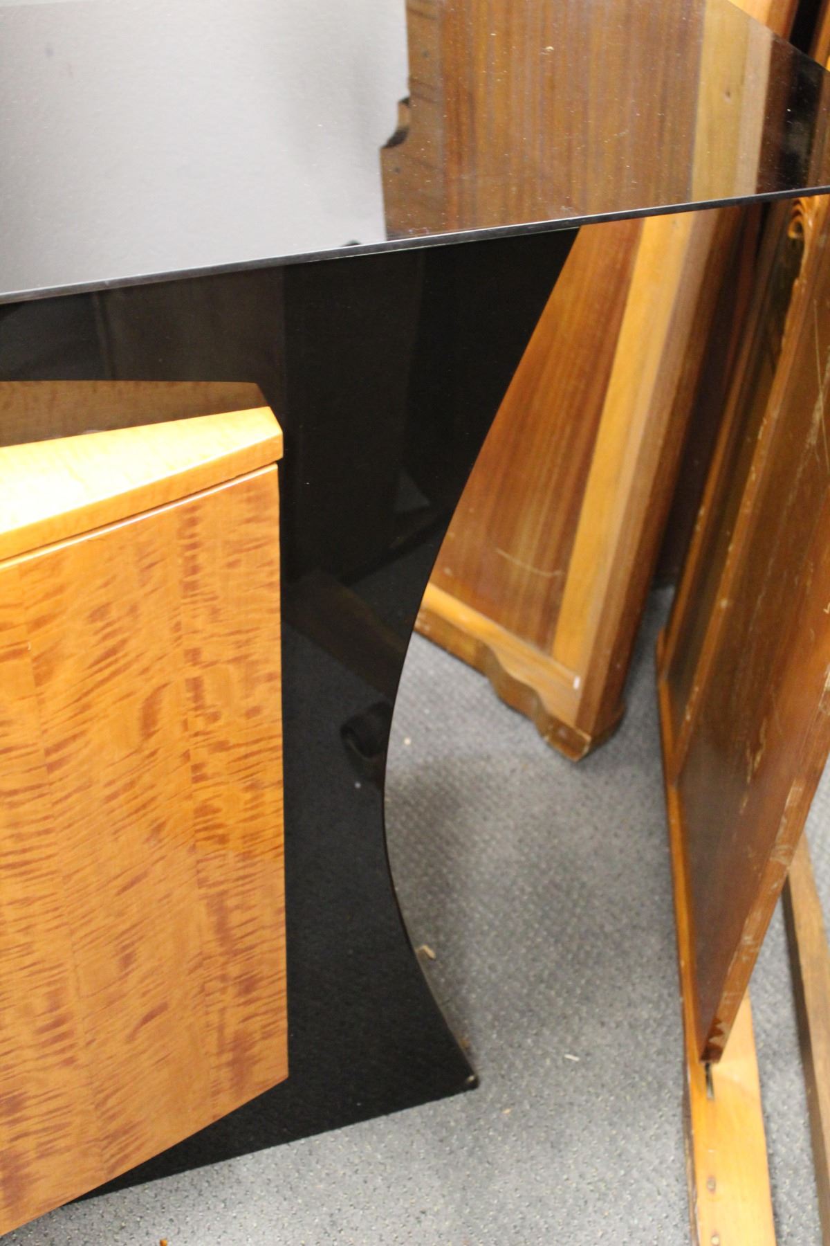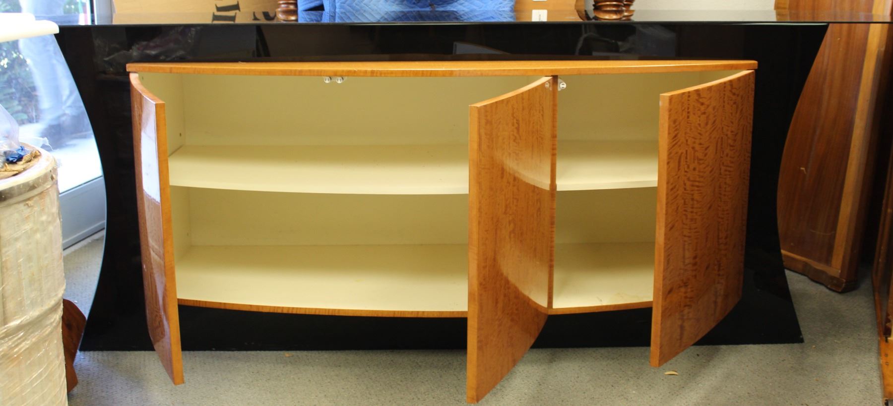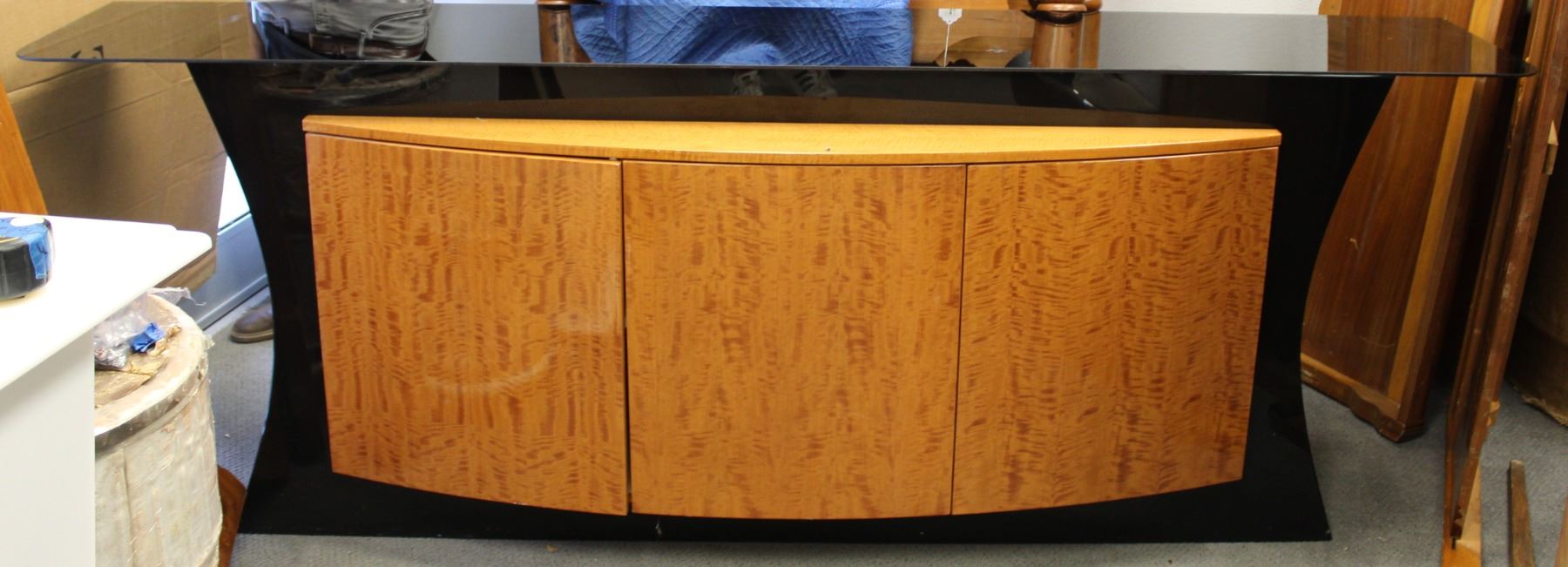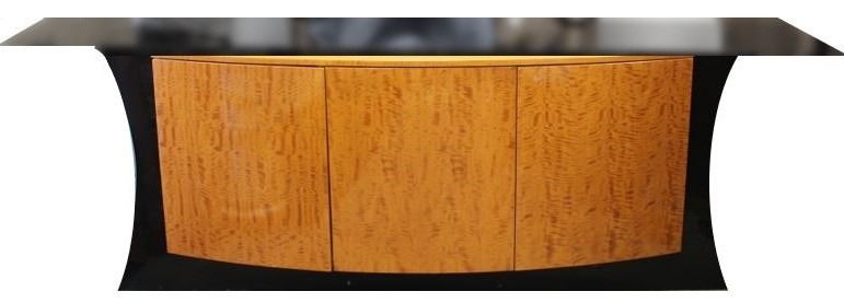 Art Deco style bar with wood veneer, shelved interior cabinets, and glass top.