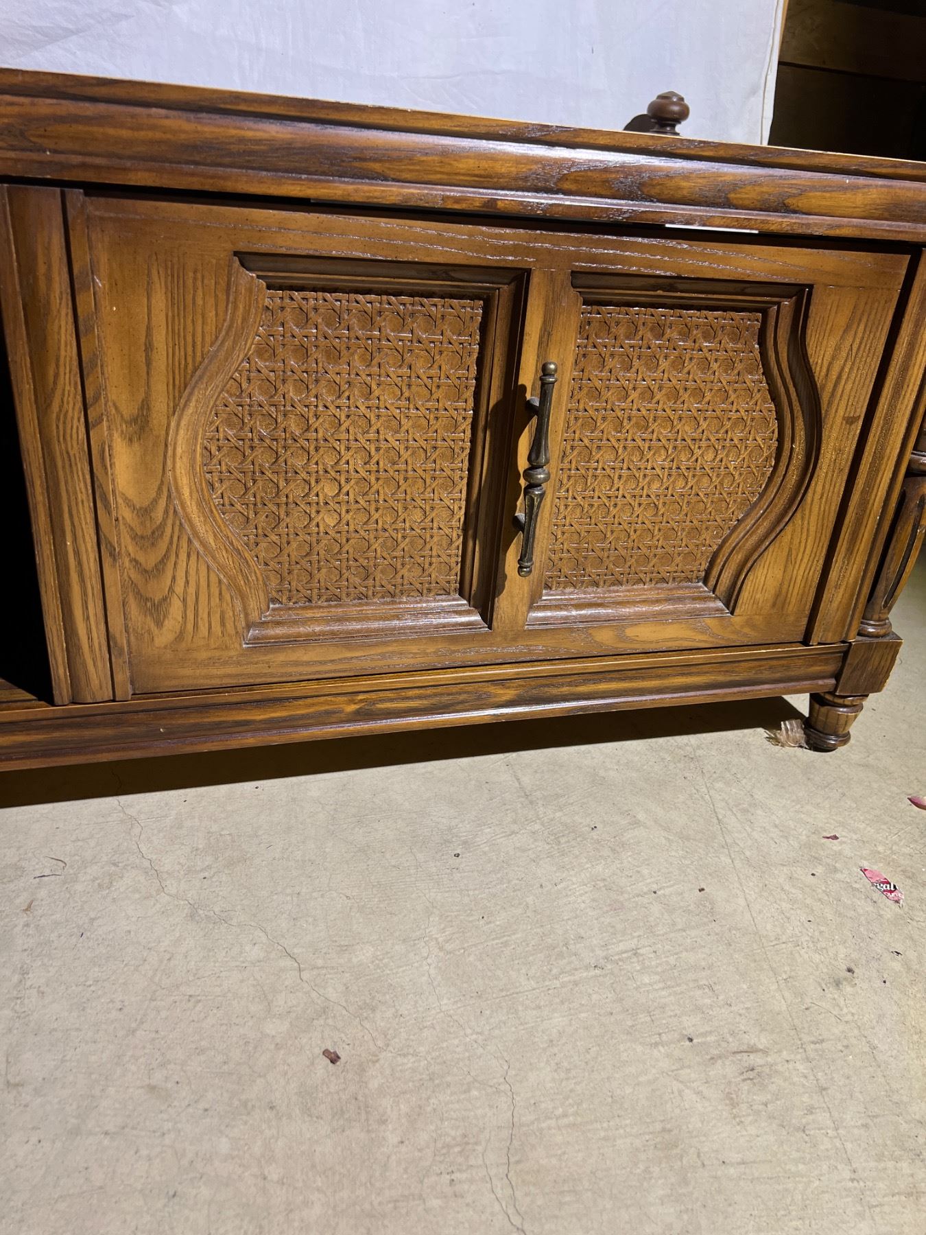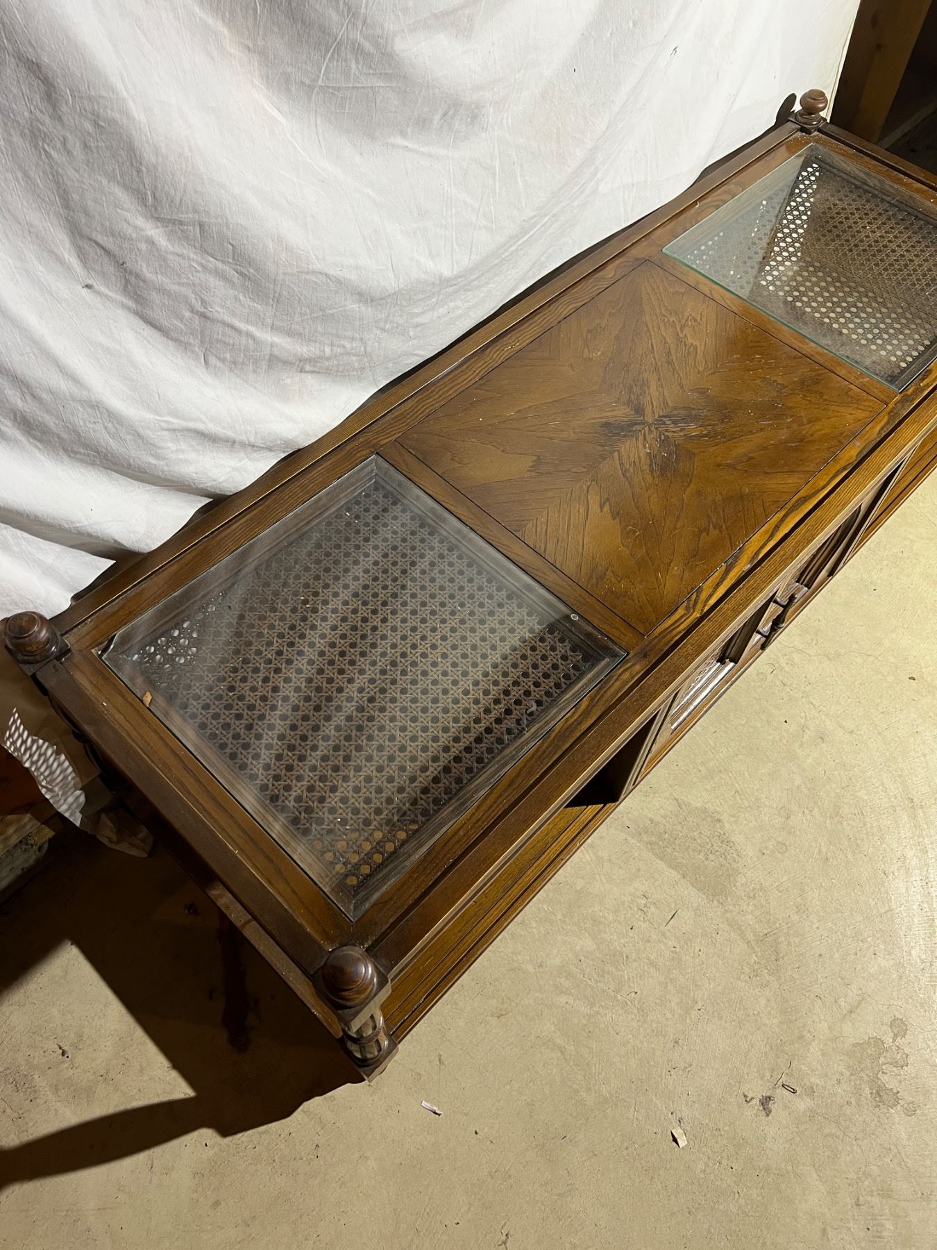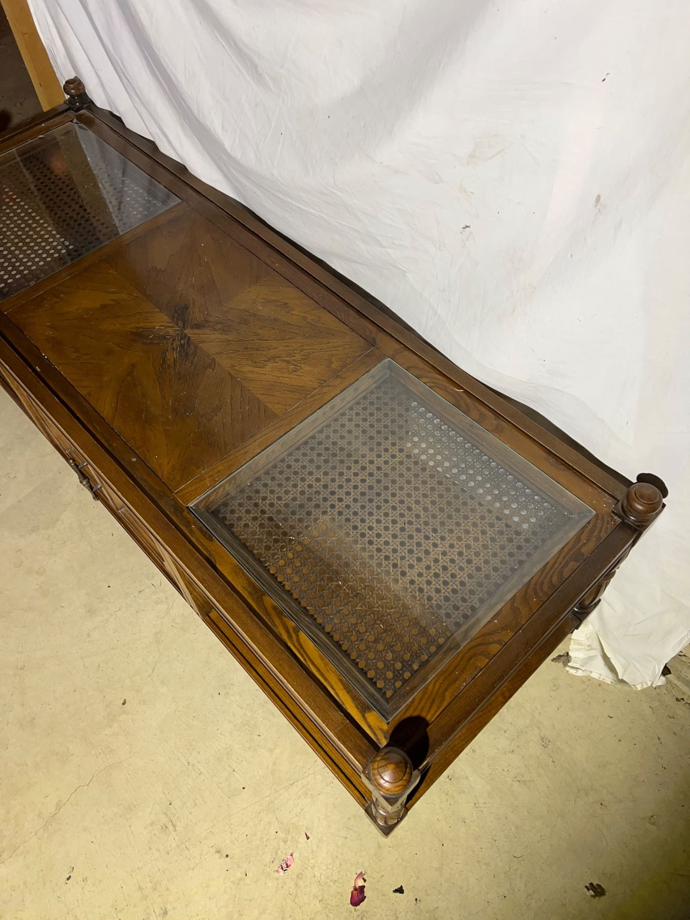 Measures 18" tall by 60" wide and 21" deep. Broken part of glass and fading to wood on top.