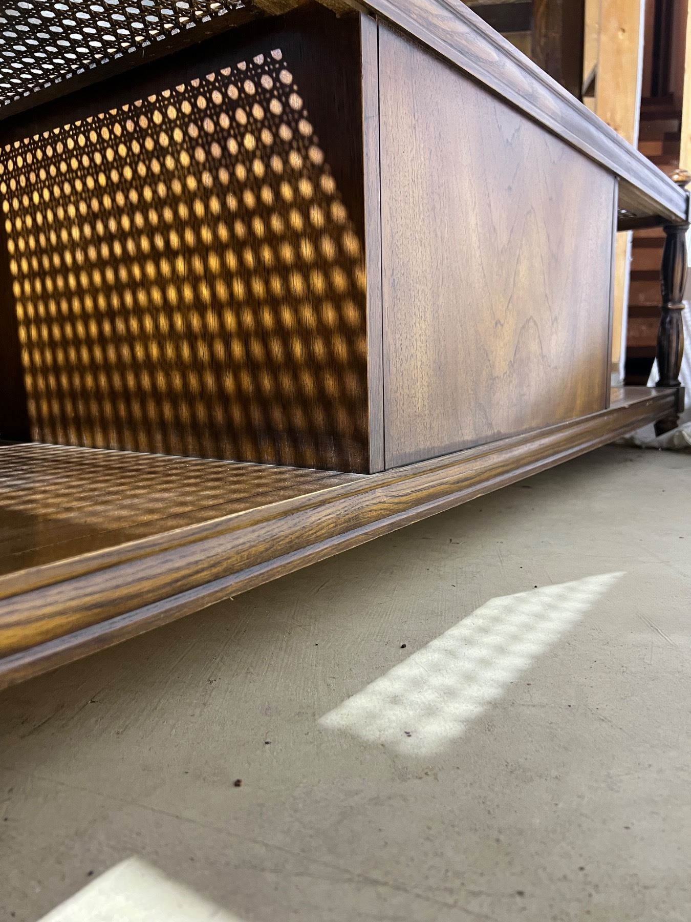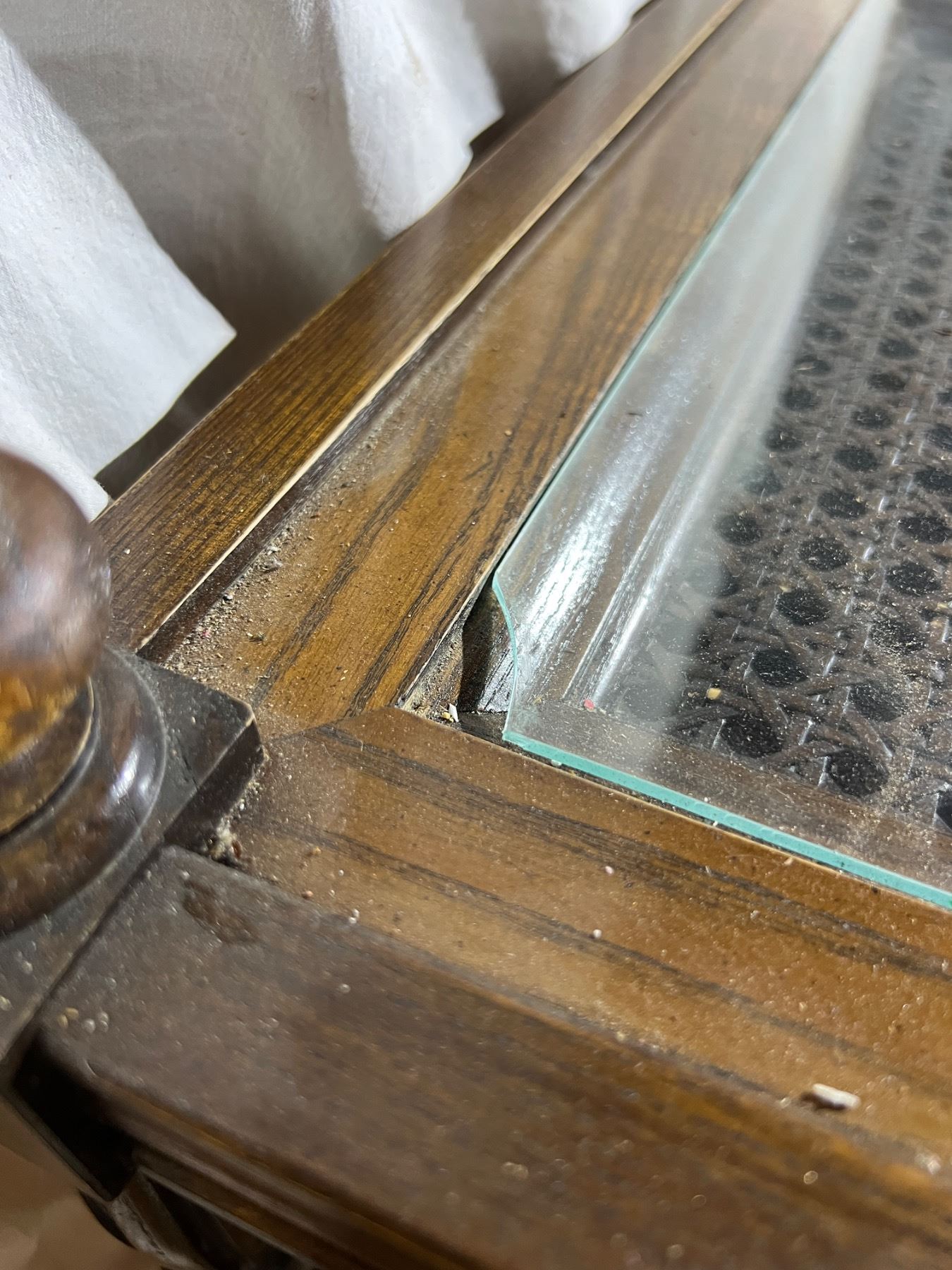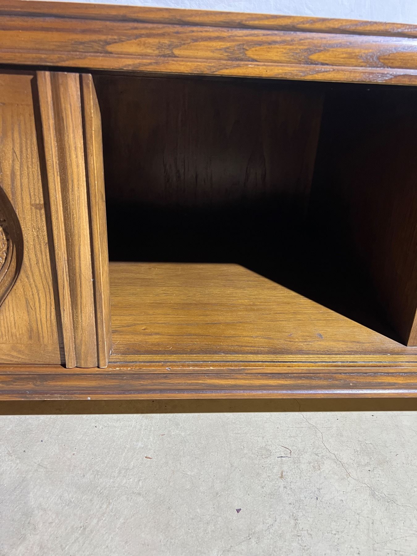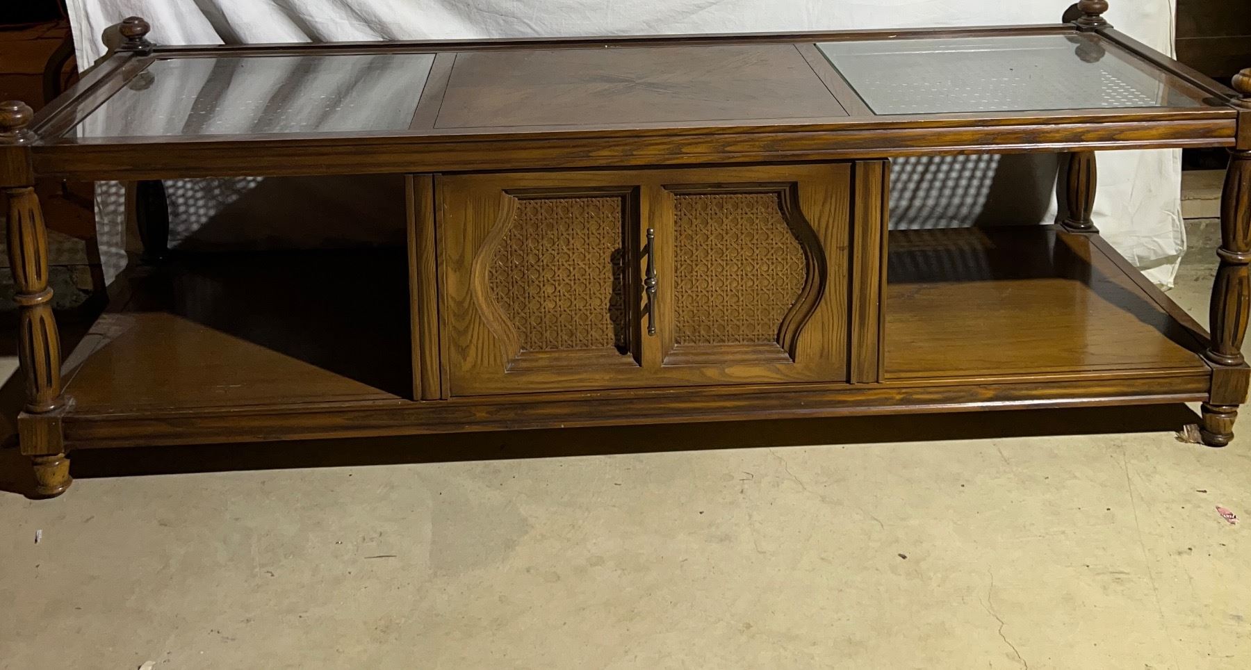 Measures 18" tall by 60" wide and 21" deep. Broken part of glass and fading to wood on top.
